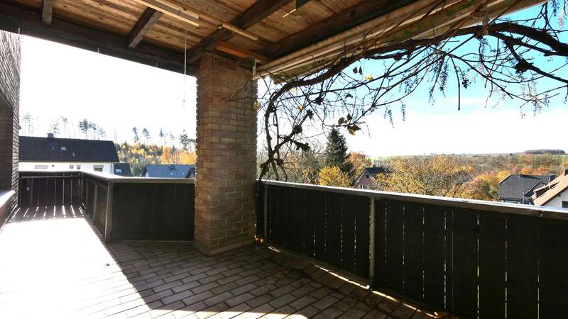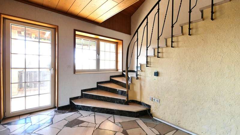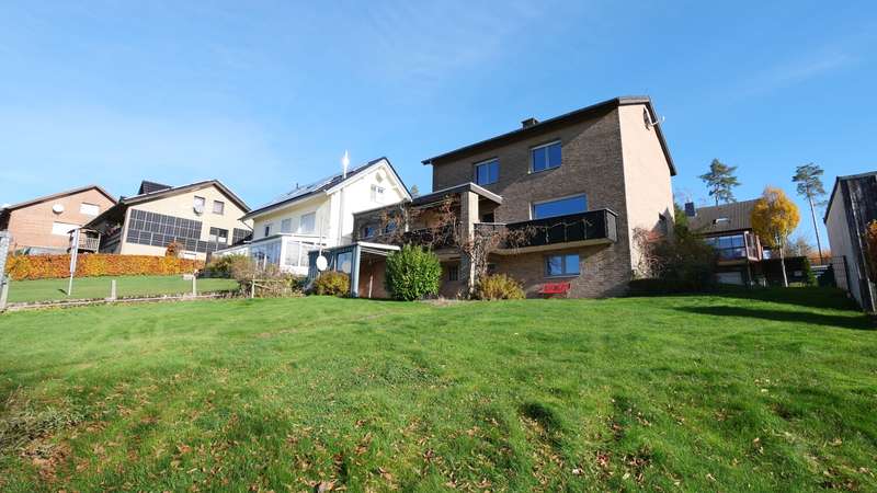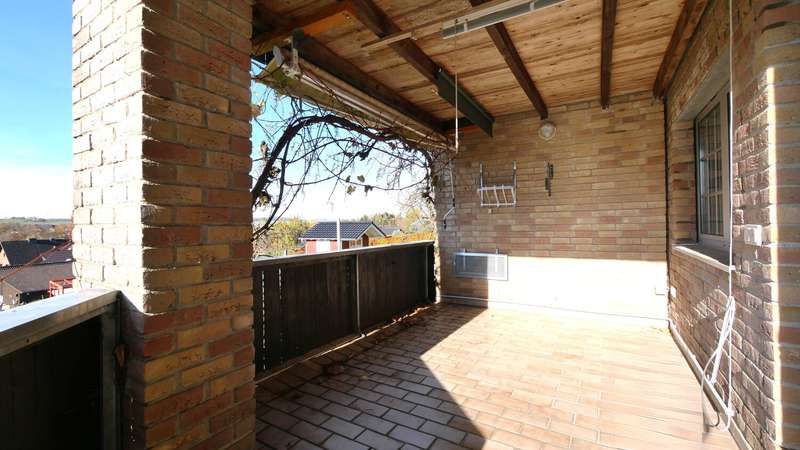 This well-kept detached house with a great room layout and large garden is situated on a plot of approx. 712 m². Through the front door you enter the cozy hallway, from which you have access to the guest WC, kitchen and living room. The beautiful dining area is located between the living room and kitchen. There is also a small pantry off the kitchen. The checkroom is again integrated into the large hallway. From the hallway, you can also access the impressive west-facing balcony with a wonderful view. (Due to the slight slope, the garden is at basement level). From the living room you also have a great view over the village and the countryside. You can reach the upper floor via the wide, solid staircase. This has three bedrooms and a slightly smaller room, which can be used as an office, for example. There is also a small balcony on this level. This is located above the entrance to the house and also offers a view over the village. The cellar extends below the garage. The spacious laundry room is at ground level overlooking the garden. From the basement hallway, you enter the covered terrace and the large south and west-facing garden. There is also a tool shed right next to the house. Building fabric: According to the construction file, the exterior walls were made of 30 cm thick sand-lime brick. In addition, interior thermal insulation was already installed on the ground and upper floors in the year of construction. The property was then additionally clinkered in 1989. Around 2019, almost all windows were replaced with modern triple glazing. Floor plan and photo note: The floor plans and photos with furnishings were generated using AI and are not necessarily true to scale. Please plan the furnishing options yourself during a viewing on site!