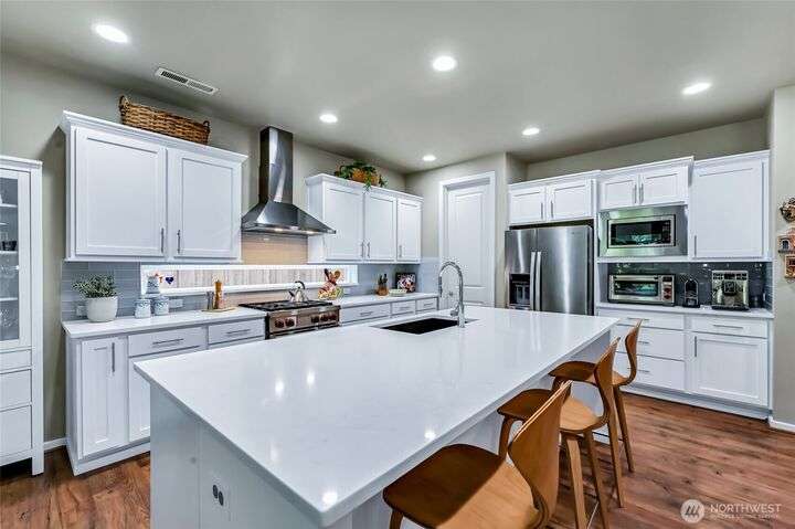 Breathtaking Home In Wonderful Neighborhood! Pristinely maintained 5-bedroom 4-bathroom abode. Glamorous polished hard surfaced floors greet at the front door & continue through the 1st floor. Enormous Great Room of living/dining, gas fireplace, handles your largest of furniture. Chef sized/appointed kitchen offers superior appliances like Wolf-Gas-Range. Massive Island great for informal dining. Main floor den/bedroom has en-suite bath. Primary suite is king-sized, has luxurious 5-piece bth, big walk-in closet/custom shelving. 2-guest rooms share Jack-N-Jill bath. Large 5th bedroom has full bath. Huge open bonus or 6th bedroom? Entertainment covered patio, fully landscaped/fenced grounds, fruit trees, 3-car garage/gas heat/Air Conditioning