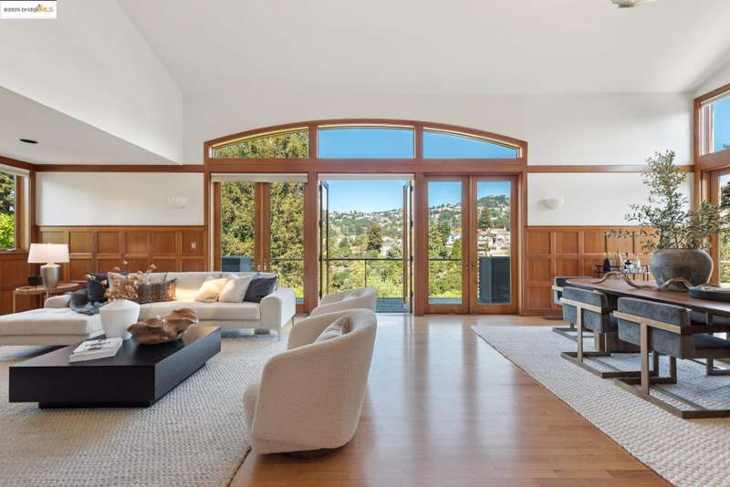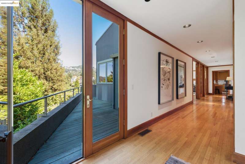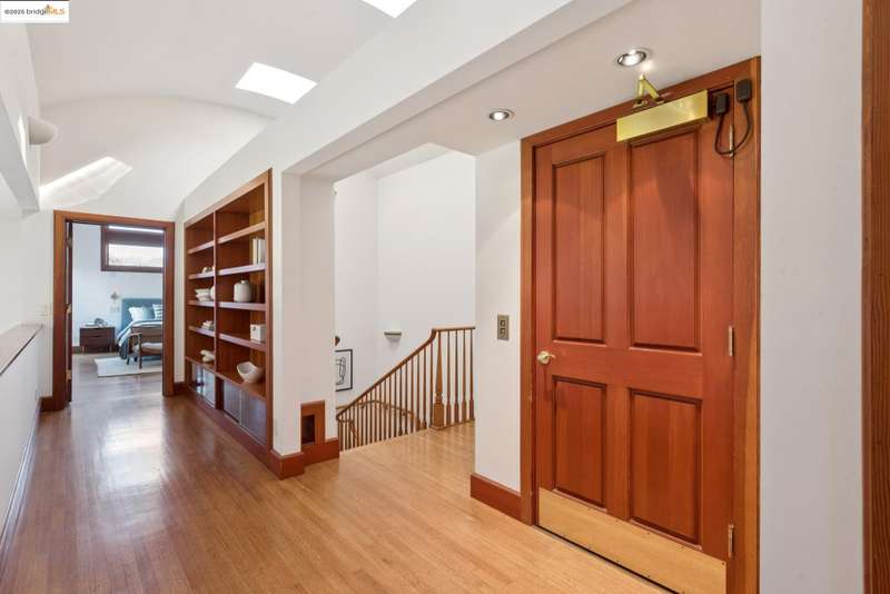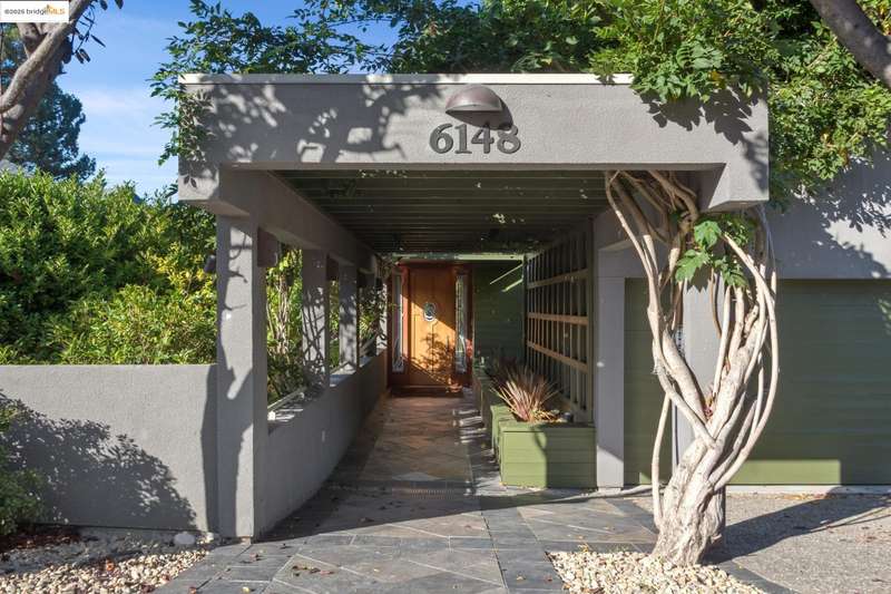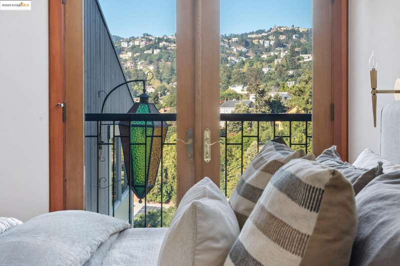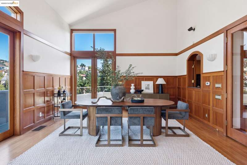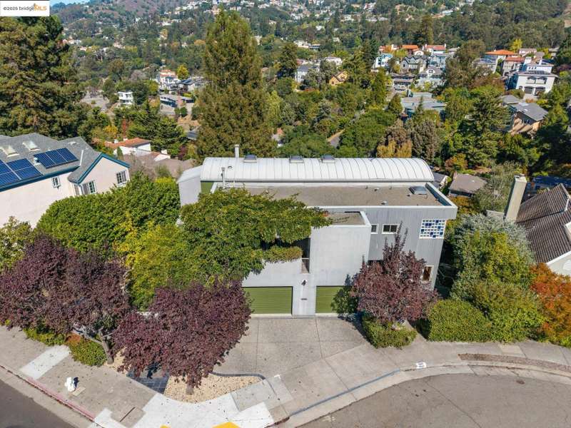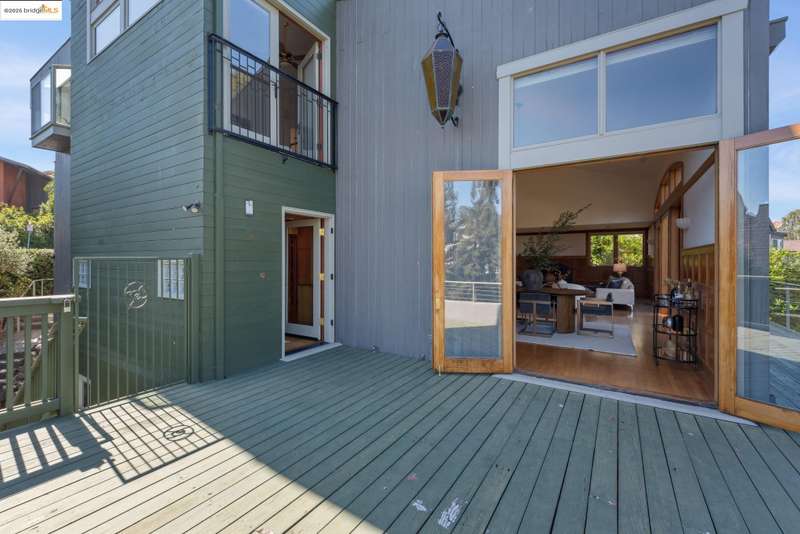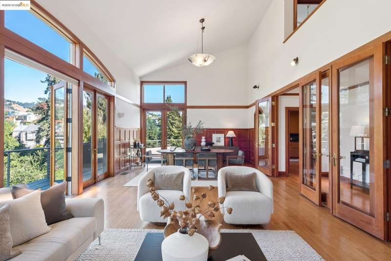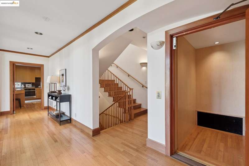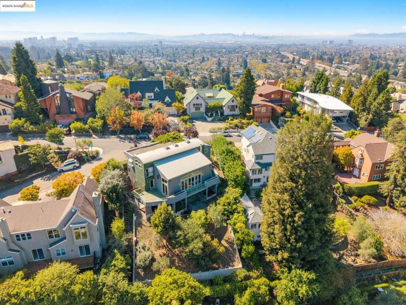 Dramatic modern home, defined by its bold geometry and contrasting wood and stucco facade. An elevator navigates between its three levels. A striking grand living-dining room spans the length of the home, and opens to a long back deck and vistas across the hills. Large kitchen with electric range and wet bar. A versatile den and one converted garage bay are adjacent for home office or studio. Upstairs a long mezzanine looks down on the main public rooms, leading to the primary suite with private office and walk-in closet. The primary bath offers curbless roll-in shower. On this level are a second bedroom with balcony, full bath, laundry room and storage. The lower floor features a family room with access to the lower patio and backyard. A bedroom and bath are configured for separated living with a private entrance. This adaptable, multi-level layout and abundant indoor-outdoor space offer enormous flexibility in Oakland's premier neighborhood.