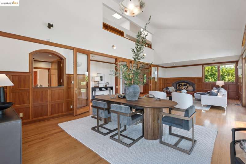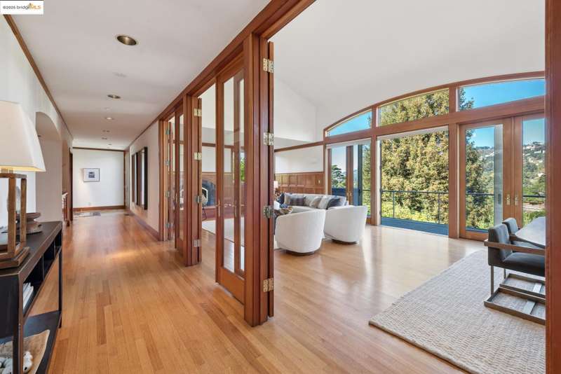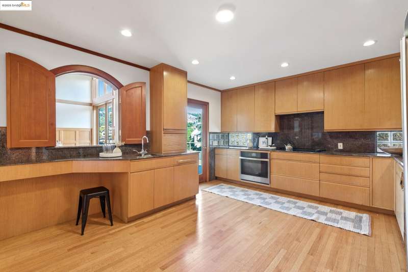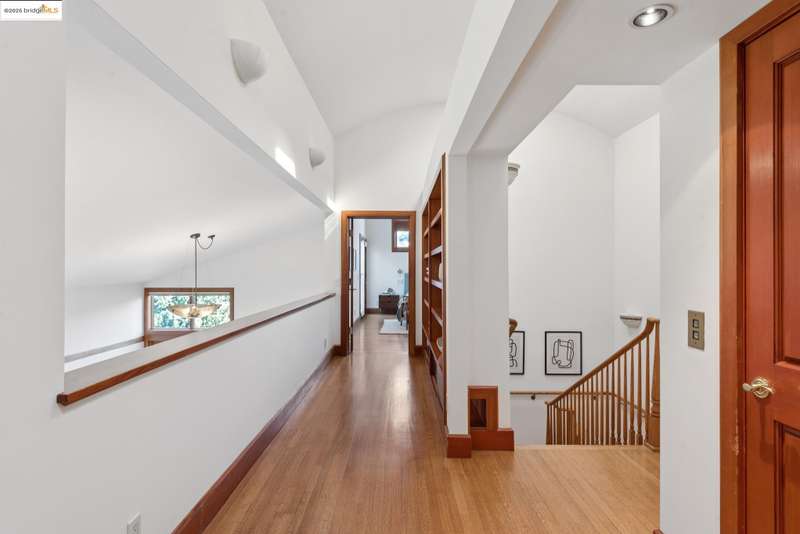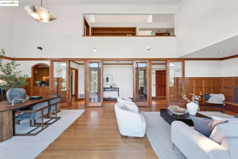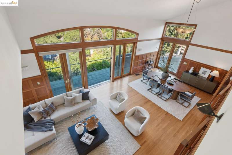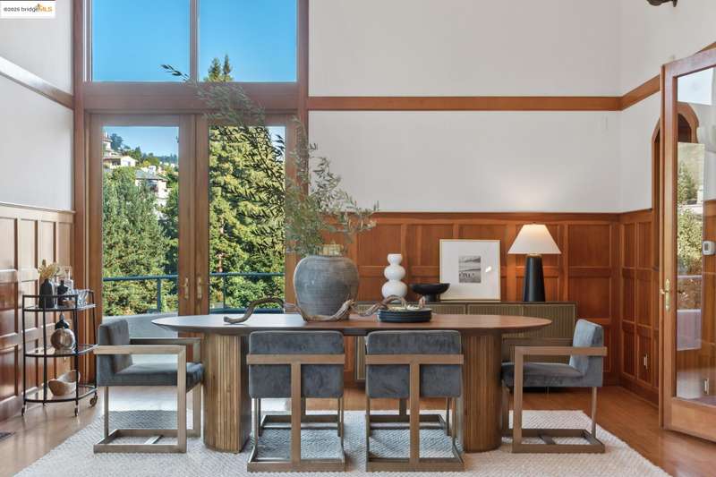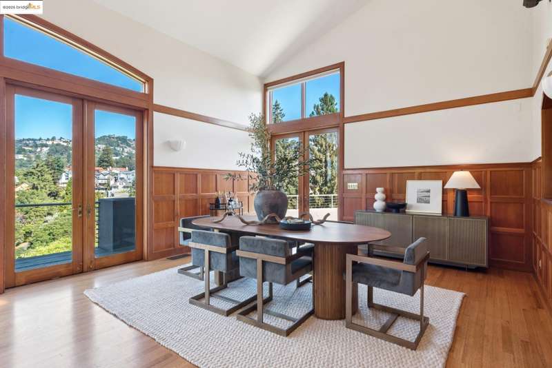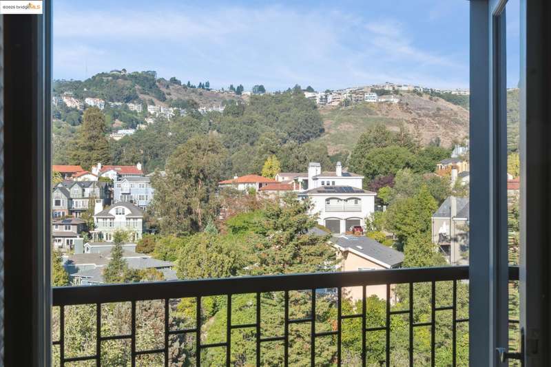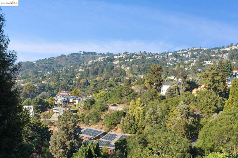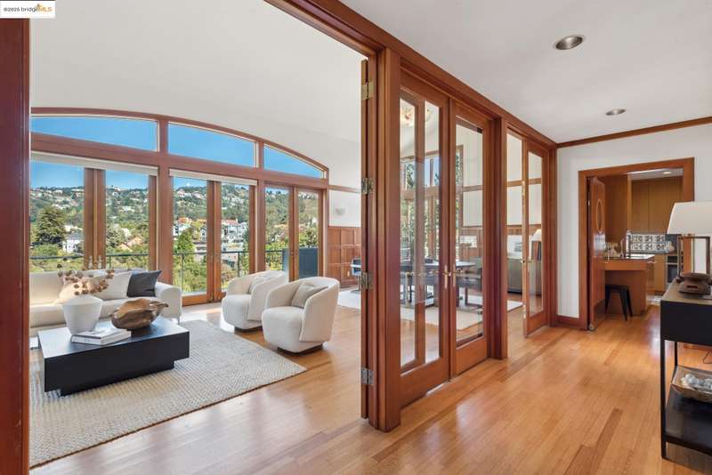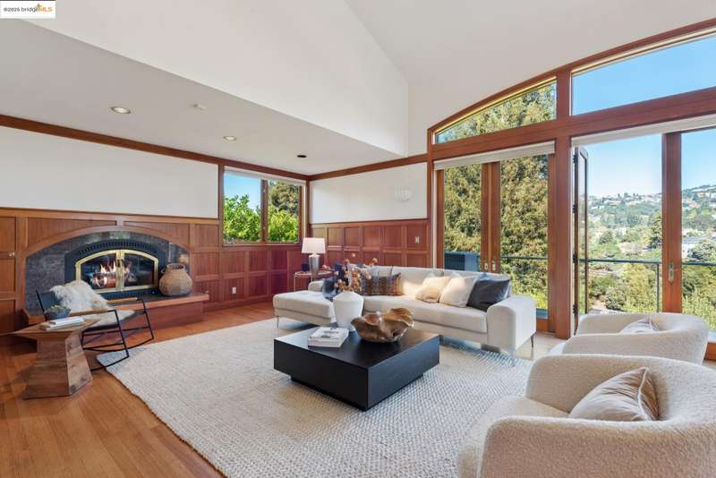 Dramatic modern home, defined by its bold geometry and contrasting wood and stucco facade. An elevator navigates between its three levels. A striking grand living-dining room spans the length of the home, and opens to a long back deck and vistas across the hills. Large kitchen with electric range and wet bar. A versatile den and one converted garage bay are adjacent for home office or studio. Upstairs a long mezzanine looks down on the main public rooms, leading to the primary suite with private office and walk-in closet. The primary bath offers curbless roll-in shower. On this level are a second bedroom with balcony, full bath, laundry room and storage. The lower floor features a family room with access to the lower patio and backyard. A bedroom and bath are configured for separated living with a private entrance. This adaptable, multi-level layout and abundant indoor-outdoor space offer enormous flexibility in Oakland's premier neighborhood.