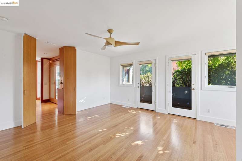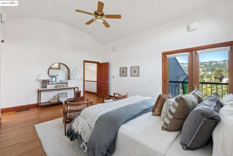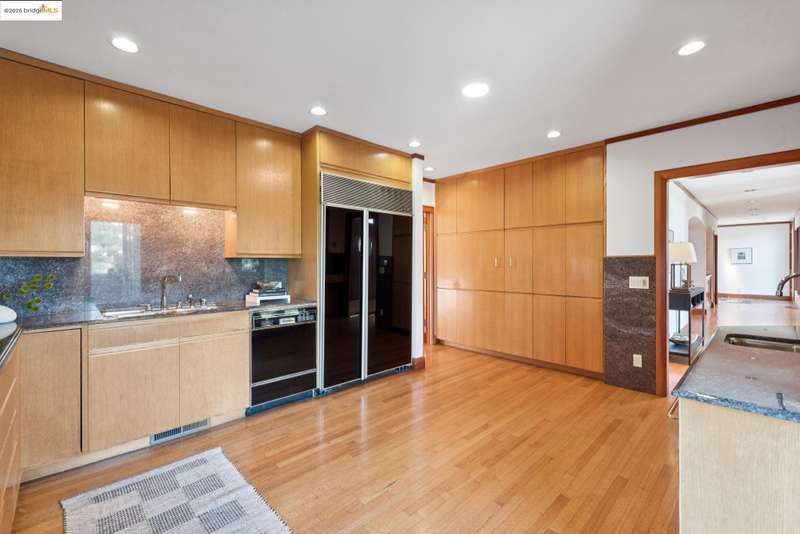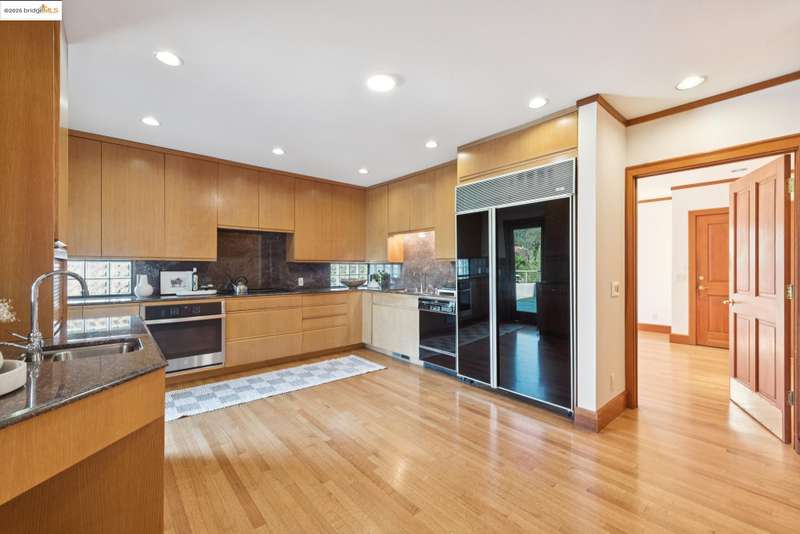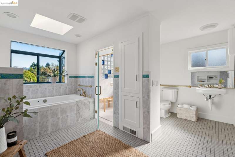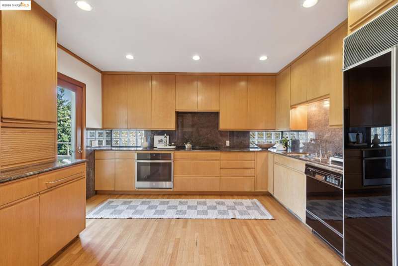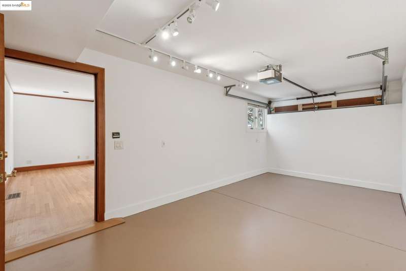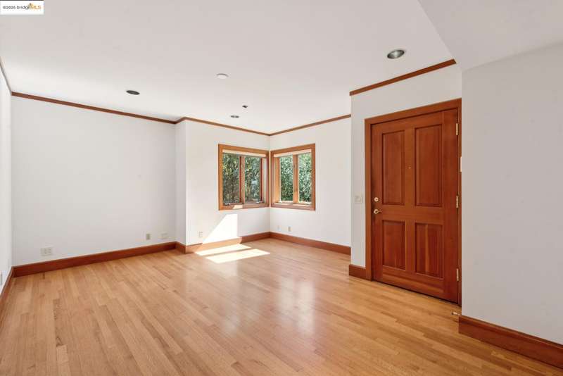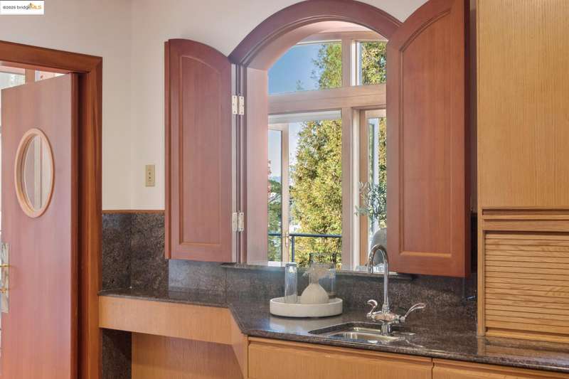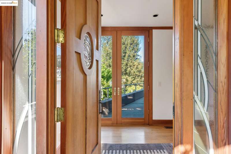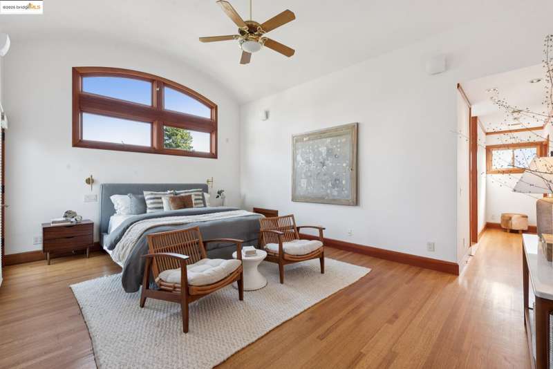 Dramatic modern home, defined by its bold geometry and contrasting wood and stucco facade. An elevator navigates between its three levels. A striking grand living-dining room spans the length of the home, and opens to a long back deck and vistas across the hills. Large kitchen with electric range and wet bar. A versatile den and one converted garage bay are adjacent for home office or studio. Upstairs a long mezzanine looks down on the main public rooms, leading to the primary suite with private office and walk-in closet. The primary bath offers curbless roll-in shower. On this level are a second bedroom with balcony, full bath, laundry room and storage. The lower floor features a family room with access to the lower patio and backyard. A bedroom and bath are configured for separated living with a private entrance. This adaptable, multi-level layout and abundant indoor-outdoor space offer enormous flexibility in Oakland's premier neighborhood.