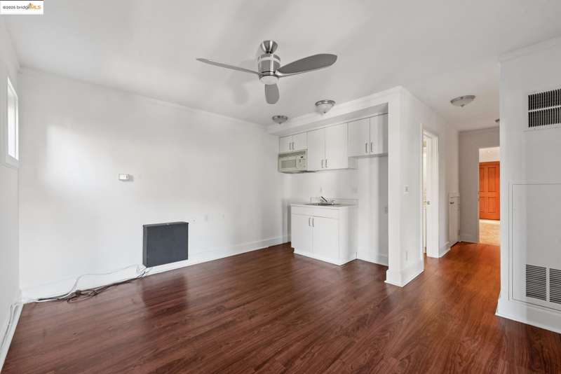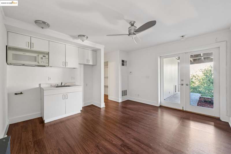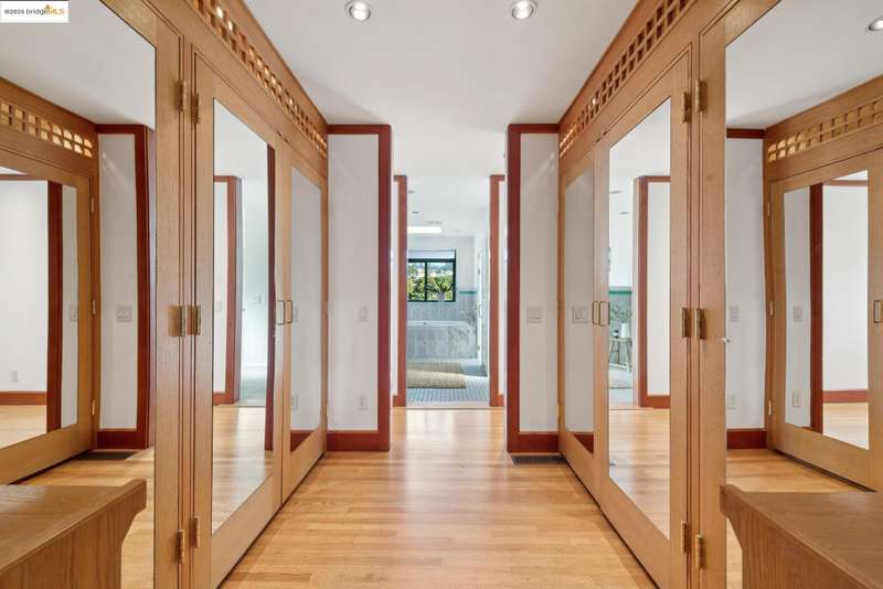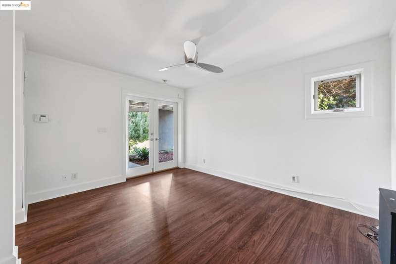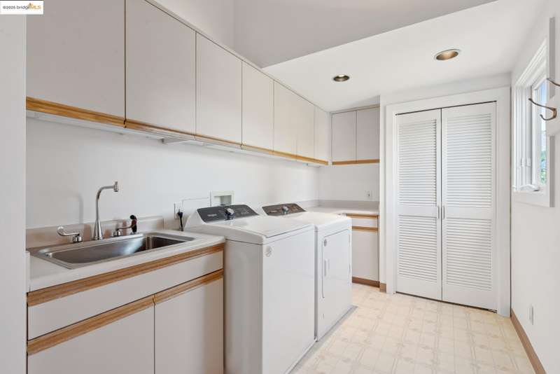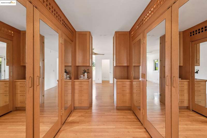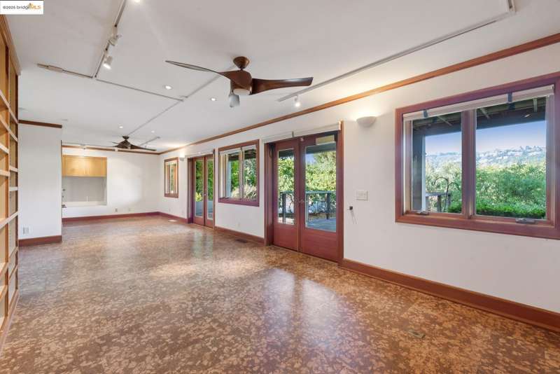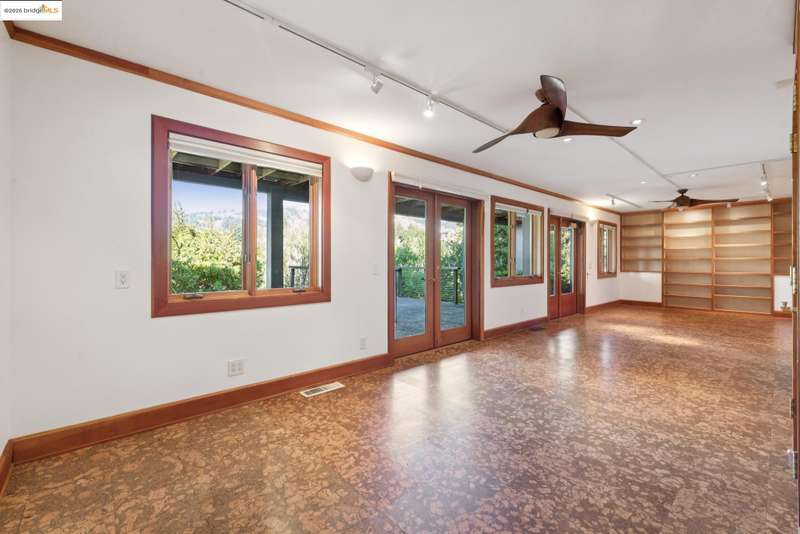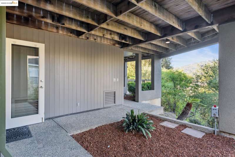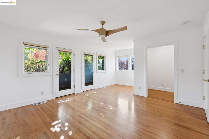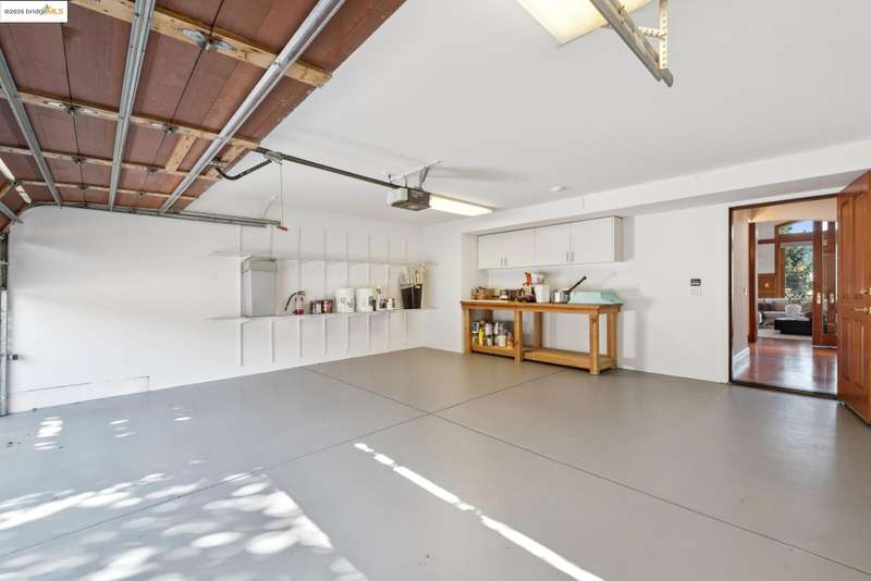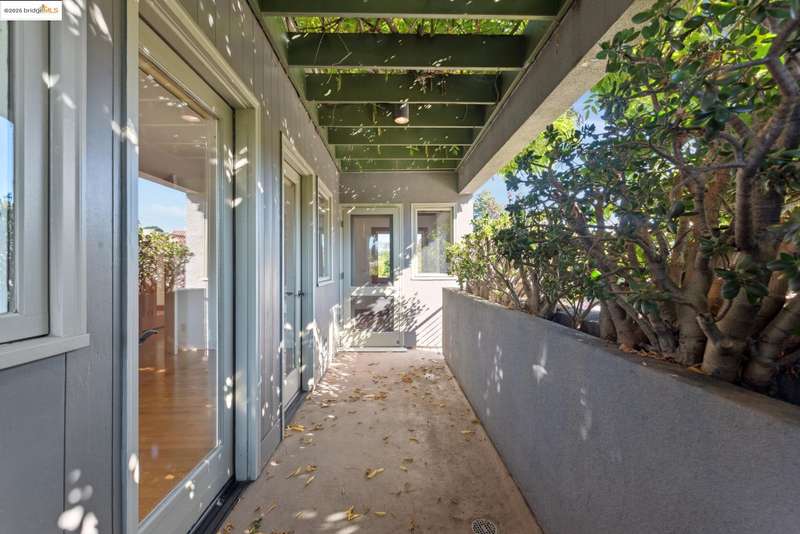Dramatic modern home, defined by its bold geometry and contrasting wood and stucco facade. An elevator navigates between its three levels. A striking grand living-dining room spans the length of the home, and opens to a long back deck and vistas across the hills. Large kitchen with electric range and wet bar. A versatile den and one converted garage bay are adjacent for home office or studio. Upstairs a long mezzanine looks down on the main public rooms, leading to the primary suite with private office and walk-in closet. The primary bath offers curbless roll-in shower. On this level are a second bedroom with balcony, full bath, laundry room and storage. The lower floor features a family room with access to the lower patio and backyard. A bedroom and bath are configured for separated living with a private entrance. This adaptable, multi-level layout and abundant indoor-outdoor space offer enormous flexibility in Oakland's premier neighborhood.