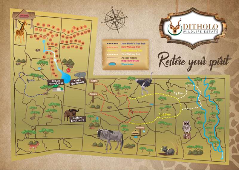 Welcome to Ditholo Wildlife Estate, nestled harmoniously in the heart of the Bushveld. Located a mere 60 kilometers from Warmbaths/Bela Bela and an easy 2-hour 30-minute drive from Johannesburg, accessing this tranquil paradise is a breeze along mostly well-maintained tar roads. As you venture deeper into the region, the Bushveld reveals its captivating allure, with well-grassed plains adorned by clusters of lush trees and tall shrubs. In winter, the grasses gracefully turn brown or pale, signaling the dry season that encompasses much of Southern Africa. Against the majestic backdrop of the Waterberg Mountains, Ditholo Wildlife Estate unfolds its expansive beauty, offering vast open plains and winding waterways that teem with a diverse array of wildlife. Encompassing an impressive 1,000 hectares, the estate encompasses a rich tapestry of lush scrub veld, woodland, and plains, adorned by an exceptional selection of endemic trees and flora. Exploring the estate is a delight, with excellent quality dirt roads providing easy access to all corners. However, in line with the estate's commitment to non-intrusion, only electric golf carts, registered green game viewer vehicles, pedestrians, and cyclists are permitted to freely explore its wonders. This ensures a harmonious coexistence with the environment and allows you to immerse yourself in the serene ambiance of the bush. Motorized vehicles are reserved for Guided Game Drives, carefully planned to offer guests an exceptional wildlife experience without disturbing the animals' natural behavior or exerting excessive pressure on their habitats. Moreover, rest assured that Ditholo Wildlife Estate is a malaria-free haven, allowing you to revel in the beauty of nature with peace of mind. Here, at Ditholo Wildlife Estate, privacy and tranquility reign supreme, granting you the opportunity to forge a profound connection with the bush and actively engage with Africa's extraordinary wildlife. The estate encompasses 1,000 hectares of unspoiled indigenous African bush, meticulously preserved to ensure sustainability and biodiversity. Immerse yourself in the enchanting waterways, brimming with fish and echoing with the majestic call of the Fish Eagle during their seasonal visits. Discover the allure of the Bushveld at Ditholo Wildlife Estate, where nature's splendor unfolds before you. Embrace privacy, tranquility, and an authentic connection with Africa's wildlife in this unspoiled sanctuary. Let the rhythms of the bush guide your soul and create cherished memories in this captivating haven.