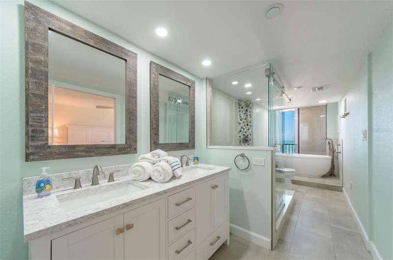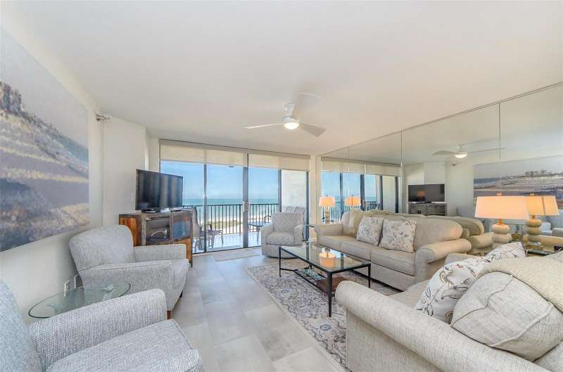 Available Aug - Nov 2025. Booked Jan-May 2026. You will enter this STUNNING, NEWLY REMODELED, BEACHFRONT, GULF FRONT, rental and keep saying WOW over and over! NEW, immaculate, clean and beautiful 2 bedroom / 2 bath (sleeps 7) beachfront rental in the very desirable Lighthouse Towers. The entire condo has just been remodeled with new floors, kitchen, appliances, furniture, doors and windows etc. This gorgeous beachfront 9th floor condo has water views from every window! The expansive windows fill the rooms with natural light, and full views of the Gulf of Mexico. The large open floor plan allows for flow between the kitchen, dining area and large living room with wall to wall views of the Gulf. The large living room has brand new coastal inspired furniture, and is fully equipped with cable TV, and wireless internet. The brand new beautiful kitchen has all new appliances, cabinets, counters, and gorgeous views of the wide open Gulf. The kitchen has been fully equipped with all the essentials: dishes, cups, flatware, pots, pans, cookware and cooking utensils and Keurig coffee maker. The large master bedroom with en-suite bath and large walk-in closet has a king size bed, & access to the covered balcony. The 2nd bedroom is equipped with two queen size beds and a smart TV along with views of the sunrise. Sit on the back covered balcony and watch the gorgeous crimson sunsets over the Gulf. Resort-like amenities at Lighthouse Towers include gated entry, grills, cabana, shuffleboard, basketball and a tennis court with pickleball. Awesome location on Sand Key Beach and centrally located to Clearwater Beach, IRB and Belleair and all the fun, restaurants and entertainment the area has to offer. Easy access to St Pete Clearwater and Tampa International Airports. Rental price does not include processing fee, cleaning, association and taxes if rental period is less than 180 days. 2-Week minimum rental period with 10 days prior for association approval. No Pets / No Smoking.