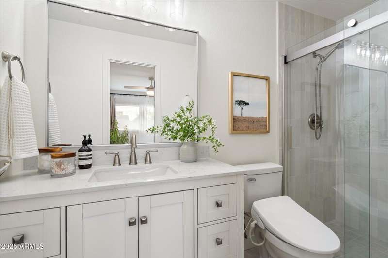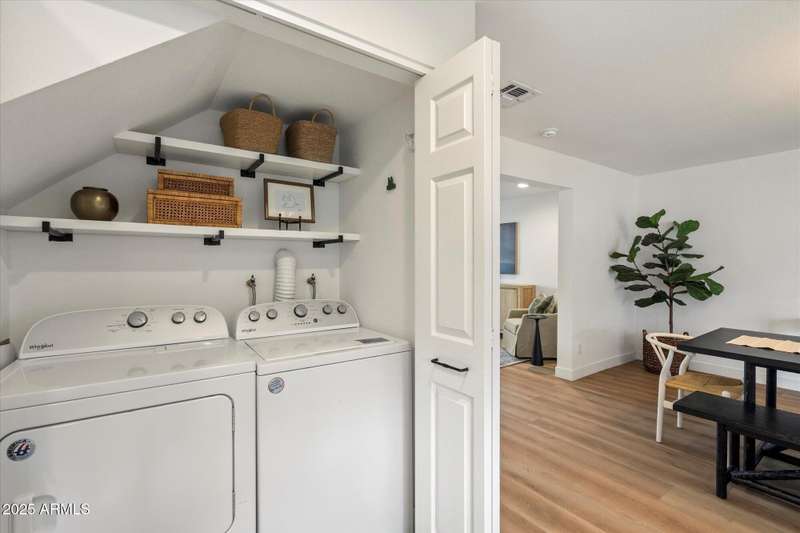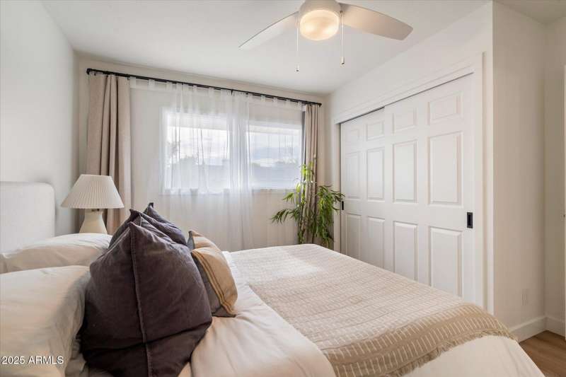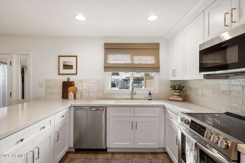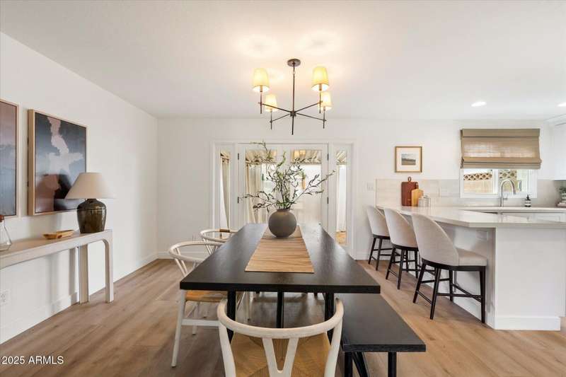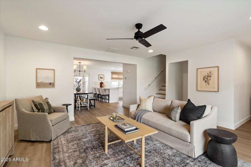 Charming traditional style townhouse is located in the heart of Scottsdale. Close by to parks, walking and biking paths, restaurants and near Old Town Scottsdale. The property has been completely renovated top to bottom with beautiful finishes and a welcoming spacious open concept floor plan. The main level of the home features an entry foyer, living room, hall to coat closet and powder bath, dining room, full kitchen and laundry adjacent. Second floor has 4 bedrooms including a primary suite, open hallway to secondary bedrooms, hall bathroom and linen closet. French doors off the dining room lead to the private and spacious outdoor patio which is equipped with new gravel, metal shade awning, citrus tree for shade, outdoor storage shed and 2 reserved covered parking