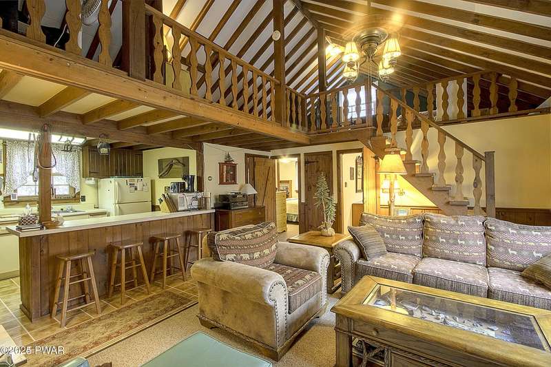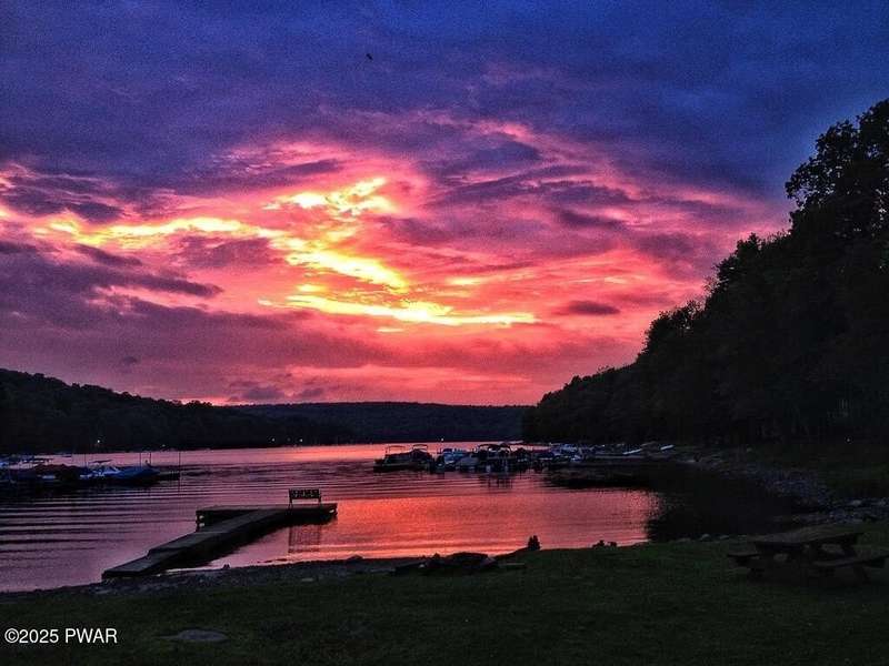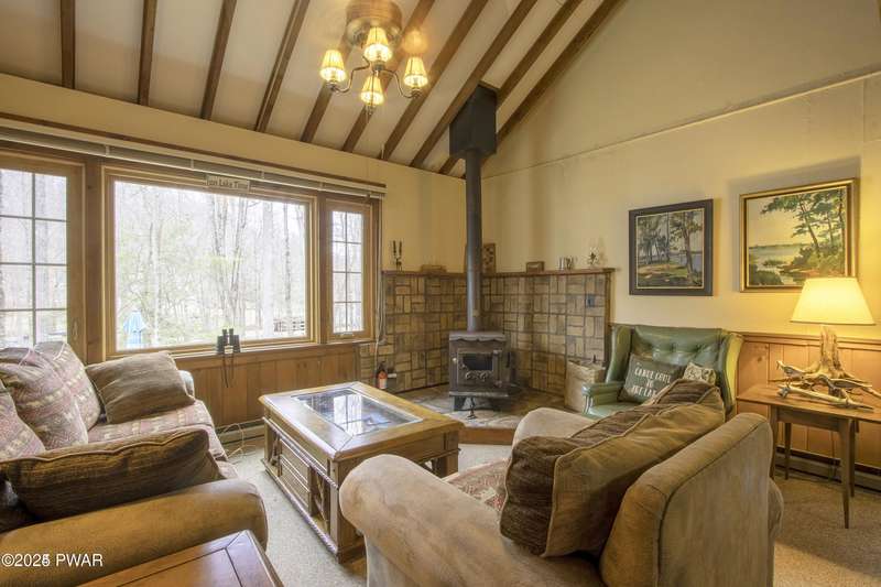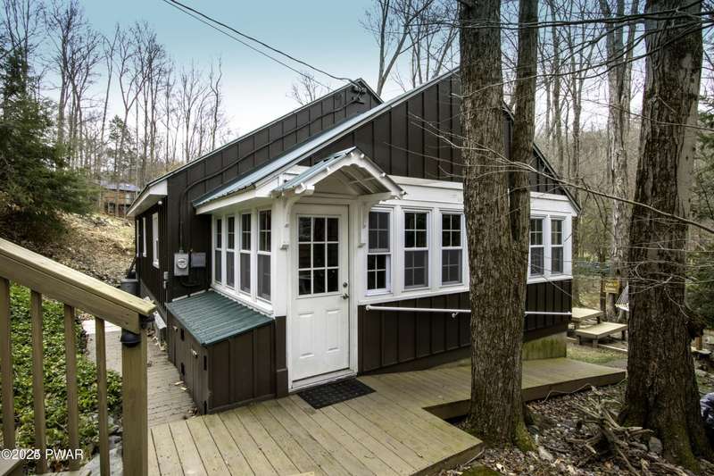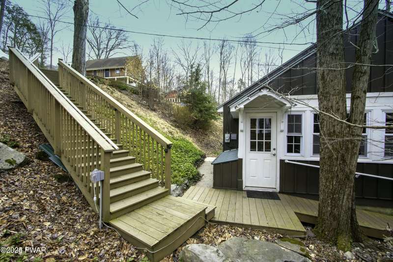 Technical LAKEFRONT CABIN on Lake Wallenpaupack. Located in the Private Community of Beechwood Cove. This three season, technical lake front, Gumble Cottage has direct level access to the community beach/picnic area, swim platform and community boat slips. Great year round views of Ironwood Cove! Lots of parking area for cars and boat trailer. 2 Bedrooms and sleeping loft. Galley kitchen with breakfast bar opens to the living room and wood stove. The cabin has a enclosed sunroom with cedar ceiling and lake views. Cottage transfers with a community boat slip.