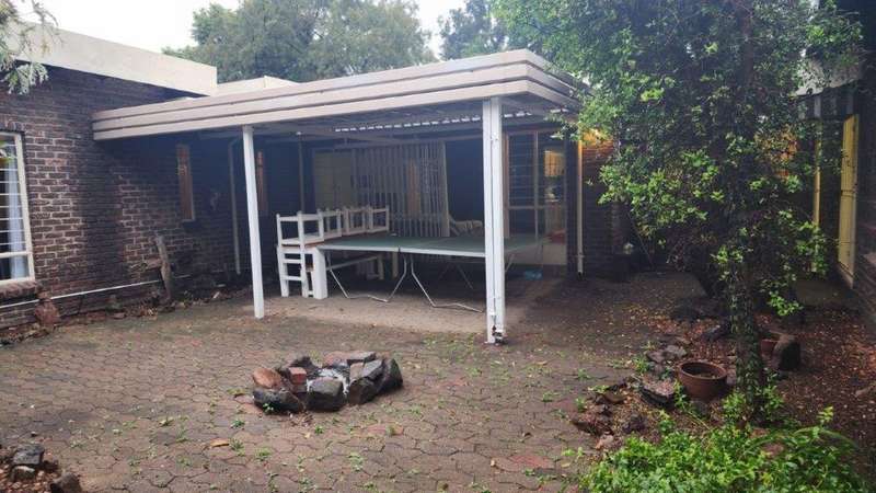 Covered patio with an all-weather awning overlooking a well-maintained garden
