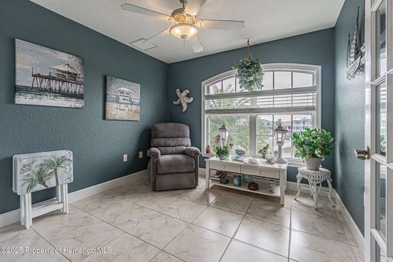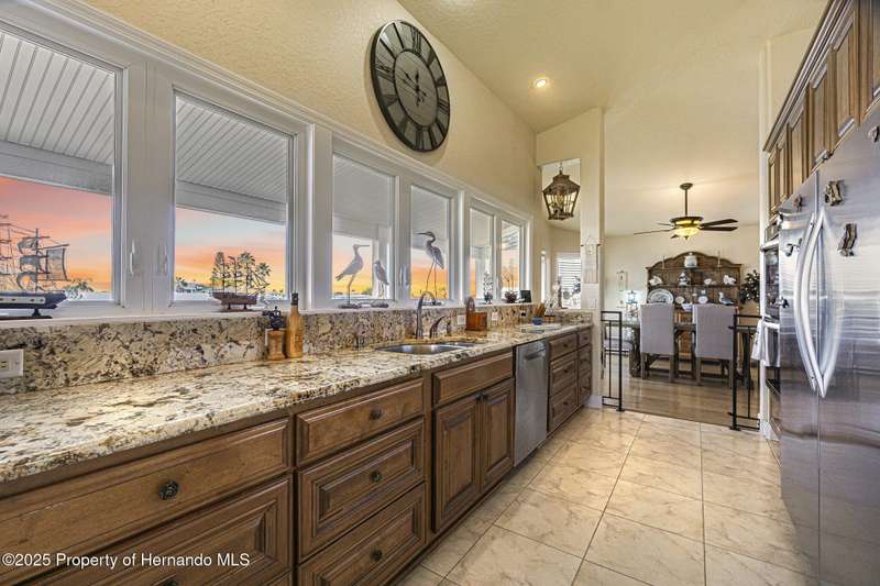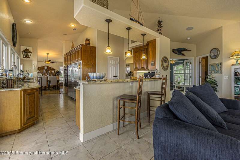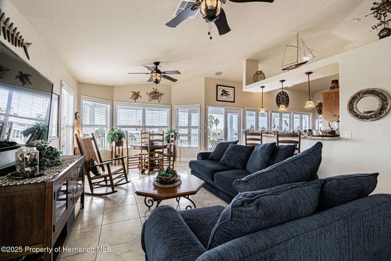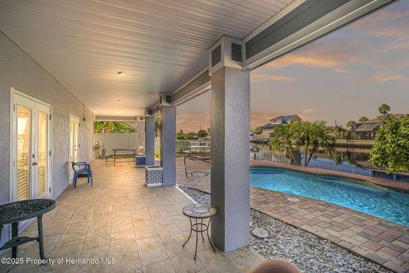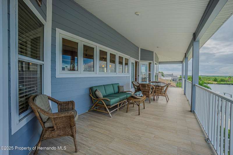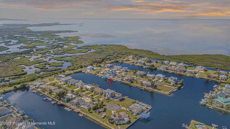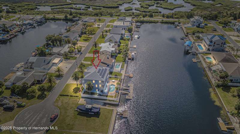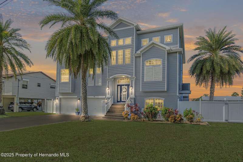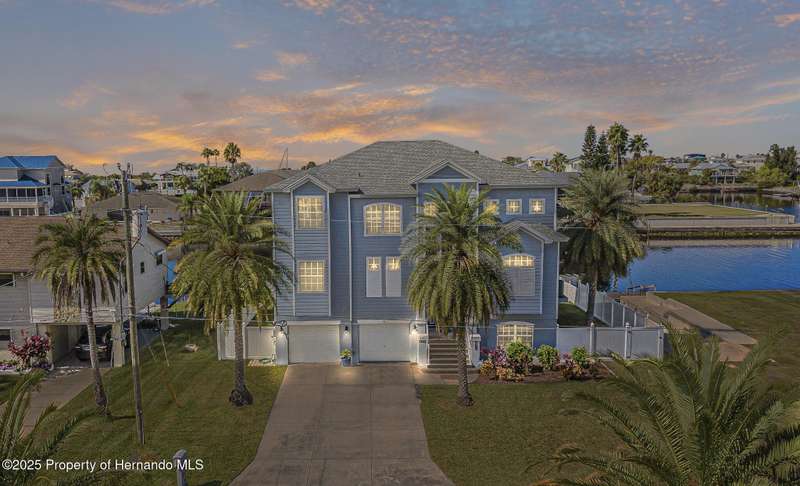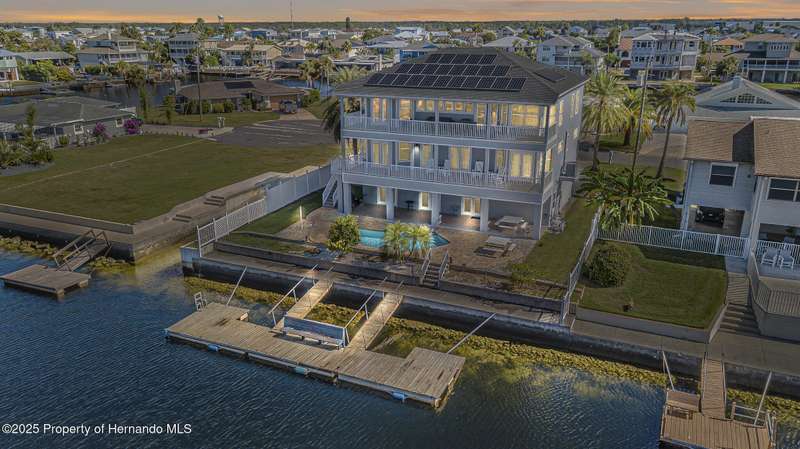 Experience enhanced waterfront living in this custom-built 3,208 sq. ft. residence, completed in 2004. Designed for optimal structural integrity, this three-story, 5-bedroom, 4-bathroom home features primary living spaces on the upper two floors and is strategically positioned on elevated ground behind both a seawall and knee wall at the highest point along the private street and cul-de-sac. Begin each day with coffee on the expansive third-floor deck, offering panoramic views of the gulf and tranquil 25 ft deep Blue Jay Canal, where dolphins are occasionally sighted. The front side of the home provides clear sunrise vistas and unobstructed views of evening space launches from Florida's east coast, visible from the living room, office, and an additional bedroom space. The chef's kitchen caters to culinary pursuits with granite countertops and stainless-steel appliances, including a double oven and a generous 60-inch refrigerator/freezer. Additional amenities comprise a vegetable sink and a walk-in pantry with floor-to-ceiling shelving, ensuring ample storage. A built-in desk area further enhances organization and functionality. A window seat with a showcase Chihuly-style chandelier highlights the landing between the top two floors. The owner's suite includes spacious walk-in closets that provide ample storage and an en-suite bathroom with dual sinks and an expansive walk-in shower. An additional bedroom suite offers a private bath, while two further bedrooms share a full bathroom. The spacious laundry room is outfitted with washer, dryer, utility sink, abundant cabinetry, and counter space. A dedicated interior 4 x 4 elevator serves all three floors, accommodating up to four adults, carts, or furniture. The lower level includes a two-car garage and additional flexible space for custom use that is not included in the square footage. Additional features include dual AC units, solar panels, 2022 roof, coastal windows on lower two floors, epoxy garage floor, ADT security, fenced yard, and irrigation system. Each west-facing bedroom offers direct access to a deck that leads to the pool, bordered by pavers, providing an ideal setting for hosting events and enjoying unforgettable sunset views. Dual ramps connect to the 60-foot floating dock which accommodates pontoons, kayaks, jet skis, paddle boats, and allows sailboat entry to the Gulf. This residence is meticulously designed to showcase a harmonious balance of quality, comfort, and understated luxury, catering to those seeking a Florida lifestyle filled with boating, fishing, and a vibrant community environment! Hernando Beach is a tranquil waterfront community located on Florida's Gulf Coast. The area offers a selection of quality dining establishments and provides convenient access to Spring Hill and Brooksville. Both Tampa and Orlando are easily reachable via major routes, each between one to two hours away by car. See for yourself why this could be the perfect place to drop your anchor and call this coastal paradise home!