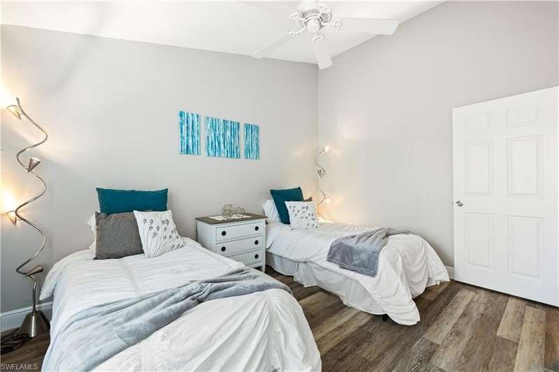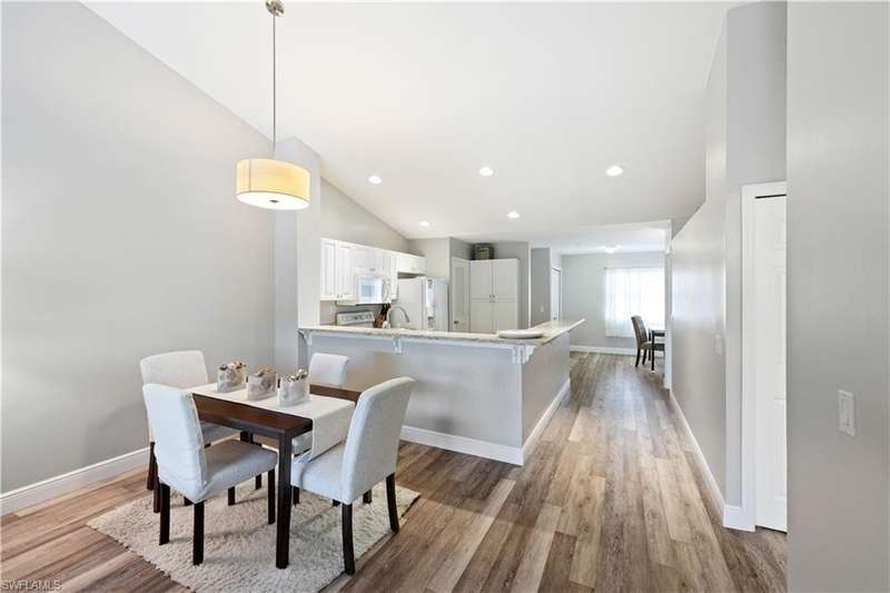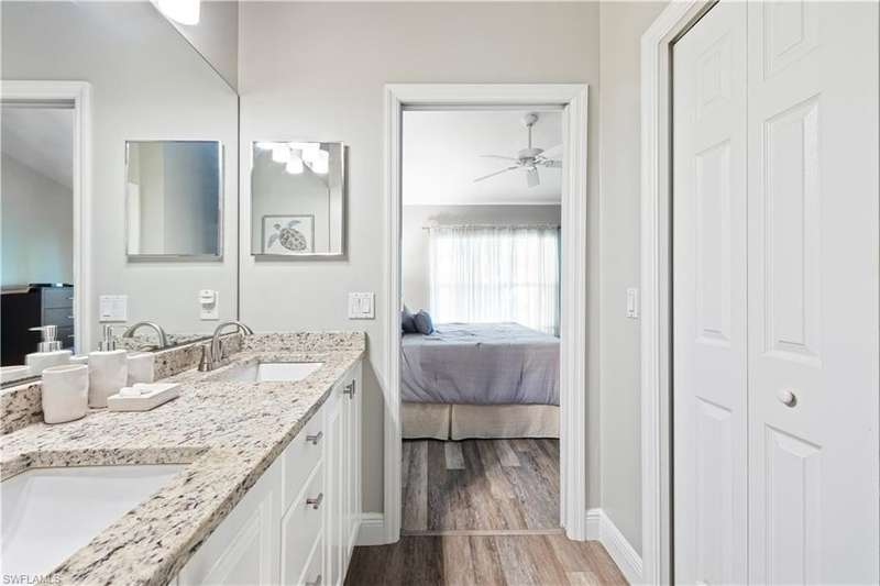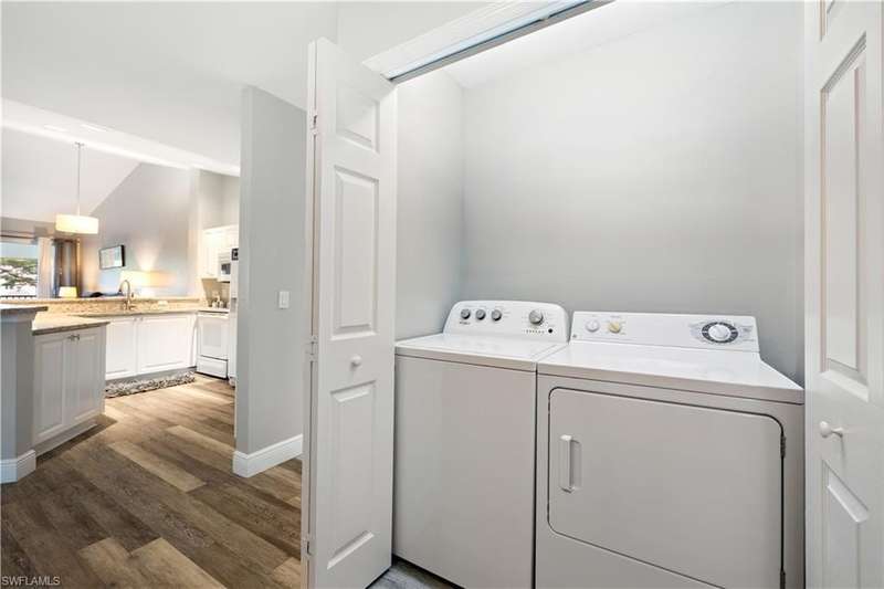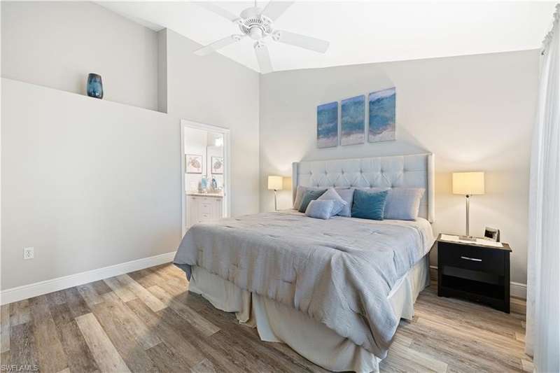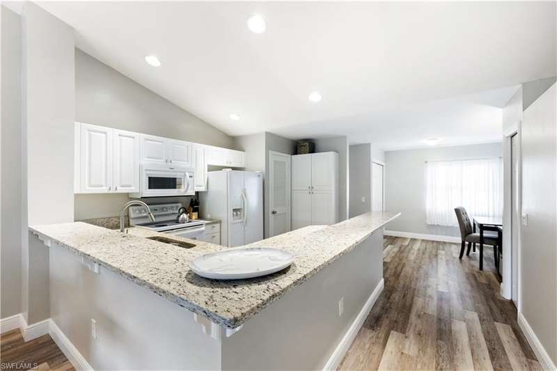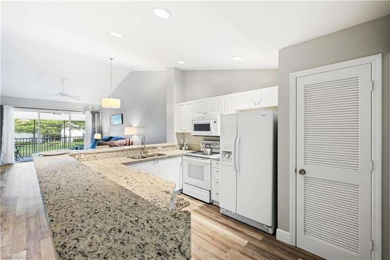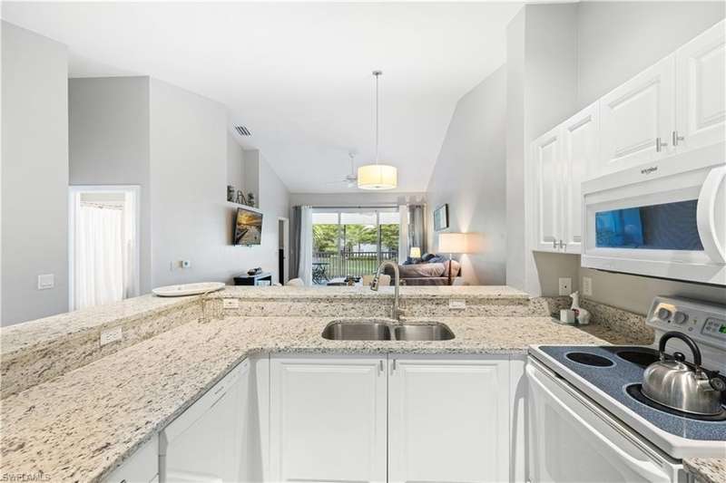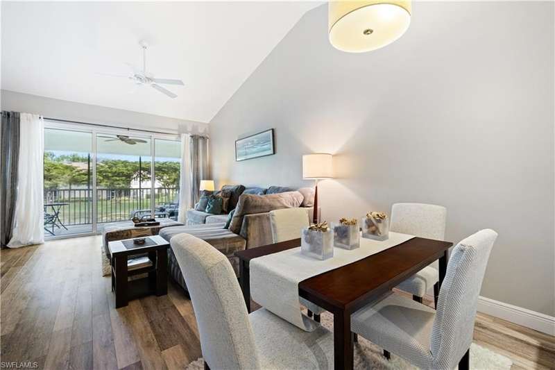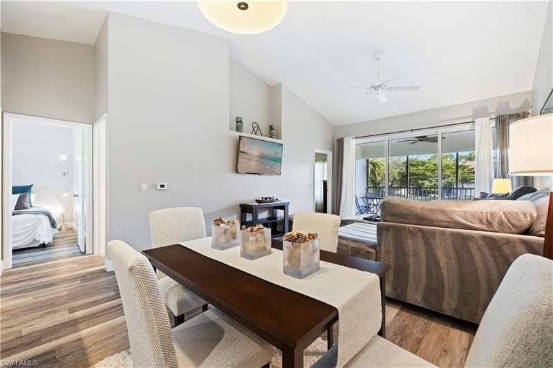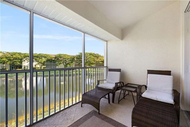 Welcome to your dream escape! This 2-bedroom, 2-bathroom condominium on the 2nd floor boasts an updated open floor plan that seamlessly blends style and functionality. Enjoy serene mornings and tranquil evenings with stunning views of the lake from your own screened balcony. The heart of this condo is its bright and airy living area that flows effortlessly into the dining and kitchen spaces. High ceilings amplify the open feeling, creating a welcoming environment for hosting friends or enjoying quiet evenings at home. The primary bedroom featuring a plush king-sized bed, a flat-screen TV for your entertainment needs, and a generous walk-in closet, ensuite bathroom with walk-in shower. The guest bedroom is perfect for visitors or family, furnished with two twin beds and a TV that offers streaming-only services. The fully ewuipped kitchen includes a spacious breakfast bar that invites casual dining and socializing, while the dedicated dining area comfortably accommodates four. A versatile desk area off the kitchen provides the perfect spot for work or study. This unit comes with a wash and dryer, covered parking space and WIFI. Carlton Lakes offers many activity options with its several pools, fitness center, tennis courts, bocce ball, community room & library. Sidewalks everywhere for the walking enthusiast, and miles of roads for bicycling. This gated community is private yet exceptionally located close to many shopping centers, restaurants, Mercato, & only 15 minutes west to white sandy beaches and the Gulf of Mexico. A public golf course is not far away at Arrowhead on Immokalee Road.
