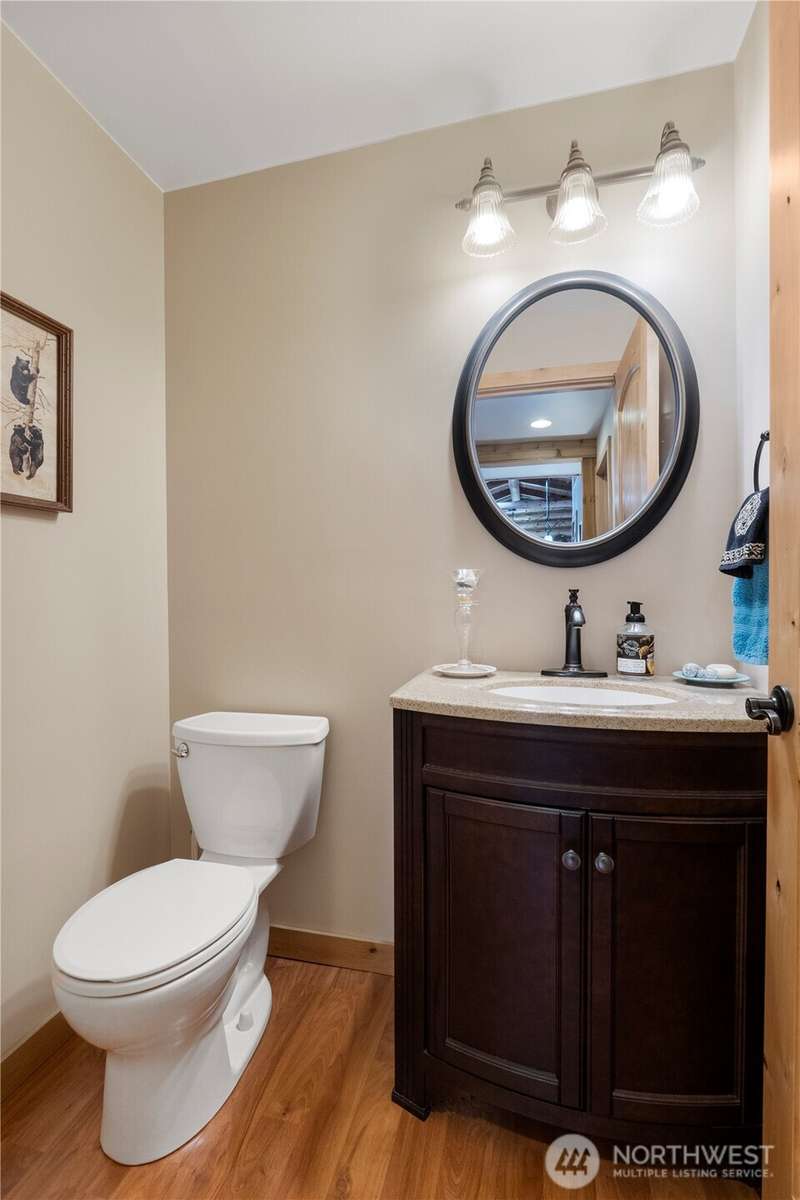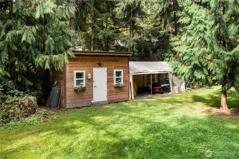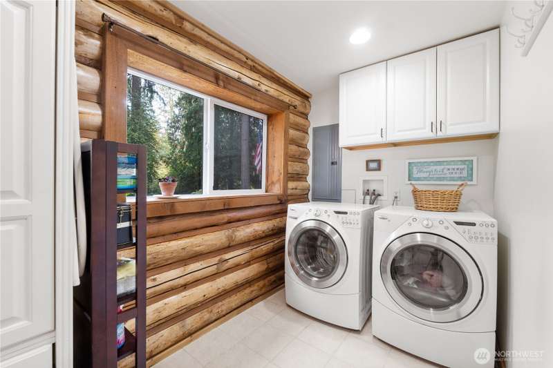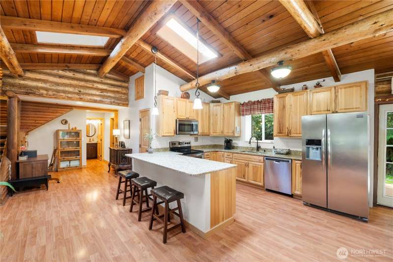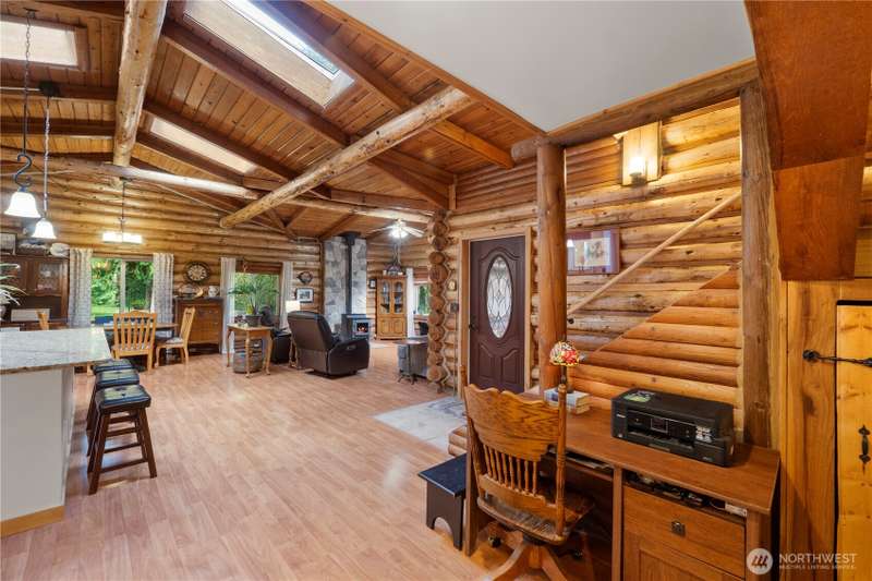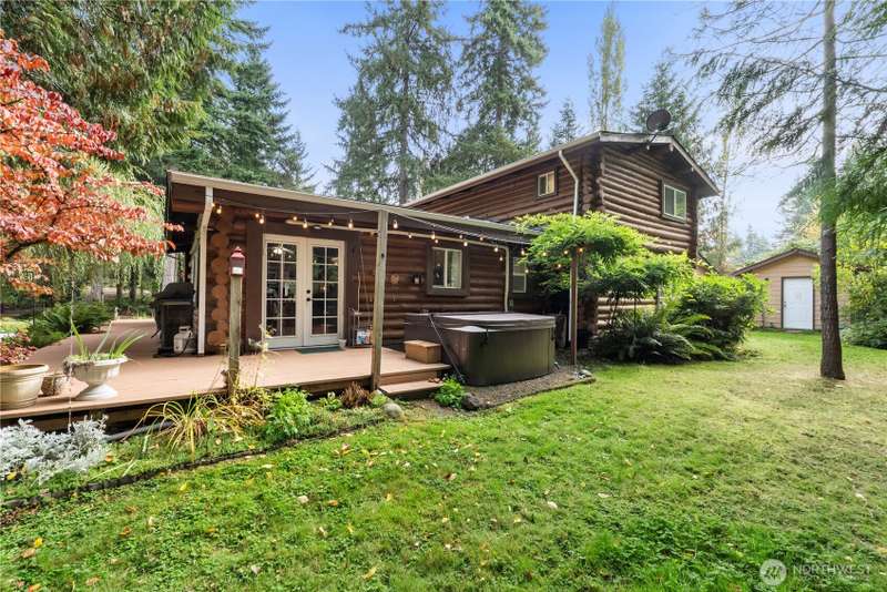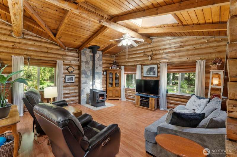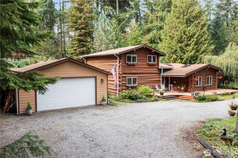 Situated on 2.4 secluded wooded acres, stunning 2-story log home totally remodeled offers the perfect blend of rustic charm & modern comfort. Featuring 3 bdrms, 2.25 baths, the home welcomes you w/vaulted ceilings, skylights & beautiful French doors. Main Floor Primary Bdrm Enjoy year-round comfort w/efficient mini-split heating & cooling, plus the warmth of a pellet stove. Entertain or relax on the expansive wrap-around deck, perfect for soaking in the peaceful surroundings. Detached garage offers storage & best of all, no HOA! Even w/its private, wooded setting, you're just minutes from shopping, schools, dining, & freeways. This is PNW living at its finest—privacy, nature, & timeless log home charm w/everyday convenience close by.