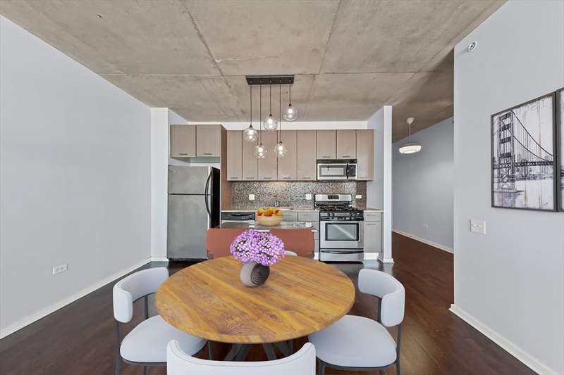 RD+659 steps from Restaurant Row in full amenity West Loop building! Spacious 1 bedroom with large open floor plan featuring tall concrete ceilings, oversized windows, small work space and a large living + dining space with dark hardwood floors. The open kitchen features granite counters, SS appliances, mosaic tile backsplash, and plenty of cabinetry. The bright and large bedroom has a professionally organized walk-in closet and IN-UNIT laundry. Building offers incredible 24 hour door staff, outdoor pool, sun deck with grill, exercise room, bike room, and on-site dry cleaners. Restaurant Row, Fulton Market, boutiques, coffee shops, fitness studios, Mariano's, Whole Foods & nightlife just blocks away. Close to the highway, 'L' and Metra. Garage parking spot available for an additional $30K. The assessment includes HEAT, AC, cable, internet & gas!