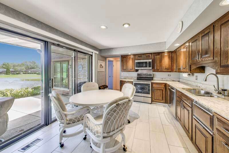 Maintenance-free ranch living on a with stunning pond views in highly sought-after Villas West! This spacious DETACHED 2-bedroom, 3-bath home offers a well-designed layout with vaulted ceiling and an inviting skylit foyer, along with a bright, open floor plan. The home has been well maintained but offers an excellent opportunity for renovation or your decorating ideas to truly make it your own. The expansive living and dining rooms are perfect for entertaining, while the cozy family room features a gas fireplace, wet bar, and sliding doors to a private patio overlooking lush greenspace and tranquil water views. The eat-in kitchen connects seamlessly to both the family room and patio. Enjoy the convenience of first-floor laundry. The generous primary suite includes a private bath with a separate shower and ample closet space. A second bedroom with a walk-in closet and full hall bath complete the main floor. The finished basement provides a large rec room, full bath, cedar walk-in closet, and abundant storage. Additional highlights include a heated 2.5-car garage with epoxy floors. HOA covers lawn care, snow removal, scavenger, and pond irrigation-just move in and enjoy the possibilities! Home is being sold AS-IS.