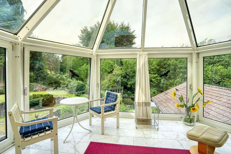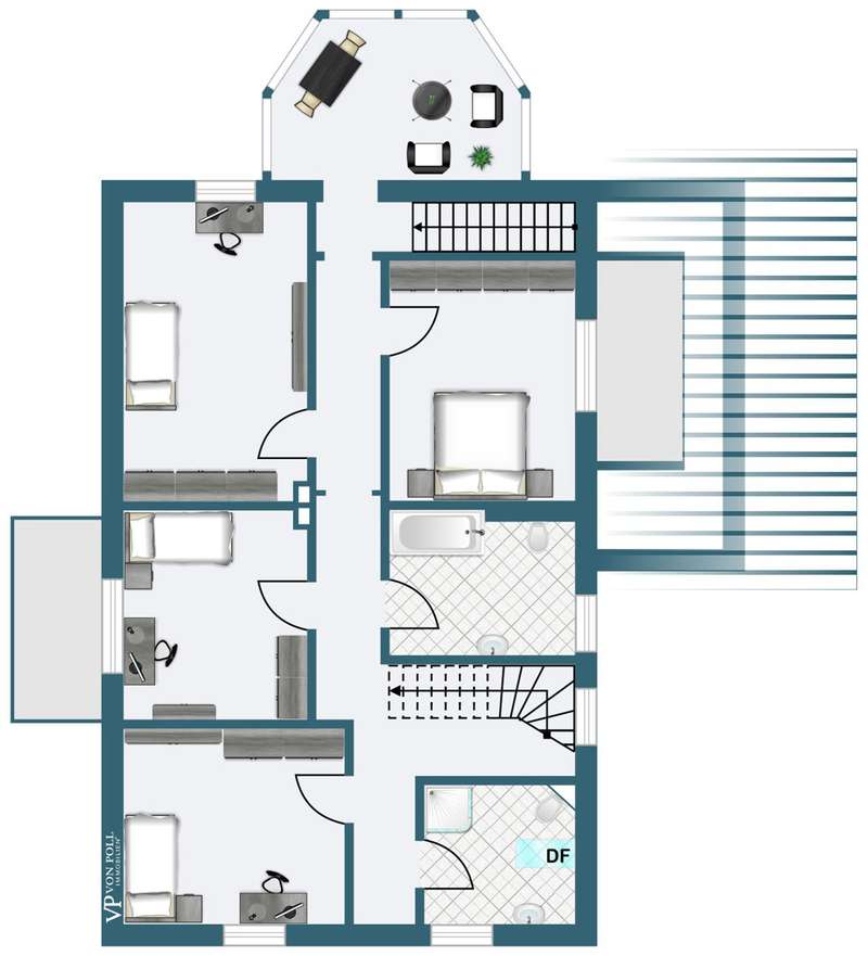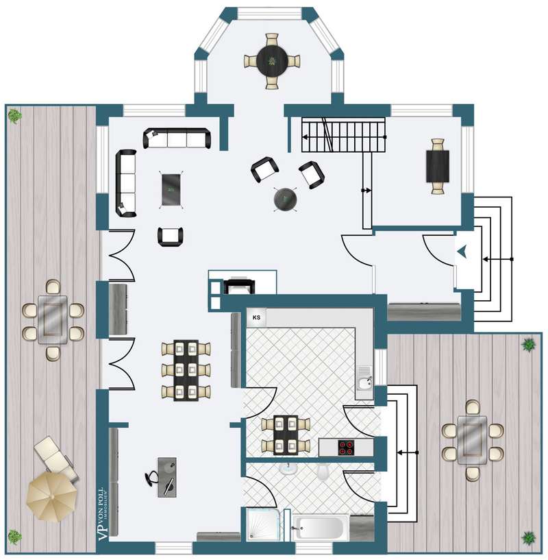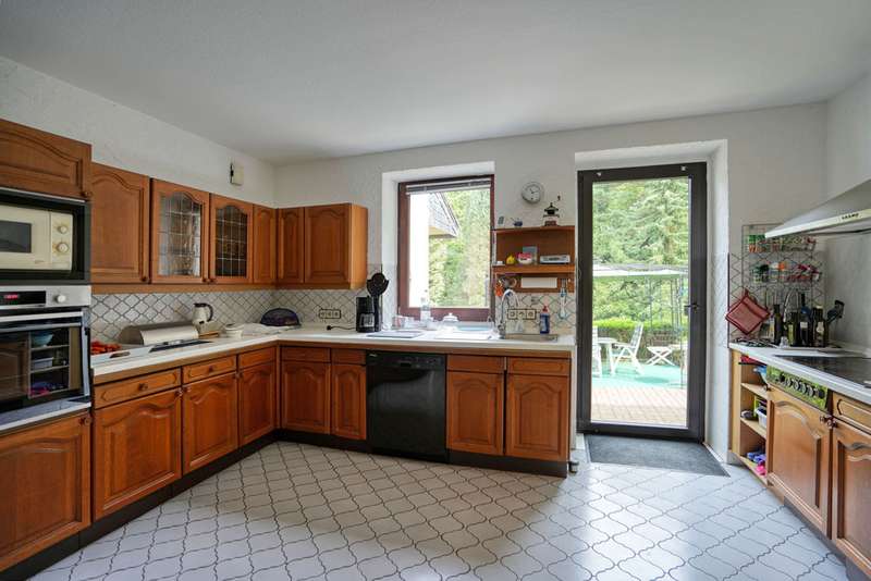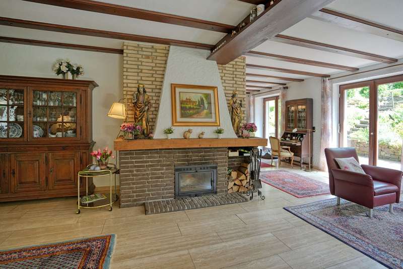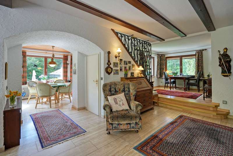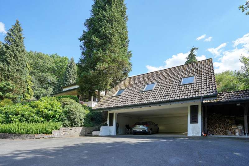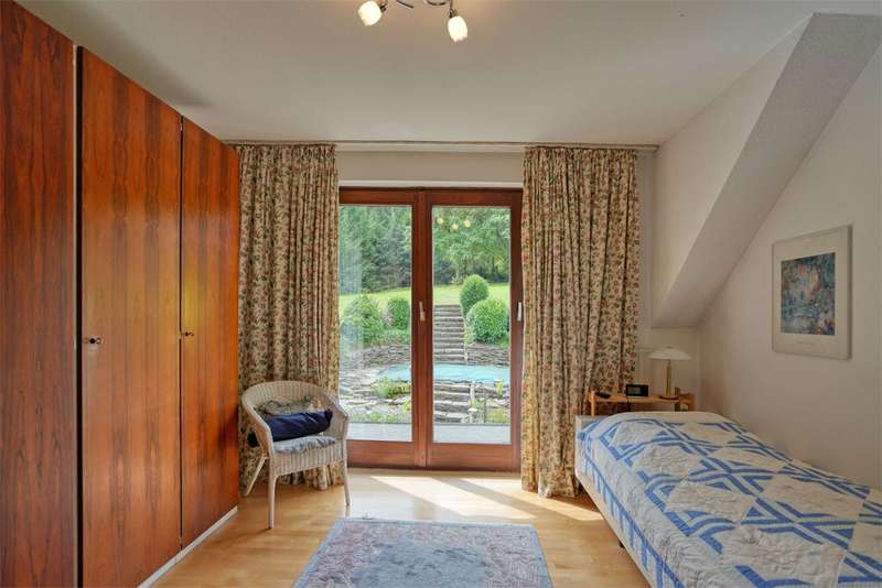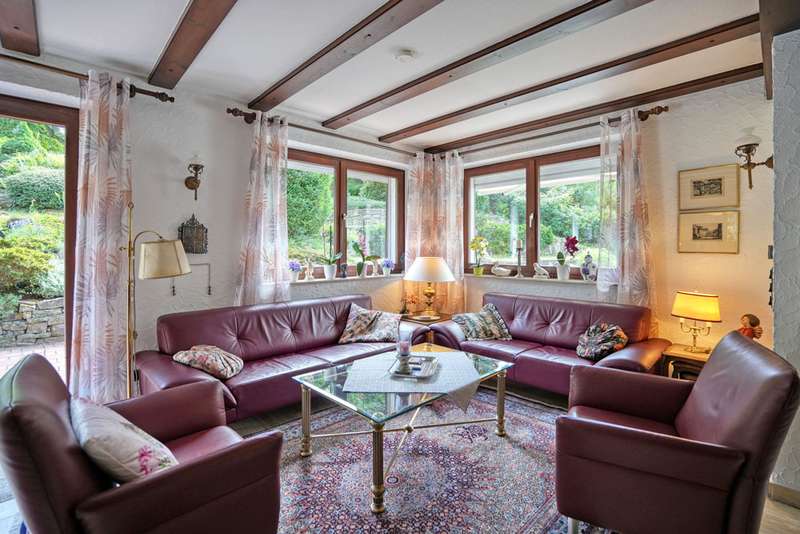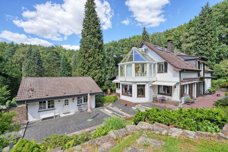 This country-style detached house dates back to a building that was erected around 1869. It has been rebuilt and extended several times, most recently the conservatory above the bay window room was built in 1988 and the garage building with the hobby room above it in 1989. The house has a cellar. On the first floor, from the vestibule with checkroom, you enter the generously proportioned living/dining area, which has various lounge areas, the lounge with fireplace, the bay window room and, slightly off to the side, a study. The spacious kitchen offers space for a dining table. The bathroom is equipped with a shower and bathtub. There are several points of access to the terraces surrounding the house. Upstairs there is a bedroom and three children's rooms as well as two bathrooms, one with a shower and the other with a bathtub. There is access to the conservatory room from the hallway. There is access to balconies from the bedroom and one of the children's rooms. The converted loft is accessible via a fixed staircase and offers space for play areas, a work area or similar. In the basement there is a utility room, the boiler room with oil tank room and a storage room. There is also a large garage with space for 4 cars with a hobby room above and a garden shed with sauna. The garden has park-like dimensions and features lawns as well as areas planted with perennials and trees. The terrain is terraced and partly landscaped with natural stone walls.