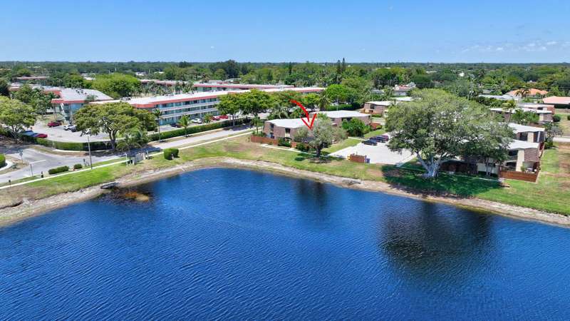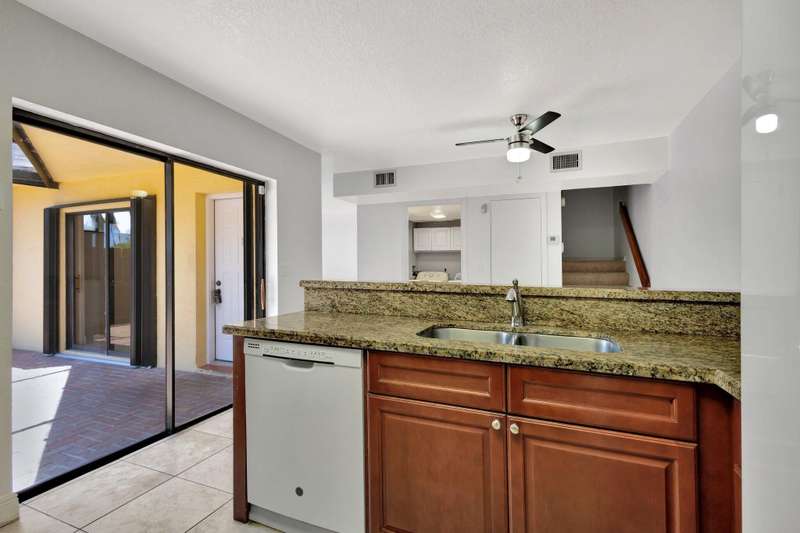Move-in ready townhouse with 2 master suites upstairs, each with private balconies and beautiful lake views. Downstairs offers an open floor plan with large tile flooring, newly painted walls, and new carpet on the stairs. Modern wood-look laminate flooring upstairs. Kitchen features wood cabinets, granite countertops, breakfast bar, and newer appliances. New dishwasher and refrigerator. Half bath w/washer/dryer. Sliders off the kitchen and living room lead to a fully fenced, screened private courtyard w/ brick patio is perfect for outdoor dining and entertaining. Accordion shutters, 2 assigned parking spaces, and pet-friendly (1 dog or 1 cat). Community includes a new gym, pool, tennis, pickleball, and clubhouse. Great location! New roof in 2022! Move in ready and waiting for new owners.