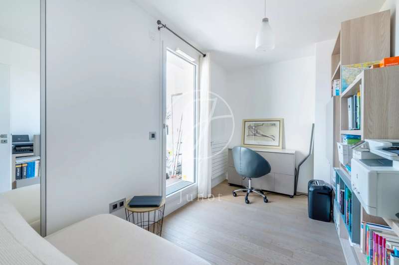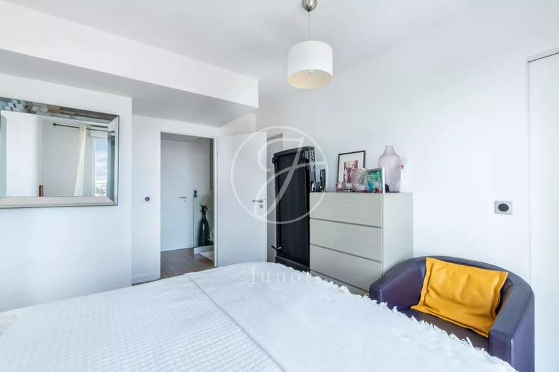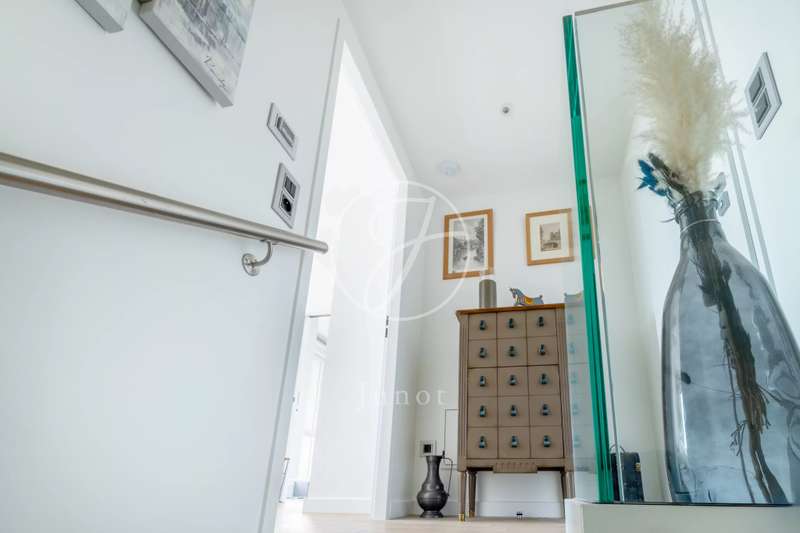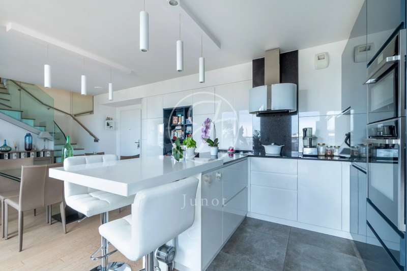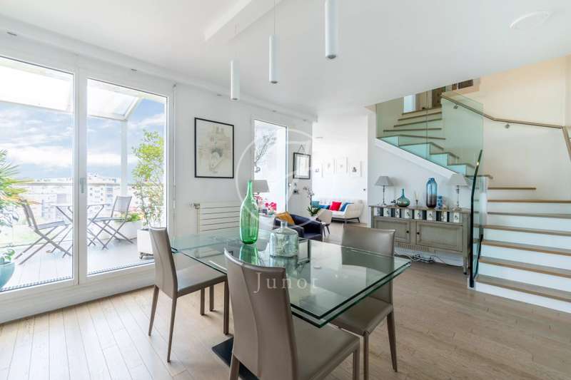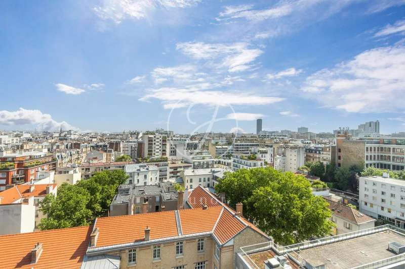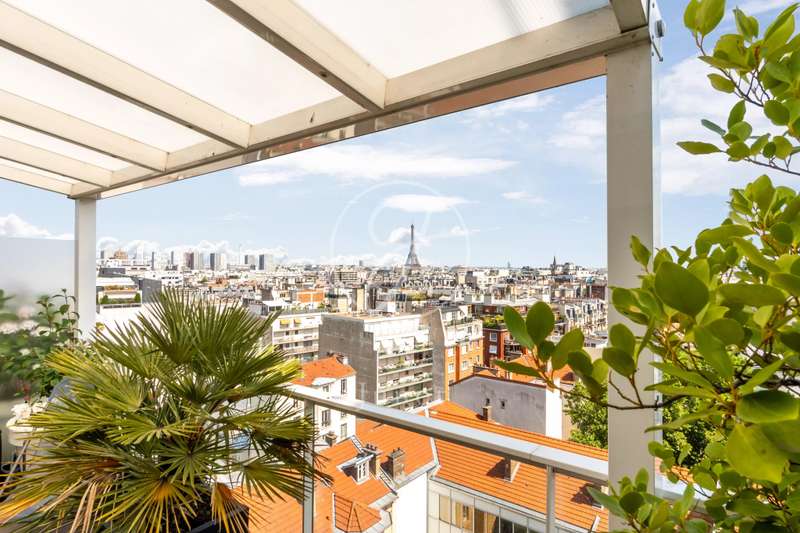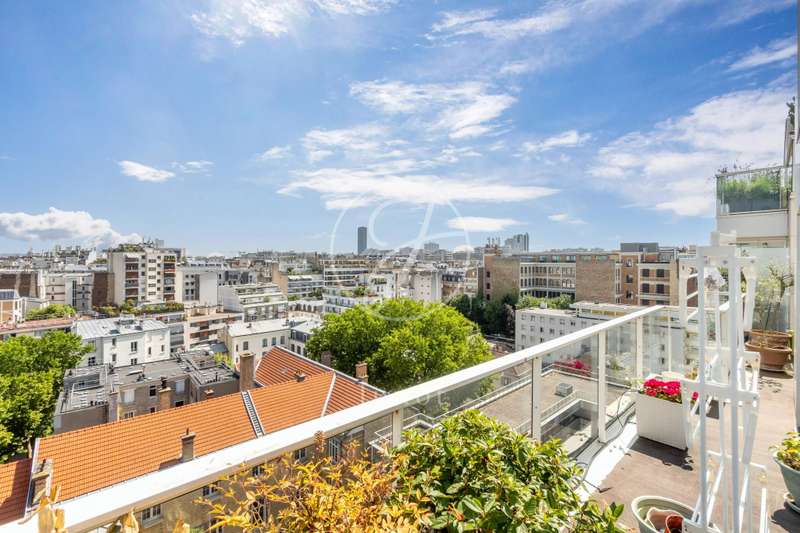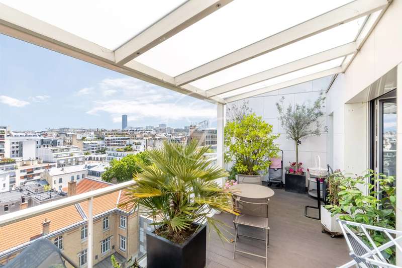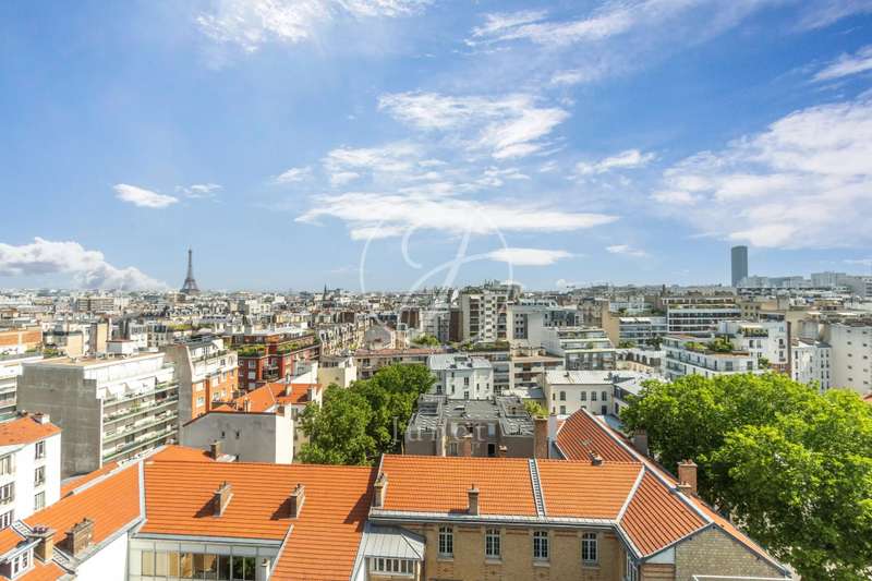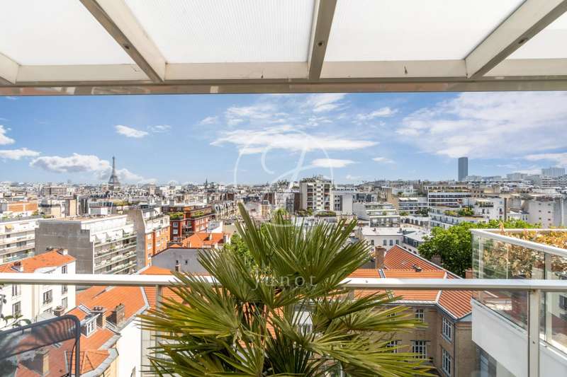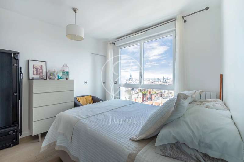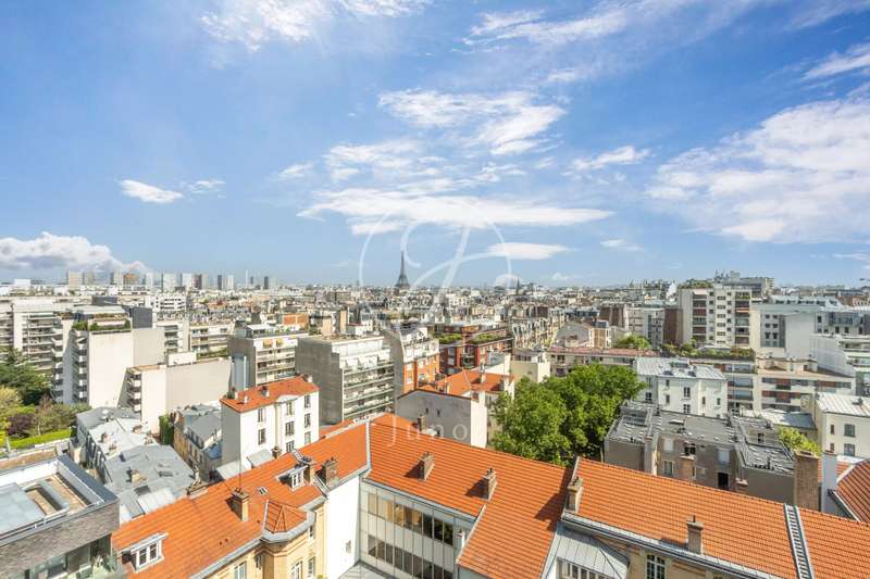 On the top two floors (7th and 8th), accessible by elevator, of a very recent building, lies a beautiful apartment with a terrace and open views. On the 7th floor, the reception area includes a living room and a fully fitted open-plan kitchen. A bedroom with its own shower room and toilet. The entire level opens directly onto a large 28sqm terrace offering breathtaking views of several iconic landmarks, such as the Eiffel Tower, Sacré-Cœur, Arc de Triomphe, and Les Invalides. On the 8th floor, accessible via an elegant interior staircase, there is a master suite with bathroom and walk-in closet. The property is in perfect condition and enjoys excellent natural light. A double parking space is available at an additional cost.