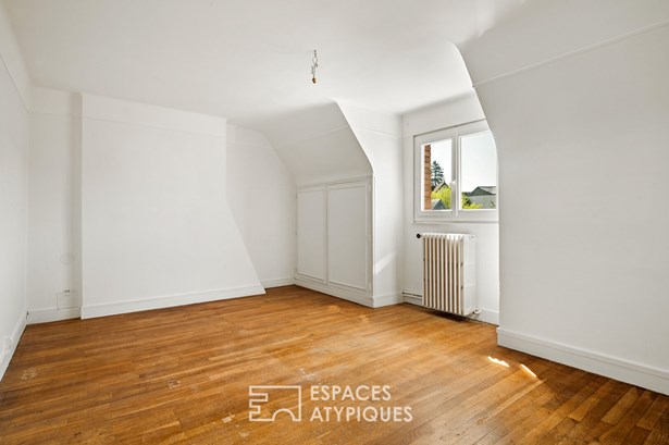 The top level houses three additional bedrooms, a shower room, and a room to be converted, opening onto an attic space that can also be converted, allowing for a recreation area, a workshop, or a master suite under the eaves.