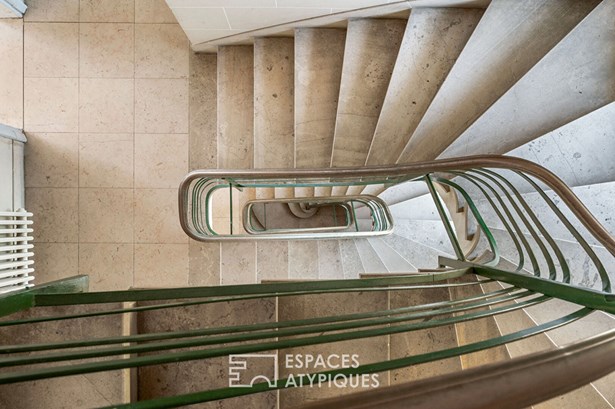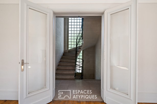 The central staircase, bathed in light thanks to a glass-paved skylight, leads to the upper floors.