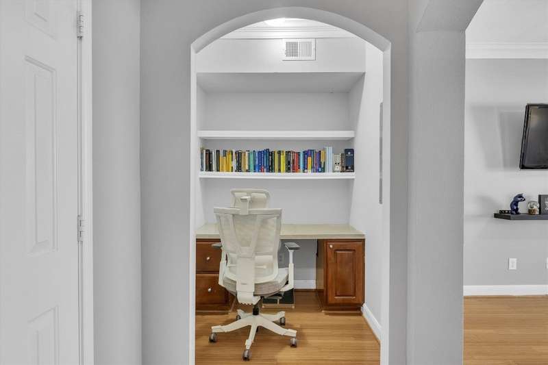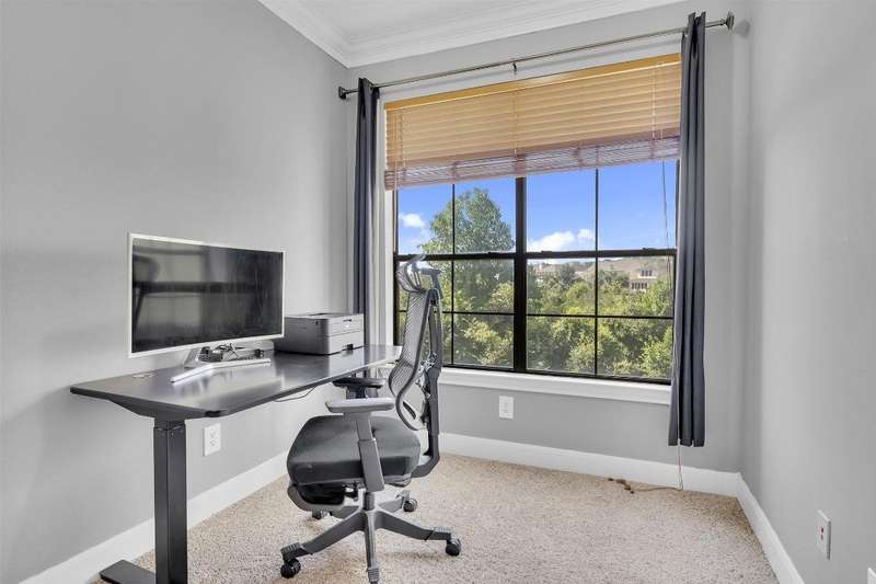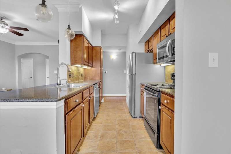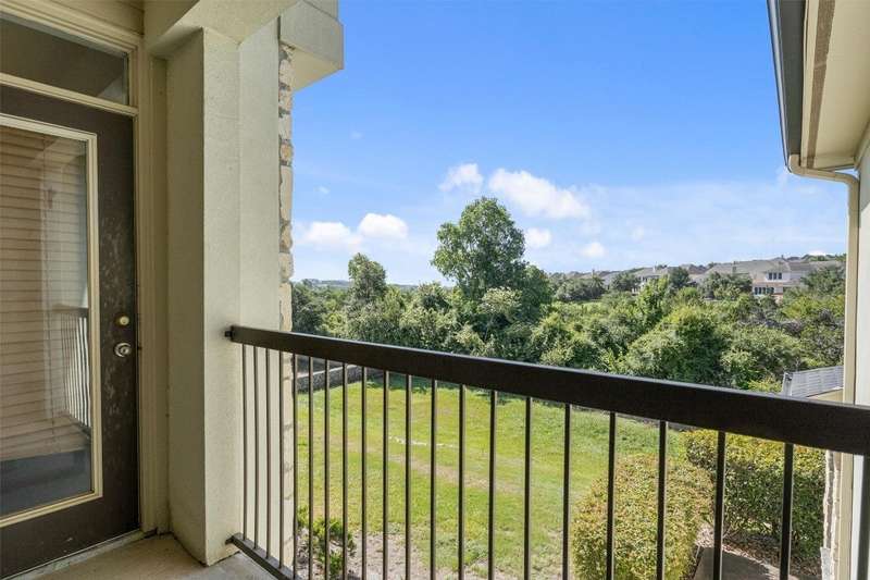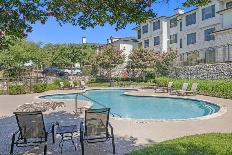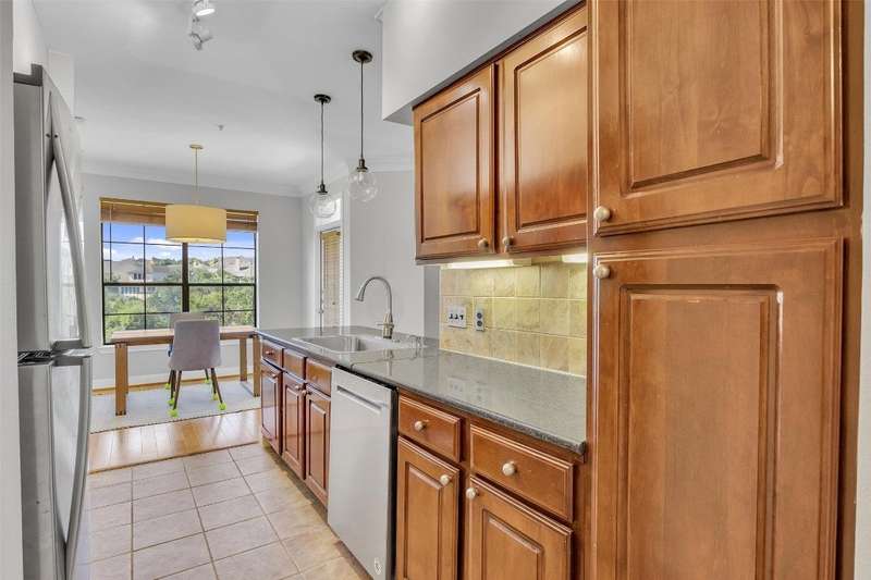 Welcome home to this 1,359 sq ft second-story condo overlooking a panoramic greenbelt. The condo offers 2 bedrooms, each with full baths, and a convenient computer nook with built-in bookshelves. The open floor plan features a bright living room and kitchen, equipped with granite countertops, stainless steel appliances, and a large sink. From the breakfast nook, step out to the elevated covered porch for a serene and private view of the surrounding greenery. The primary bedroom has a bonus area, perfect for a desk or exercise space, and a spacious walk-in closet. The main bath features double sinks. The home includes a one-car garage that opens directly into the unit, with first-floor entry and stairs leading up to the condo. The refrigerator, washer and dryer are all included! The gated community offers a swimming pool and a barbecue area, with a prime location ensuring easy access to shopping, dining, entertainment, retail stores, restaurants, coffee shops, and medical facilities. Additionally, it's just 15 minutes from downtown and the Hill Country Galleria/Whole Foods. Don't miss this opportunity to own a home in a sought-after location!