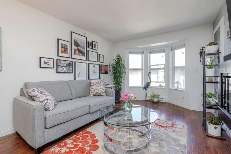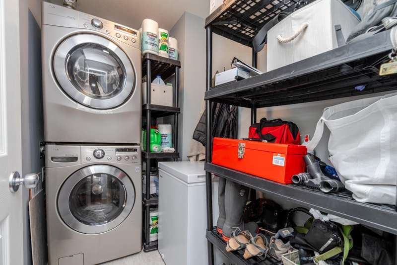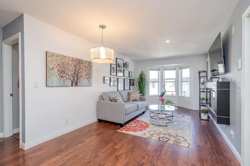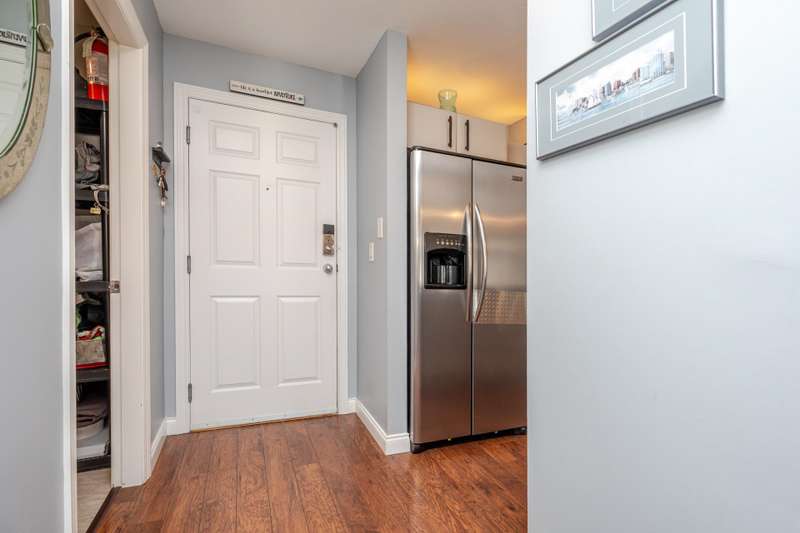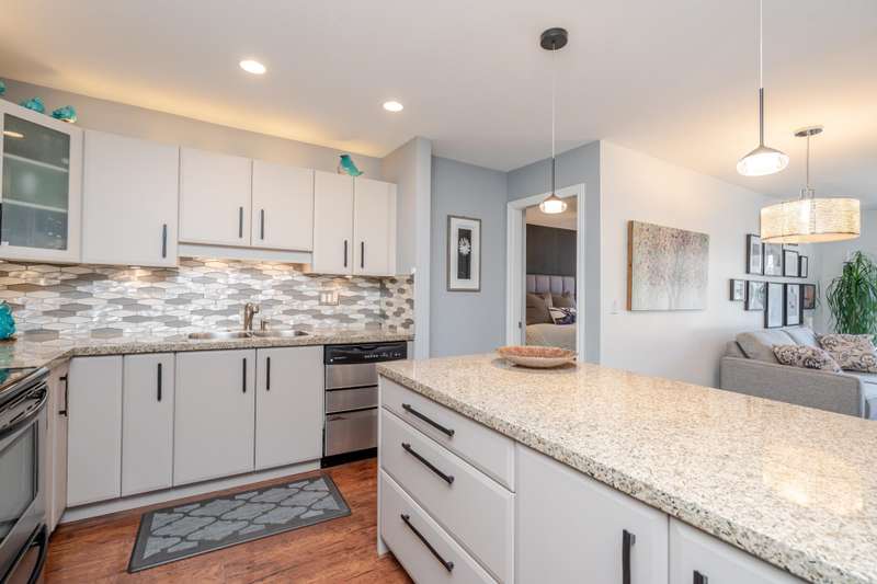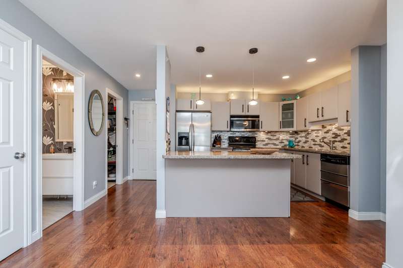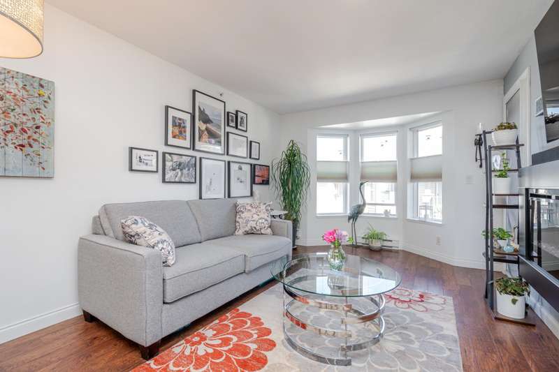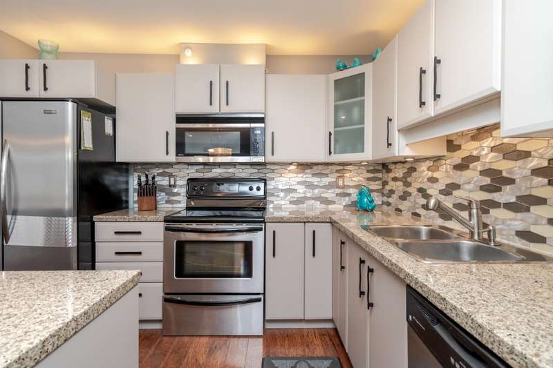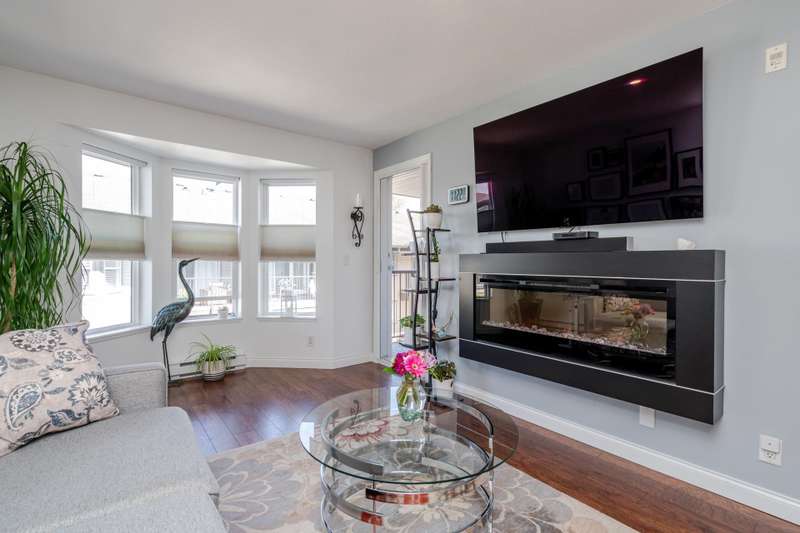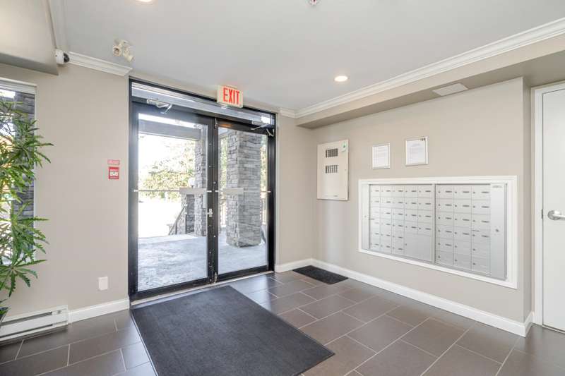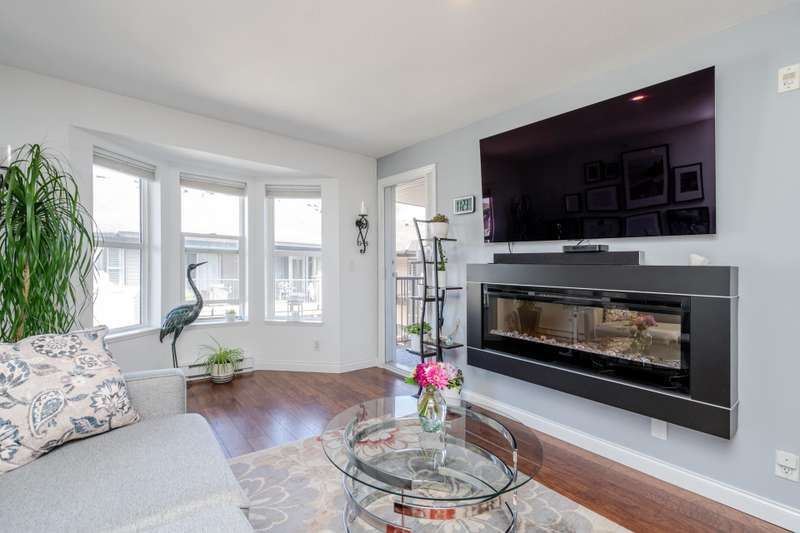 BETTER THAN NEW! This TOP FLOOR 2 beds/2 full bath unit offers 872sf of living space! As you enter you will feel the warmth of this home that has been tastefully updated. Starting with the kitchen that offers a good sized island, all new two toned cabinet doors/hardware, beautiful backsplash, granite counters, & S/S appliances. Main living is flooded w/natural light & features modern wall mounted fireplace + updated modern blinds. 2 good sized bedrooms (both w/new flooring) on opposite sides. Main bath beautifully updated w/new vanity, modern finishing/wallpaper & flooring. Ensuite updated w/ gorgeous new shower, counter, hardware, & flooring. In-suite laundry (updated washer/dryer) + storage room in unit. Great location close to schools, shopping, parks, amenities & future skytrain!