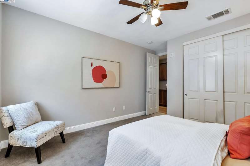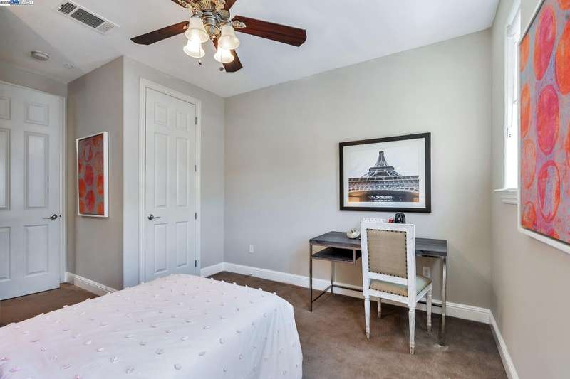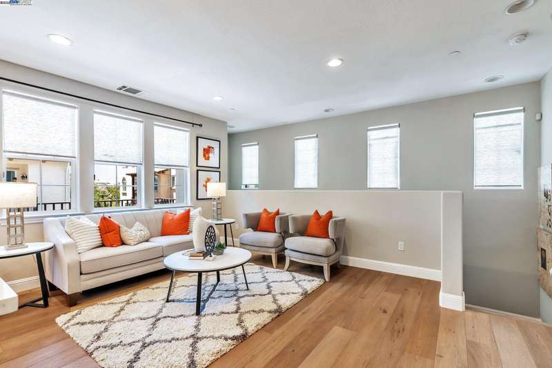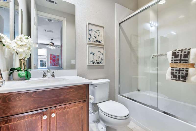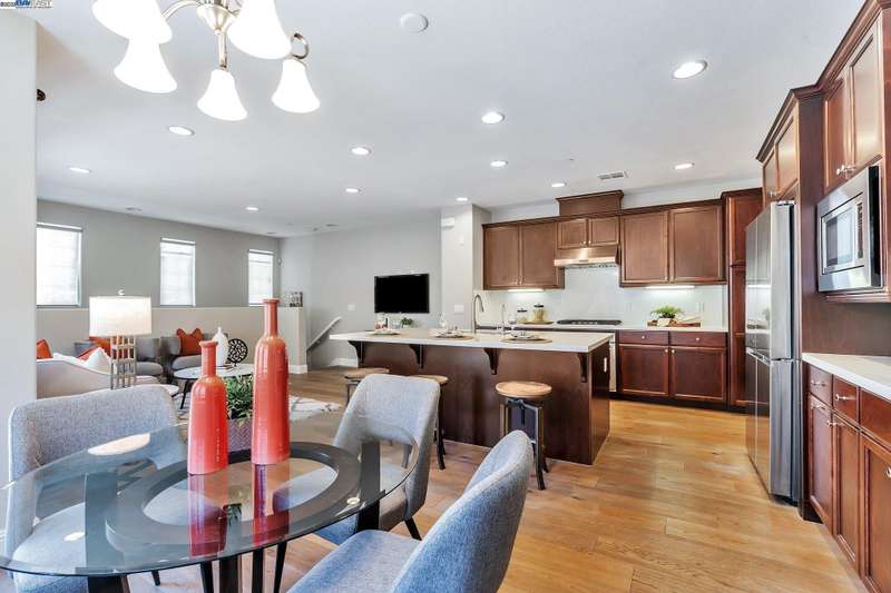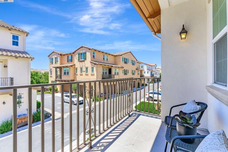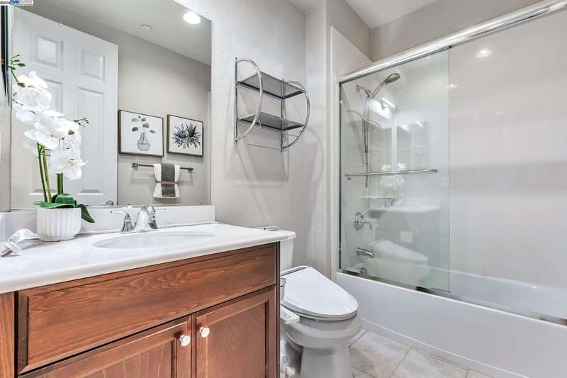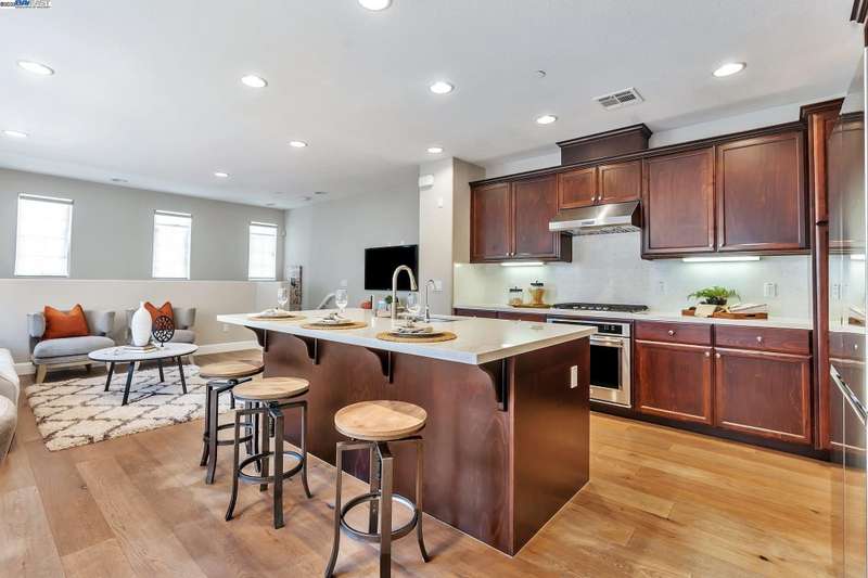 Exquisite end-unit townhouse-style condo in desirable Gale Ranch, perfectly located across from the brand-new Critter Crossroad Park! This light-filled home features an open-concept floor plan with hardwood floors, plush carpet, recessed lighting, and designer paint. The chef’s kitchen boasts quartz countertops, stainless steel appliances, upgraded cabinetry, and a large island ideal for entertaining. Enjoy seamless indoor-outdoor living with a spacious balcony off the second-floor living/dining area. A bedroom and full bath on the main level provide ideal guest accommodations. Upstairs, you'll find two generously sized en-suites. The primary suite offers vaulted ceilings, a custom walk-in closet, built in wall closet and spa-like bath with dual vanities and a sleek shower. Dedicated laundry closet with washer/dryer included. Close to top-rated San Ramon schools, parks, and shopping. Experience comfort, convenience, and community in one stunning package!
