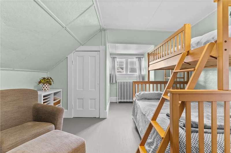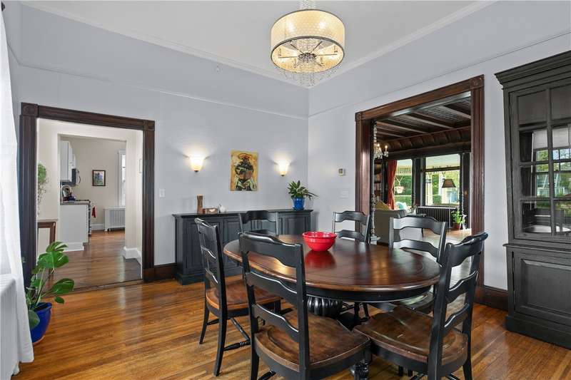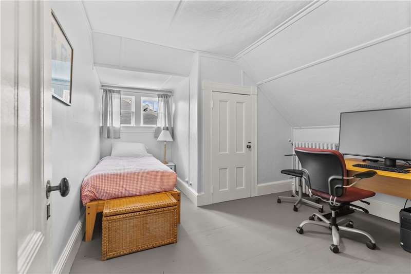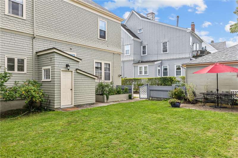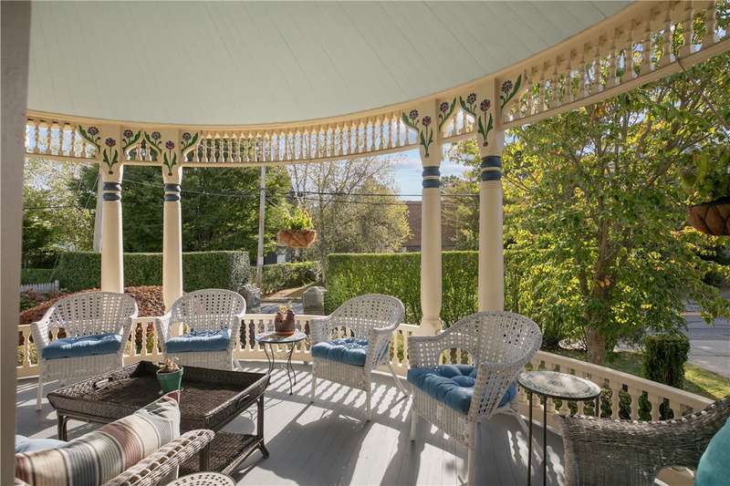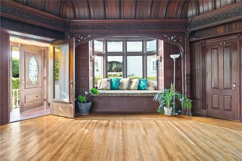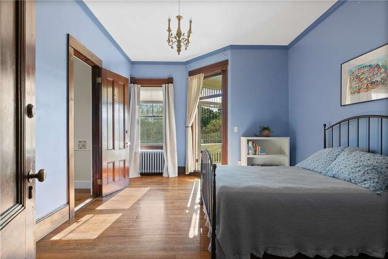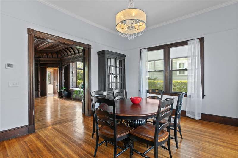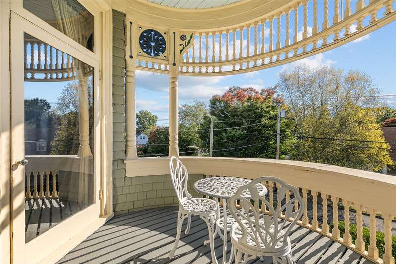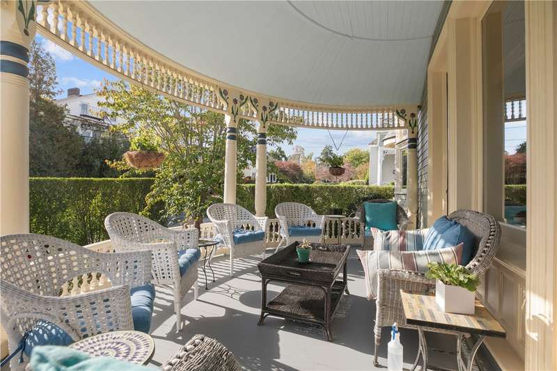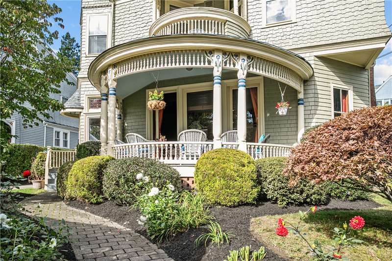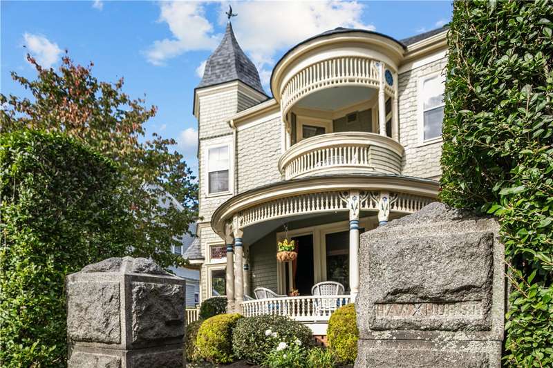 The Hawkhurst estate was built in 1882 by architect Dudley Newton. In 1929 the estate was reimagined as four separate homes, one of which is 68 Kay St. This Queen Anne style home features the original estate's library as its great room. With hand carved coffered walls and ceiling. It also boasts a curved plate glass bay window and plate glass pocket doors that lead to the inviting semi circular porch. Just above on the second floor, a smaller semi circular balcony is shared by two generous bedrooms. 2 more bedrooms and 2.5 baths complete the second floor. The third floor has 2 bedrooms, a full bath and walk in storage. Updates include a recent roof, gas fireplace, generator, renovated kitchen and baths. There is a two car garage, fenced in yard with a patio and raised garden bed. This 6 bedroom, 4.5 bath Gilded Age home in the historic Kay/Catherine neighborhood is within close proximity to Bellevue Avenue, Newport's waterfront and Broadway.