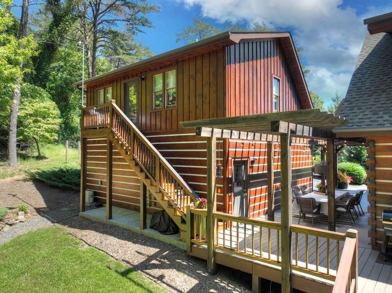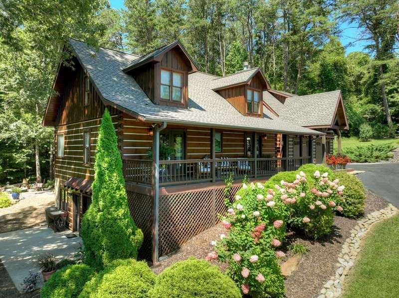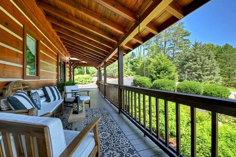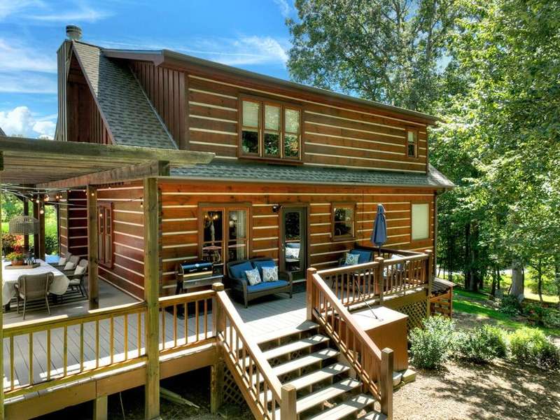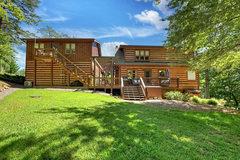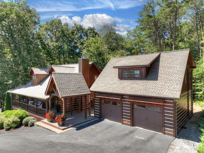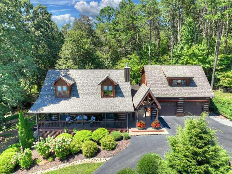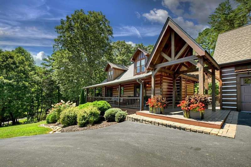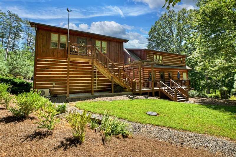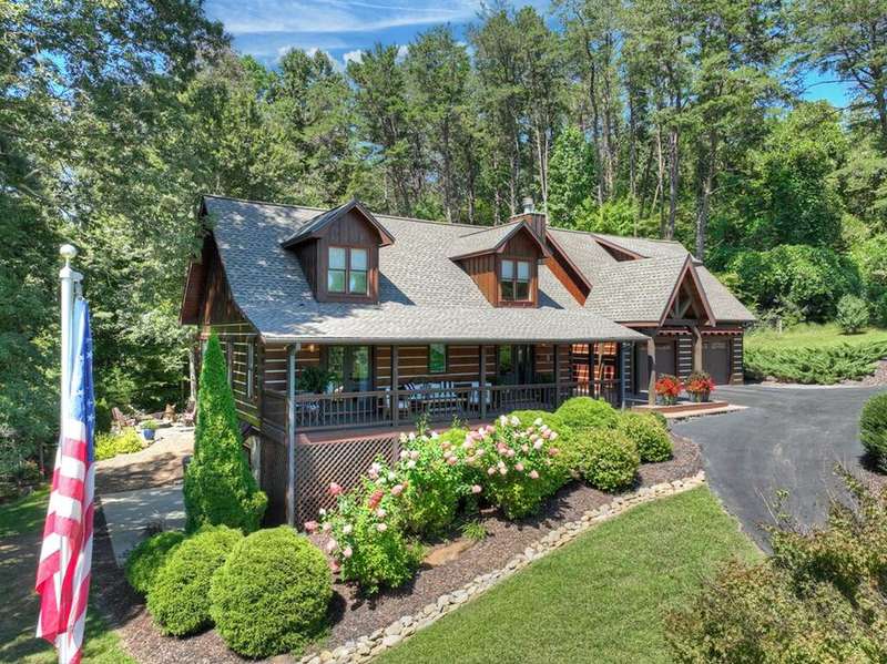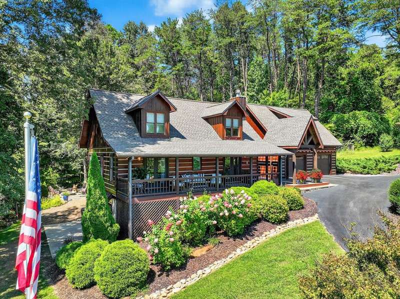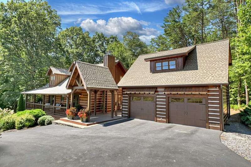 This stunning 3BR/3BA luxury log cabin is the perfect blend of modern rustic elegance and mountain charm, just 5 minutes from downtown Blue Ridge and steps from Lake Blue Ridge. Set on a level, beautifully landscaped lot with exceptional curb appeal, the home features paved access, a circular driveway, and an oversized 2-car garage with a fully finished guest suite above. Between the garage and main home, enjoy a cozy veranda ideal for outdoor entertaining, complete with seating and an inviting fire pit area. Inside, the newly renovated interior boasts soaring natural light, a gourmet kitchen with quartz countertops, a large island, and stylish finishes throughout. The main level includes a king suite with double vanities and a soaking tub, plus a queen suite for guests. Upstairs, a spacious loft provides additional living or sleeping space. The semi-finished basement is stubbed for an extra bathroom and can easily accommodate a bedroom, game room, or home theater. Featuring log chinking for authentic character, this home offers both timeless appeal and modern convenience with a newer roof and HVAC. If you are looking for a charming cabin retreat, this turnkey property is a rare gem in one of Blue Ridge's most sought-after neighborhood.