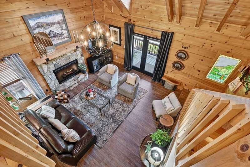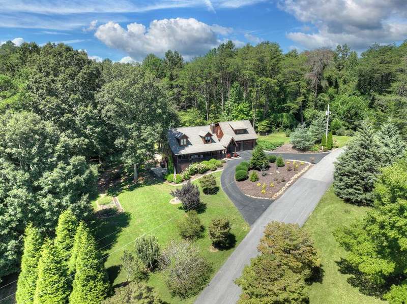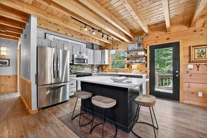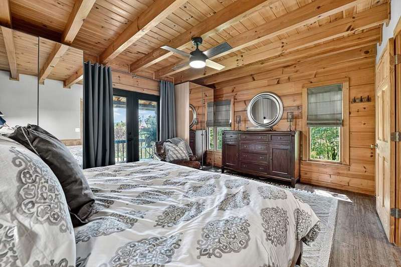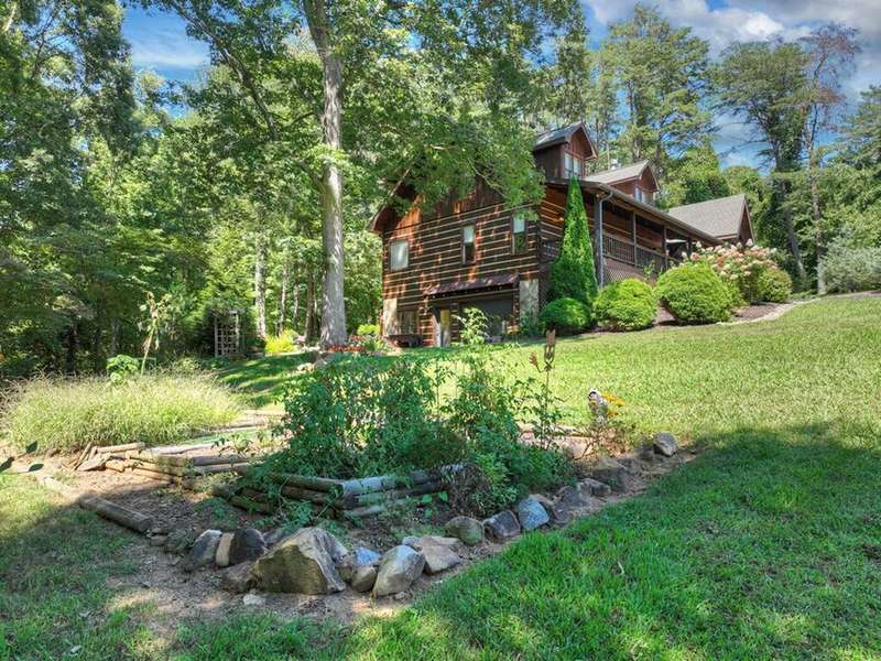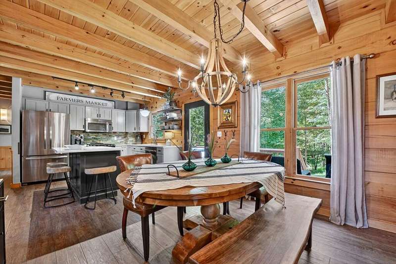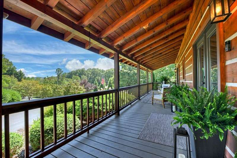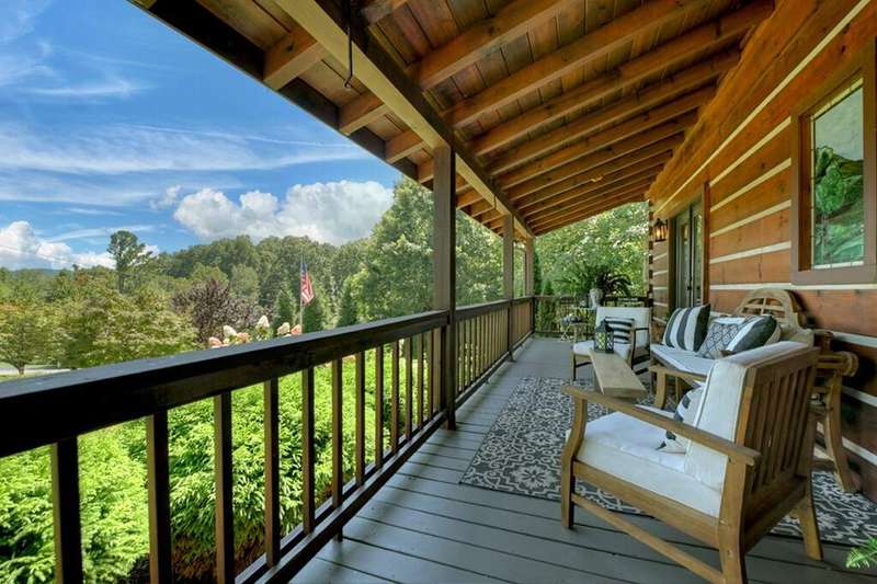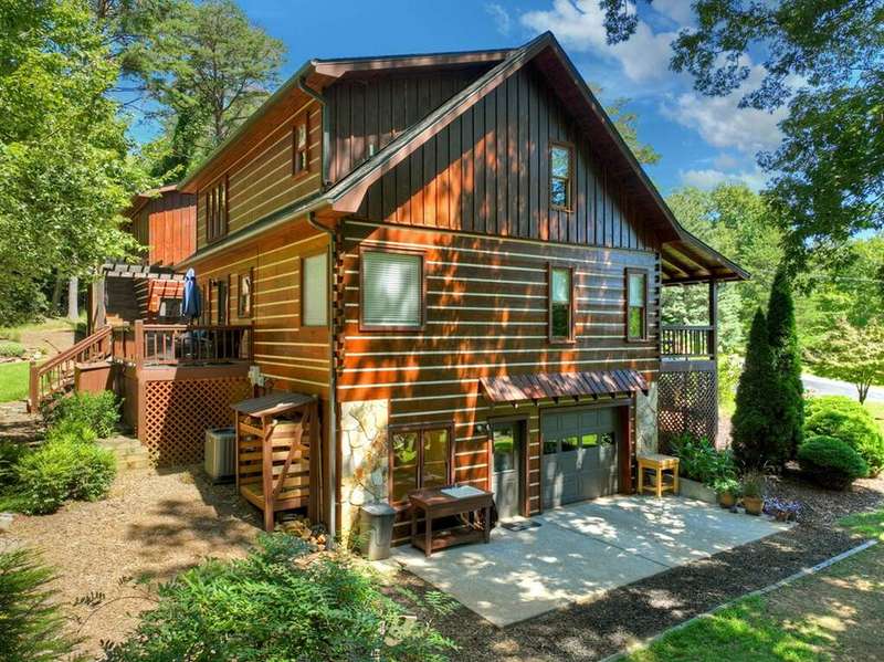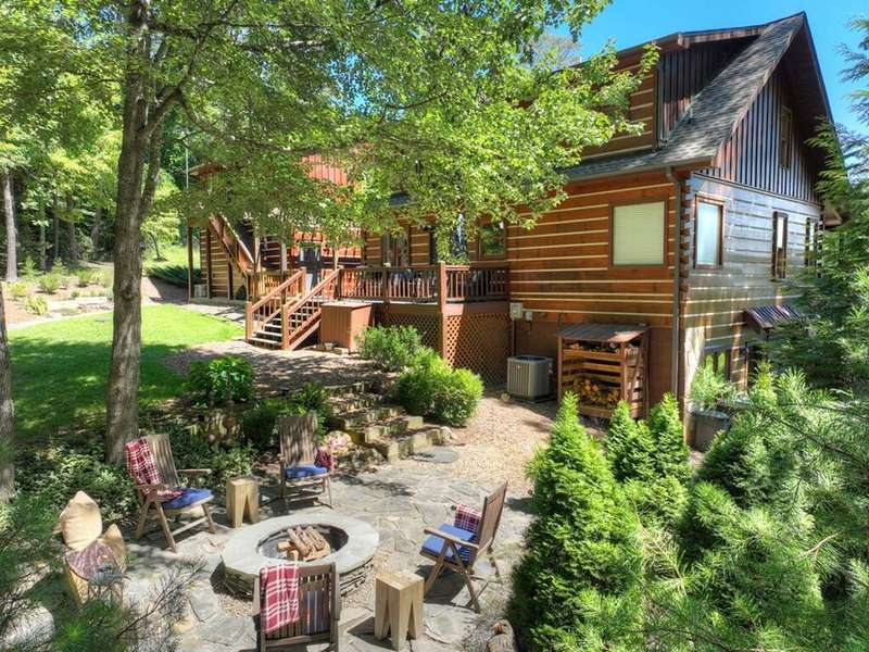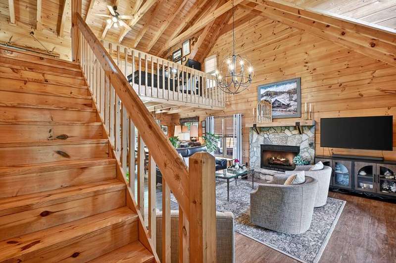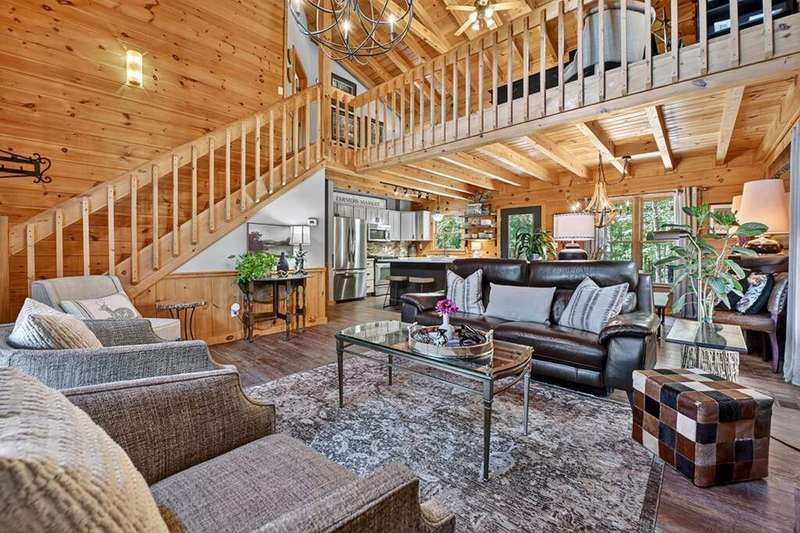 This stunning 3BR/3BA luxury log cabin is the perfect blend of modern rustic elegance and mountain charm, just 5 minutes from downtown Blue Ridge and steps from Lake Blue Ridge. Set on a level, beautifully landscaped lot with exceptional curb appeal, the home features paved access, a circular driveway, and an oversized 2-car garage with a fully finished guest suite above. Between the garage and main home, enjoy a cozy veranda ideal for outdoor entertaining, complete with seating and an inviting fire pit area. Inside, the newly renovated interior boasts soaring natural light, a gourmet kitchen with quartz countertops, a large island, and stylish finishes throughout. The main level includes a king suite with double vanities and a soaking tub, plus a queen suite for guests. Upstairs, a spacious loft provides additional living or sleeping space. The semi-finished basement is stubbed for an extra bathroom and can easily accommodate a bedroom, game room, or home theater. Featuring log chinking for authentic character, this home offers both timeless appeal and modern convenience with a newer roof and HVAC. If you are looking for a charming cabin retreat, this turnkey property is a rare gem in one of Blue Ridge's most sought-after neighborhood.