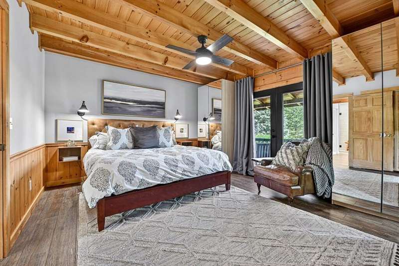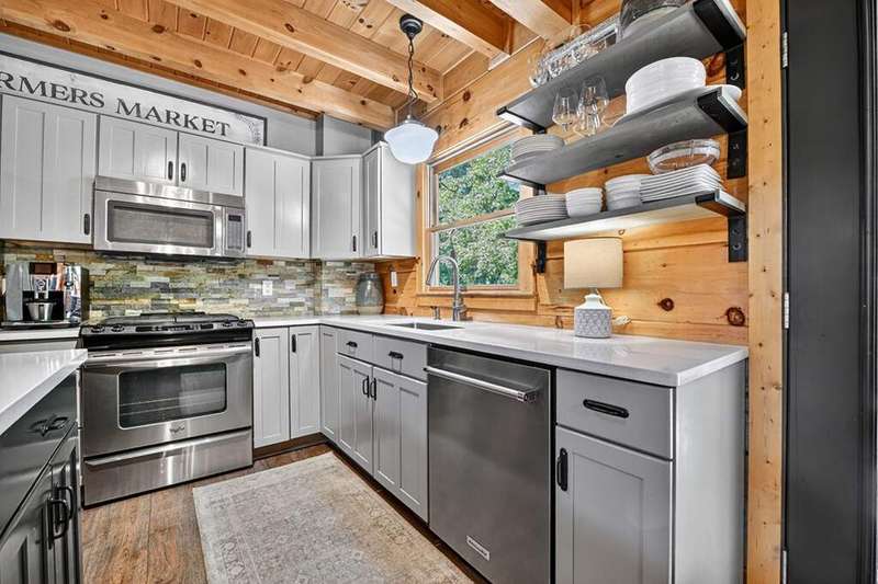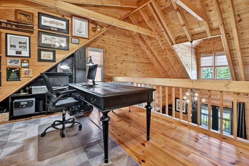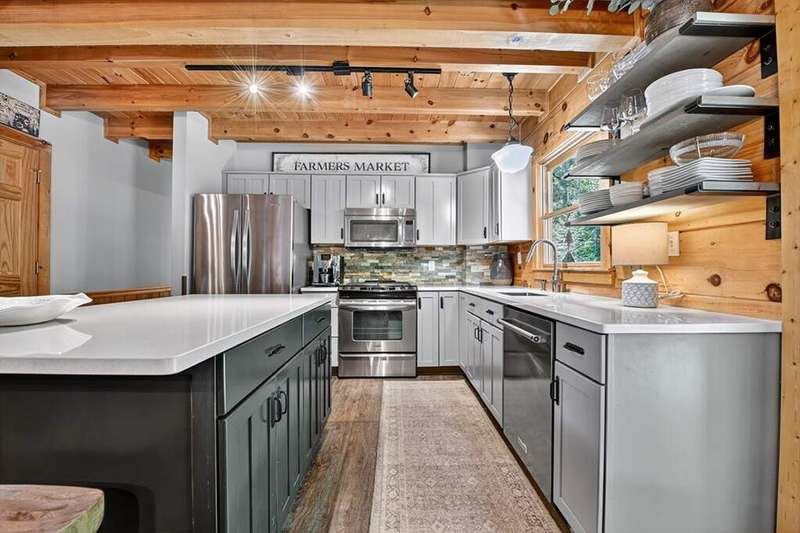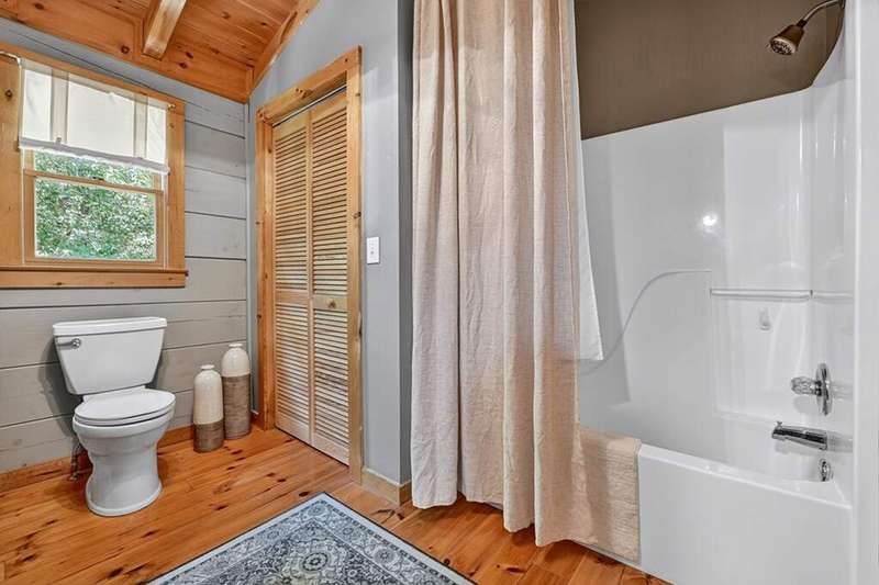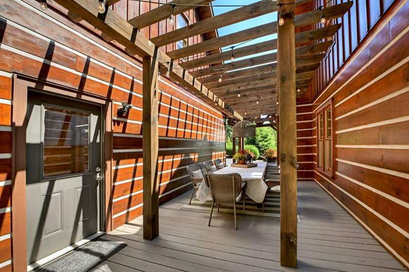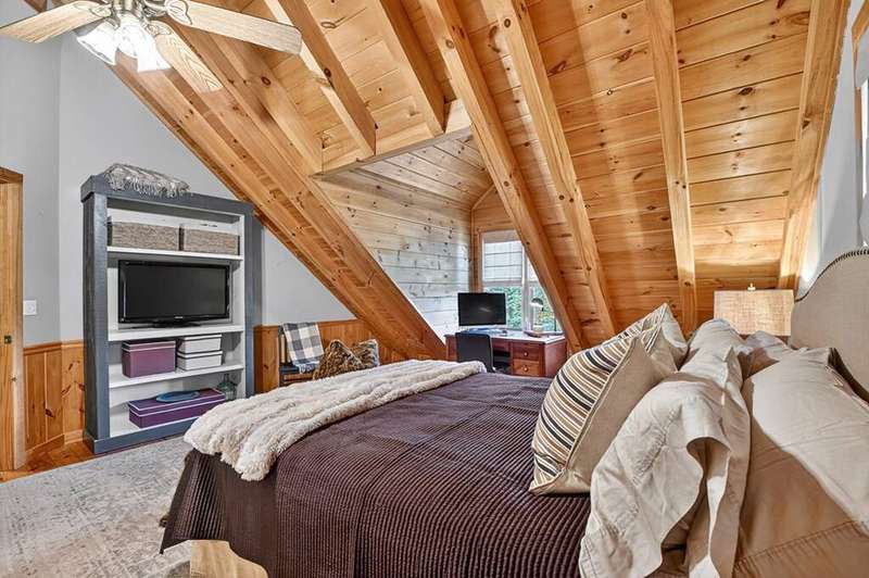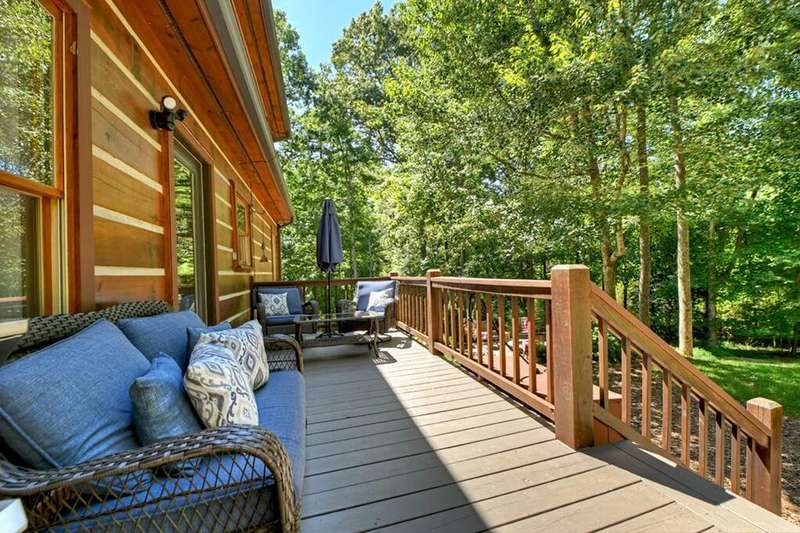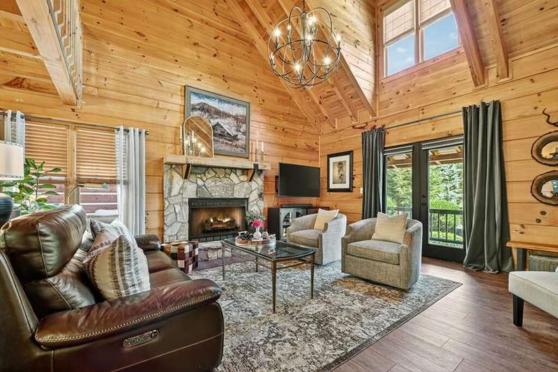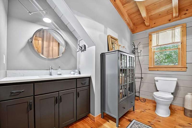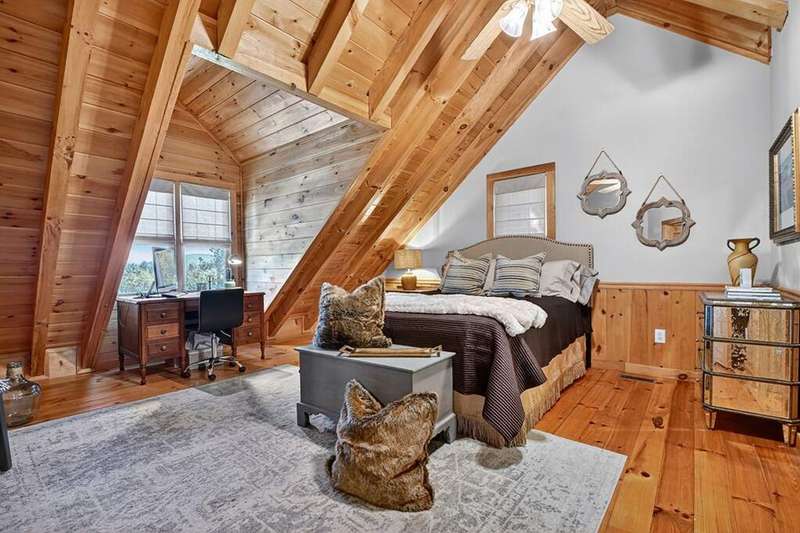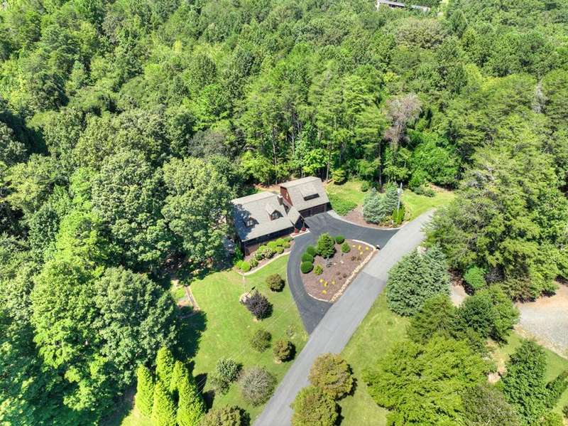 This stunning 3BR/3BA luxury log cabin is the perfect blend of modern rustic elegance and mountain charm, just 5 minutes from downtown Blue Ridge and steps from Lake Blue Ridge. Set on a level, beautifully landscaped lot with exceptional curb appeal, the home features paved access, a circular driveway, and an oversized 2-car garage with a fully finished guest suite above. Between the garage and main home, enjoy a cozy veranda ideal for outdoor entertaining, complete with seating and an inviting fire pit area. Inside, the newly renovated interior boasts soaring natural light, a gourmet kitchen with quartz countertops, a large island, and stylish finishes throughout. The main level includes a king suite with double vanities and a soaking tub, plus a queen suite for guests. Upstairs, a spacious loft provides additional living or sleeping space. The semi-finished basement is stubbed for an extra bathroom and can easily accommodate a bedroom, game room, or home theater. Featuring log chinking for authentic character, this home offers both timeless appeal and modern convenience with a newer roof and HVAC. If you are looking for a charming cabin retreat, this turnkey property is a rare gem in one of Blue Ridge's most sought-after neighborhood.