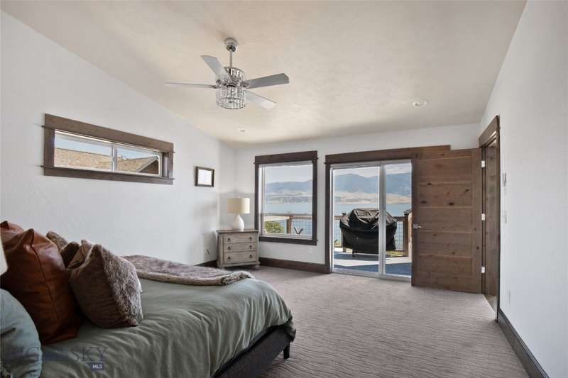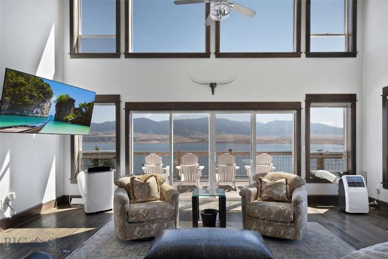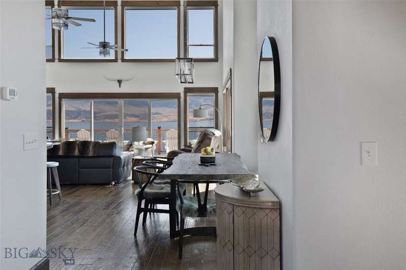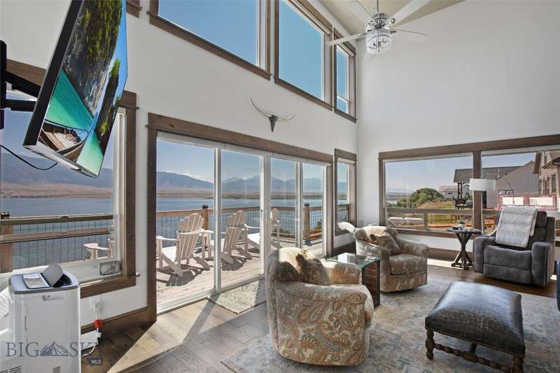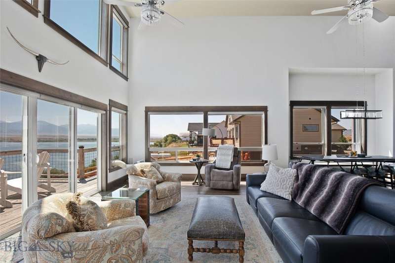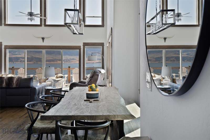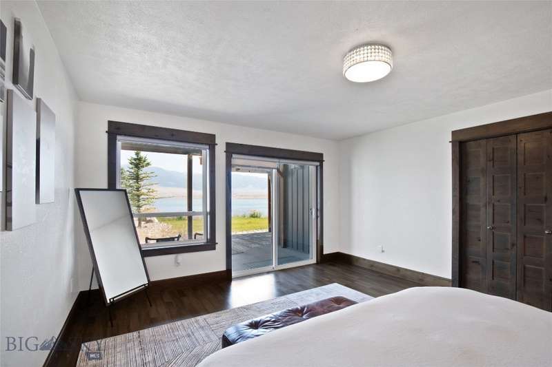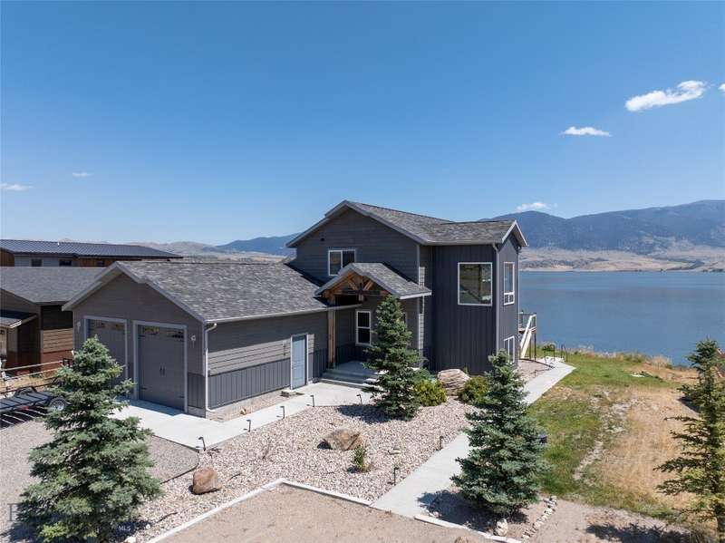 Located on the peaceful side of Ennis Lake, 22 Jordan Lane N offers 92.42+/- feet of prime lakefront location with stunning views of the Madison Range, Lone Peak, and the Jack Creek Canyon. This custom-built home features 4 bedrooms, 3.5 bathrooms, and a total of 4,508 square feet of living space, including a 1,700 square foot apartment with 2 bedroom, 1 bathroom, and a full kitchen on the lower level. The spacious open floor plan includes a chef's kitchen with upgraded stainless steel appliances, an impressive island with seating, a large hidden pantry, radiant in-floor heat, unique light fixtures and many custom upgrades. The living and dining areas are perfect for entertaining, with a cozy modern propane fireplace as a focal point when you are not looking out the floor-to-ceiling windows to the immense view of the lake and mountains. Connect with the views even better from the wide deck that runs the width of the home. The large master suite is located on the main floor and features a soaker tub and walk-in closet and opens to the deck overlooking the lake. A second bedroom with a private bath is located on the upper level. The lower level is ideal for guests or family members and has two additional bedrooms, a full bath, and a second full kitchen, all with direct access to the outdoors and a private entrance. A spacious patio and sidewalk area provide ample space for outdoor living and recreation at this level. The property offers private lake access on a path from the house, and the potential for a dock to be added for water access. There is extra gravel parking for guests. Enjoy a peaceful lakeside retreat with fishing, boating, and breathtaking mountain views. Additionally, the property allows for short-term rentals, making it a versatile investment or recreational property. This home lives well as a primary residence or as an investment property with income potential and is being offered furnished.