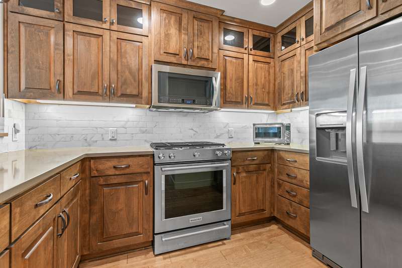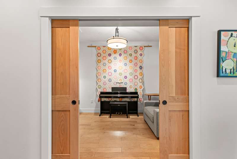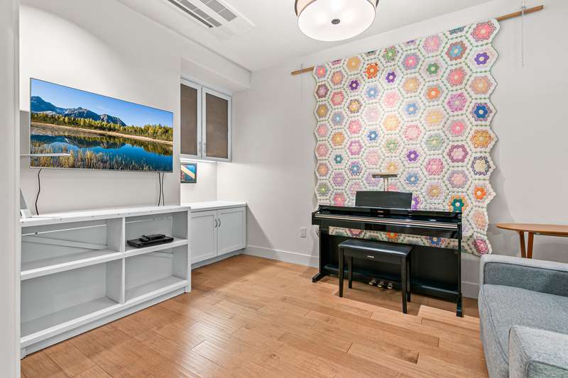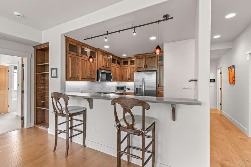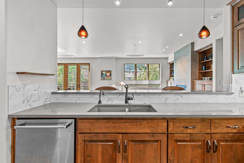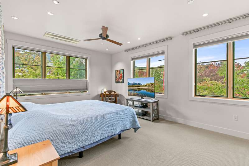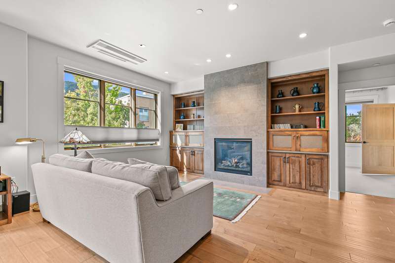 Stylish corner-unit condominium on the second level of Plaza West at First Place in the heart of downtown Ashland. Abundant natural light and airflow with operable wood-wrapped Pella casement windows and French doors, top-down bottom-up cellular shades, solid maple hardwood floors, gas fireplace with limestone surround and built-ins, kitchen with quartz dining bar and counters, tile backsplash, alder wood and glass-fronted cabinets with soft-close drawers and doors, stainless double sink and appliances including five-burner gas range with convection oven, low-profile ceiling-integrated ductless mini-splits, versatile media room or potential guest bedroom, half bath powder room, laundry room, and spacious primary bedroom with full ensuite bathroom, double vanity, jetted tub, shower, and water closet. Gated entrances and elevator access from private garage with dedicated parking and storage. Security system with video surveillance. Certified LEED Platinum. Inquire for details!