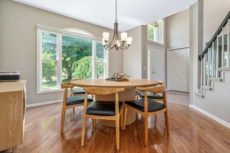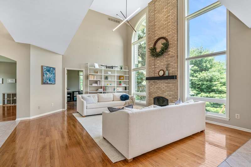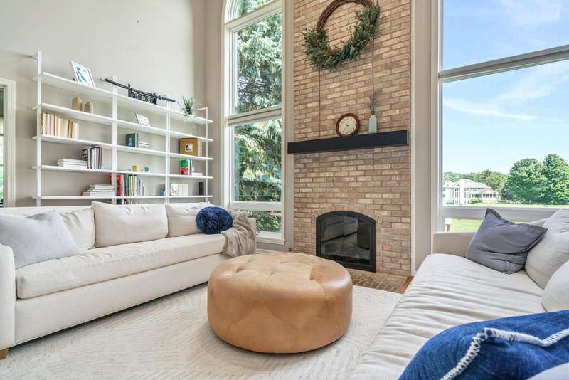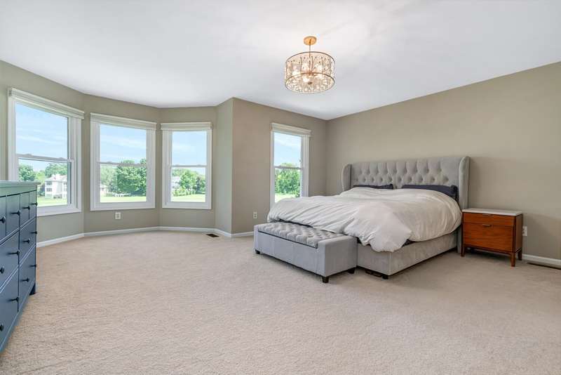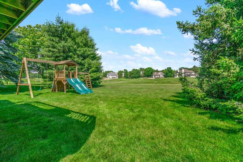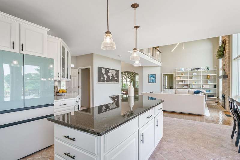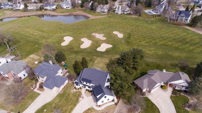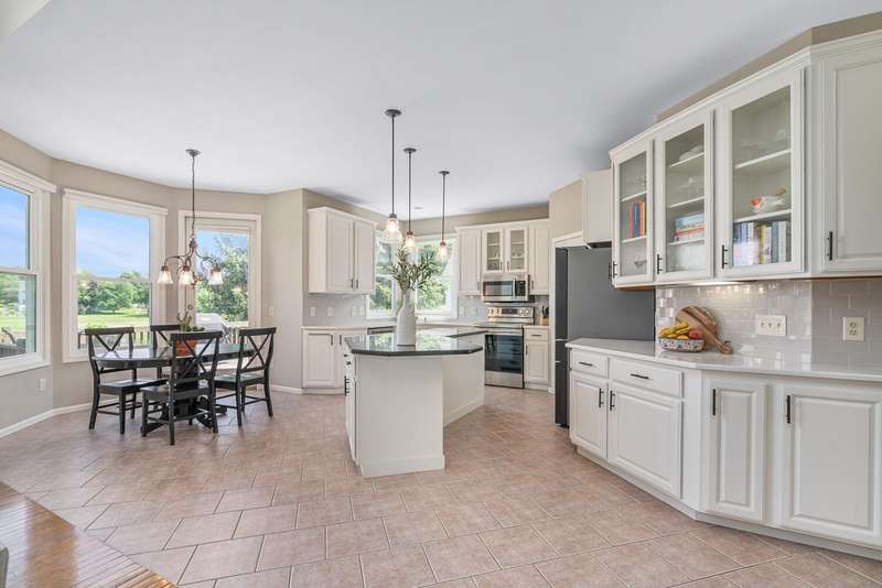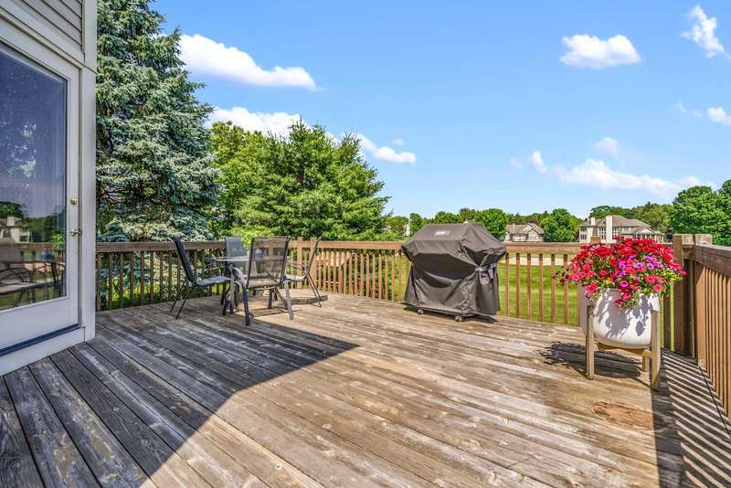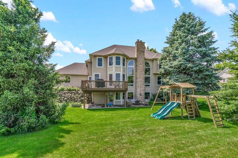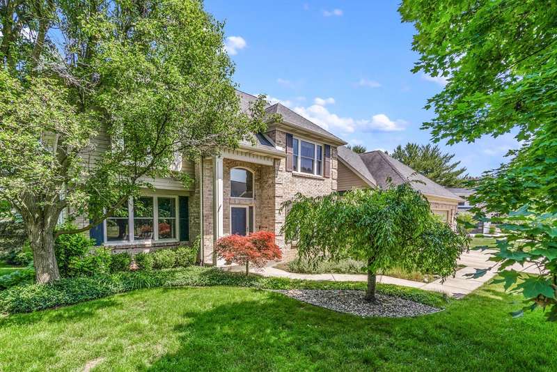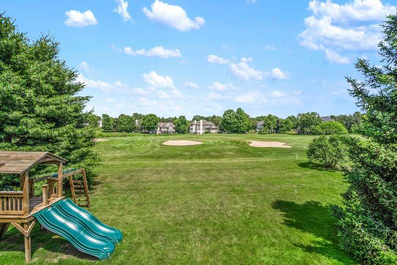 Enjoy serene cul-de-sac living in the highly sought-after Woodbridge Hills neighborhood. This spacious 5-bed, 3.5-bath home offers over 3,860 finished sqft and sits on the 3rd fairway of The Moors Golf Club with picturesque views throughout. A double-height great room with a wall of windows and hardwood floors fills with natural light from new Pella windows (2024). The open layout flows from the great room to a kitchen with quartz counters, tile backsplash, SS appliances, and deck access. Main floor includes formal dining, office/den, laundry, and half bath. Upstairs: a catwalk overlooks the living space and leads to a private primary suite with 2 walk-in closets, soaking tub, shower, and double vanity, plus 3 large bedrooms and full bath. The finished walk-out basement includes a guest suite, full bath, rec room, snack bar, and patio. Extras: water heater (2018), humidifier (2021), water softener (2022), RO system (2020), EV charger, 3-car garage, and in-ground sprinklers.