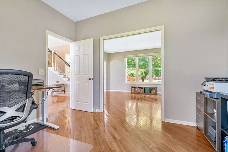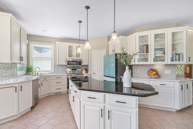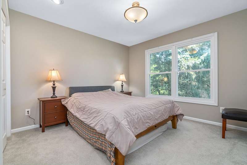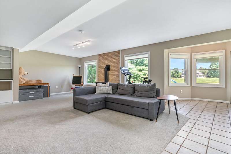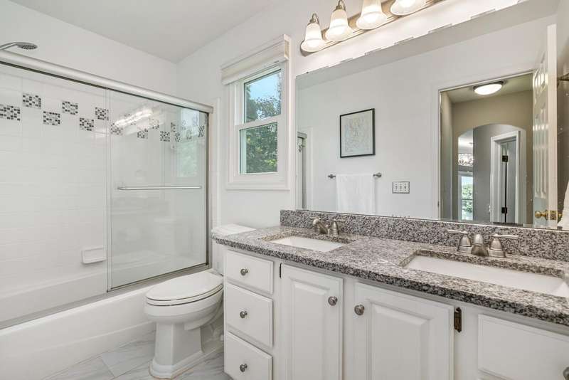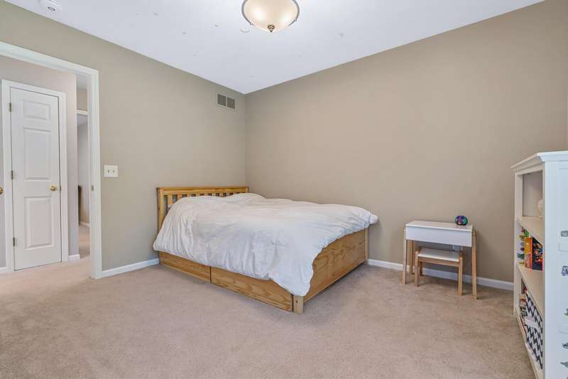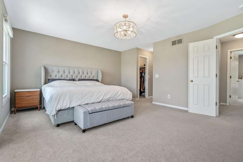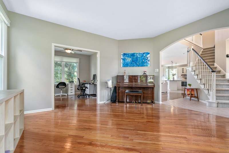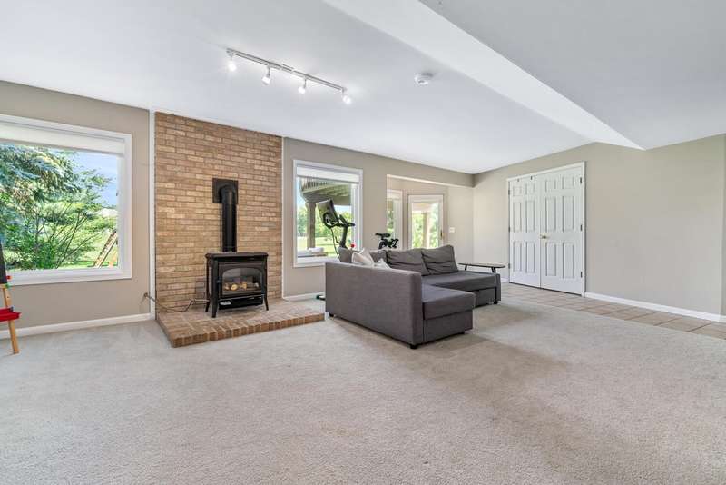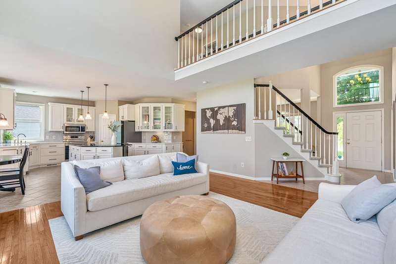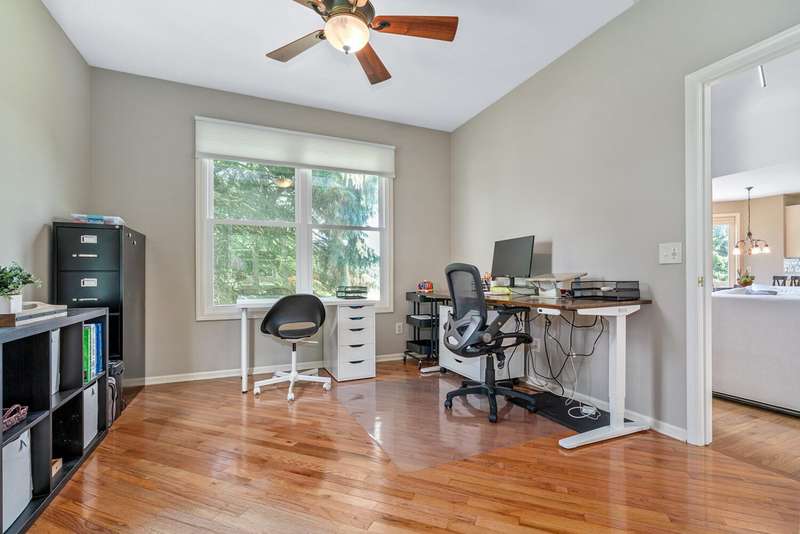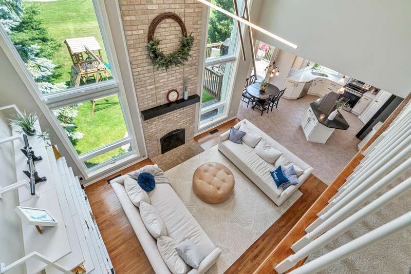Enjoy serene cul-de-sac living in the highly sought-after Woodbridge Hills neighborhood. This spacious 5-bed, 3.5-bath home offers over 3,860 finished sqft and sits on the 3rd fairway of The Moors Golf Club with picturesque views throughout. A double-height great room with a wall of windows and hardwood floors fills with natural light from new Pella windows (2024). The open layout flows from the great room to a kitchen with quartz counters, tile backsplash, SS appliances, and deck access. Main floor includes formal dining, office/den, laundry, and half bath. Upstairs: a catwalk overlooks the living space and leads to a private primary suite with 2 walk-in closets, soaking tub, shower, and double vanity, plus 3 large bedrooms and full bath. The finished walk-out basement includes a guest suite, full bath, rec room, snack bar, and patio. Extras: water heater (2018), humidifier (2021), water softener (2022), RO system (2020), EV charger, 3-car garage, and in-ground sprinklers.