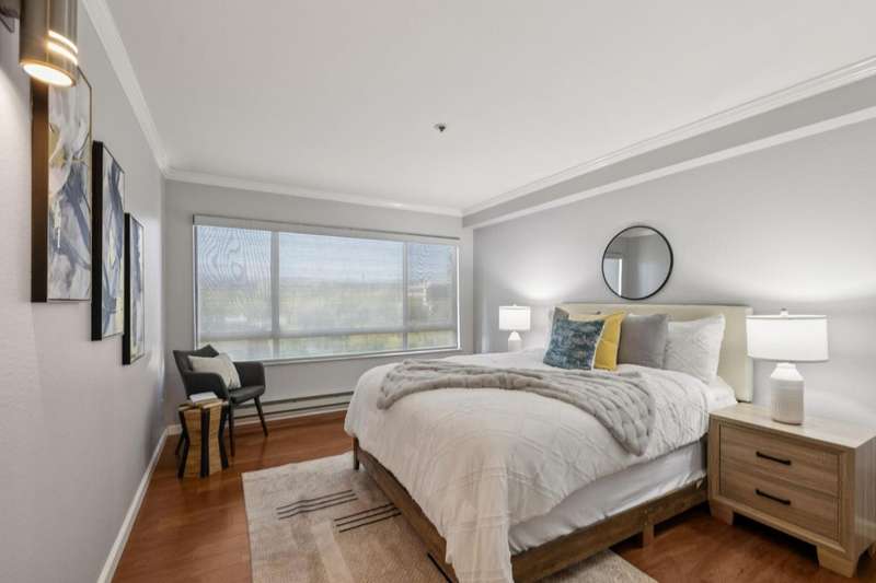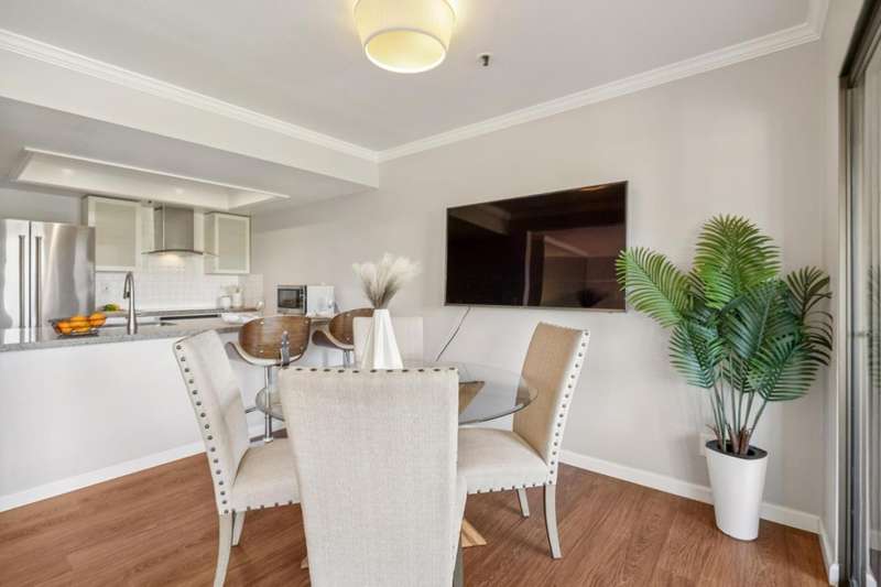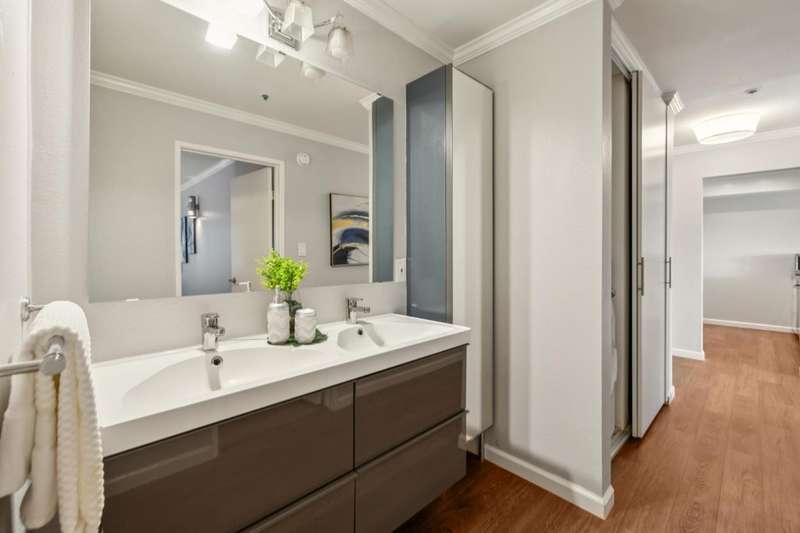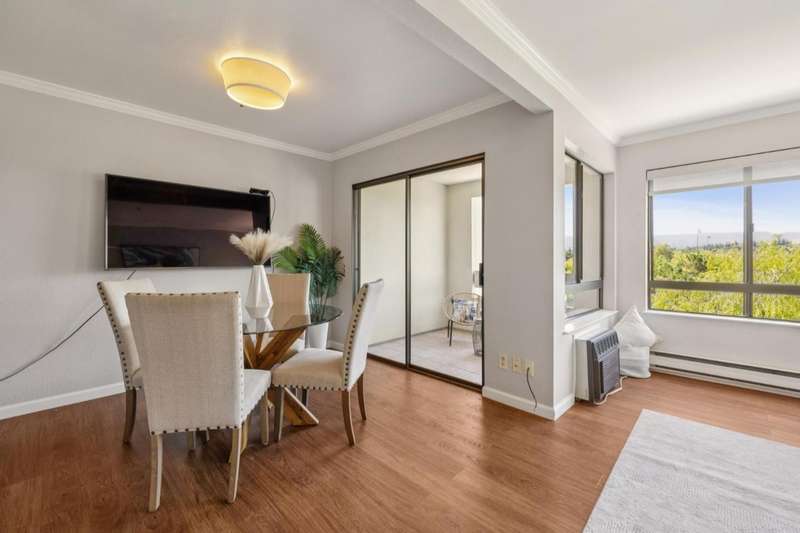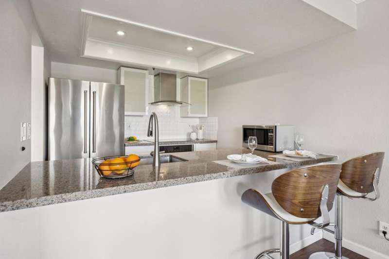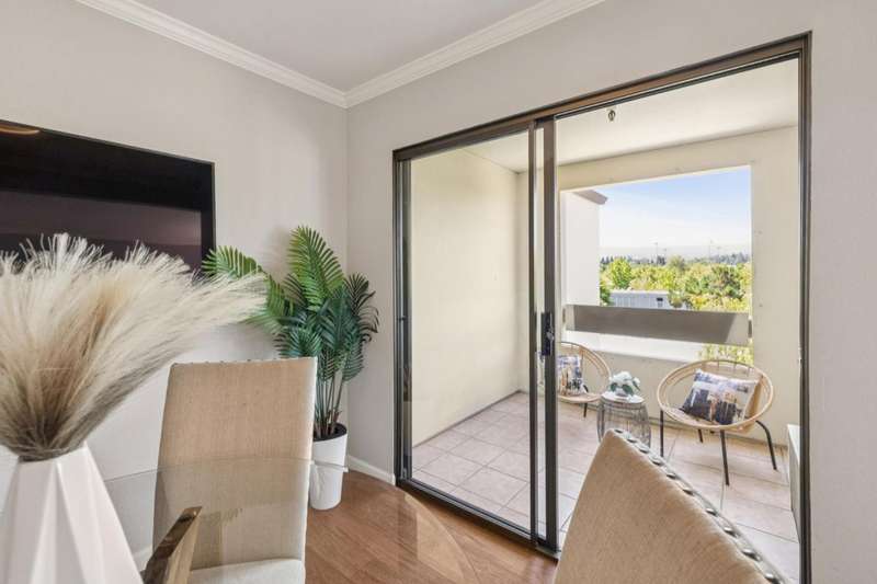 Discover refined modern comfort in this thoughtfully renovated home at 410 Sheridan Ave. This top-floor unit offers picturesque views of the foothills and seamlessly blends style, comfort, and convenience within a sought-after complex. Highlights include wood flooring, custom cabinetry, built-in appliances, natural stone countertops, and designer glass tile in the bathroom. The gourmet kitchen, adorned with white cabinets and stainless steel appliances, complements the convenience of in-unit stacked laundry. The primary bedroom features customized closets, while the dining area illuminated by a large window and a glass door opening to an airy balcony -- welcomes abundant natural light. Building amenities include an elevator, a heated swimming pool, a meeting room, and secure underground parking with assigned spaces. This prime location offers easy access to a year-round farmers market, top-rated dining, cafes, grocery stores, Caltrain, and Stanford University. Children may attend acclaimed schools such as Greene Middle and Palo Alto High (buyer to verify eligibility)