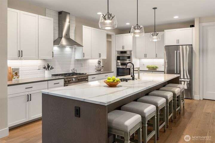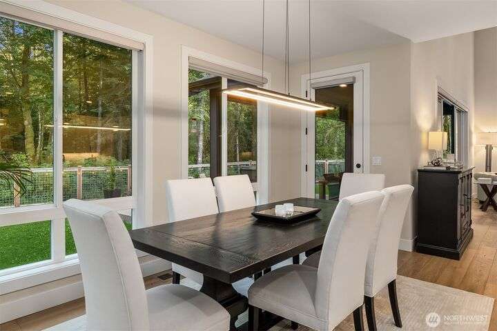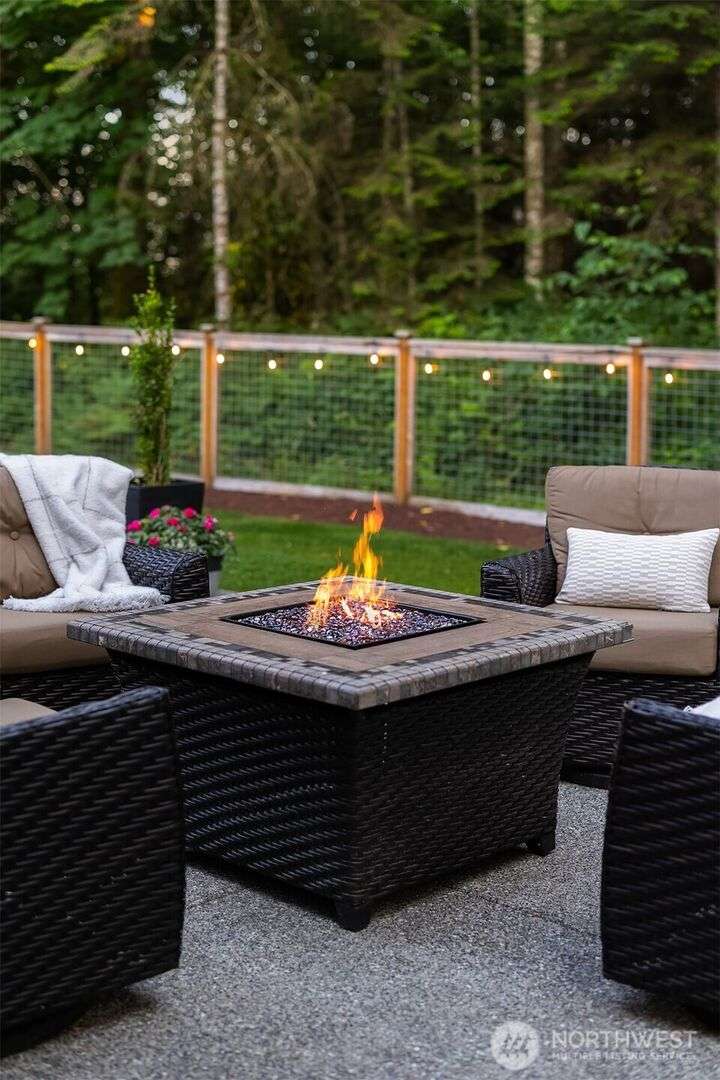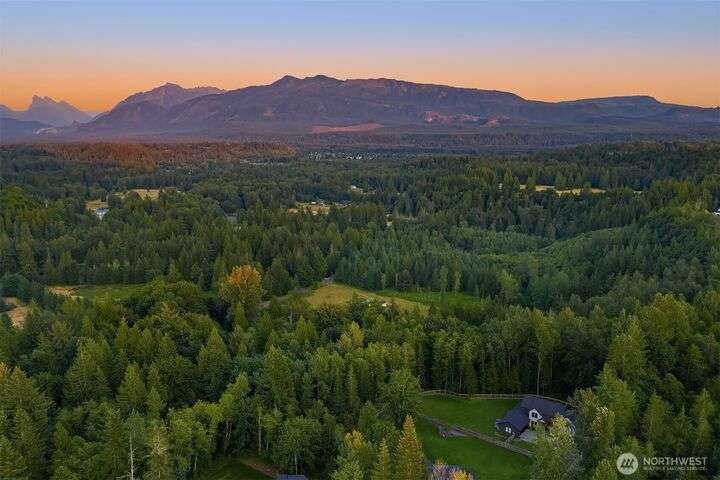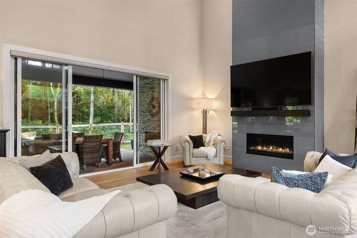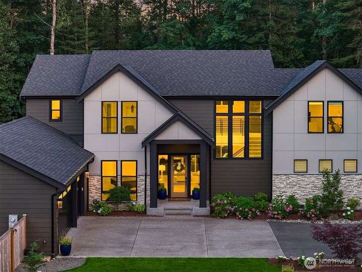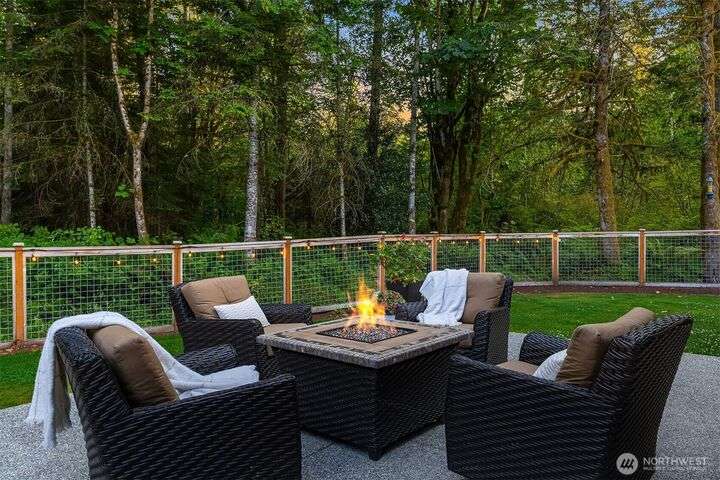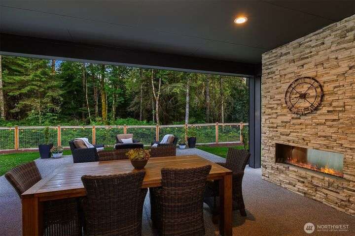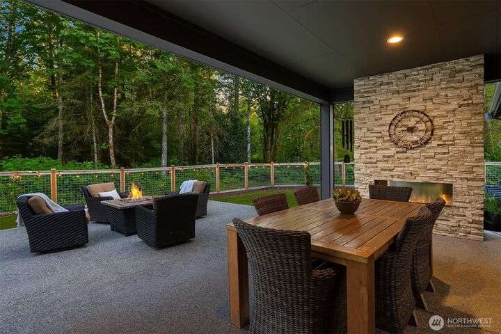 Tucked away in a private enclave, this stunning retreat sits on 1.25 acres—offering room to dream. Built just two years ago with high-end finishes, gorgeous hardwoods, and top-tier appliances, every detail is stunning. Thoughtful floorplan features an impressive great room with a floor to ceiling fireplace, spacious main-floor primary suite with a 5-piece spa bath and a junior suite, plus three additional bedrooms and a large bonus room upstairs. Soaring ceilings, designer lighting, and a gourmet kitchen create an open, airy vibe. Great room flows effortlessly out to the covered patio with fireplace—perfect for year-round enjoyment. With total privacy, level fenced yard, and space to relax, this home offers the best of Northwest living.