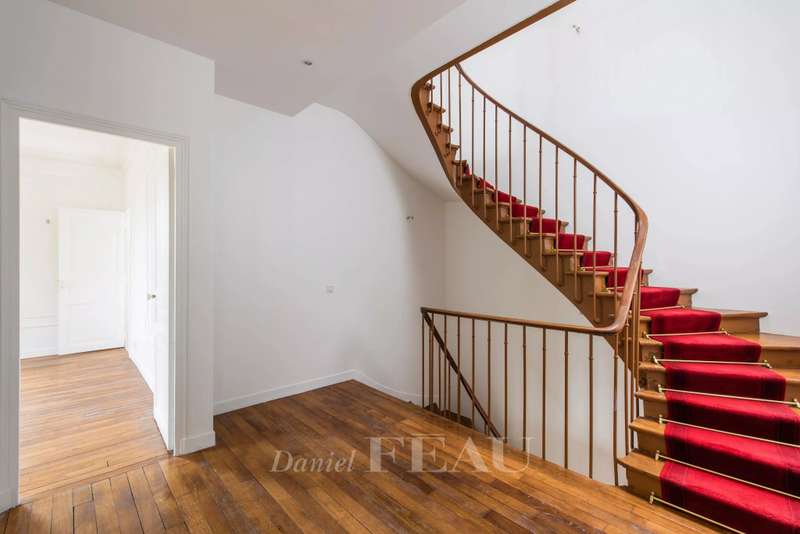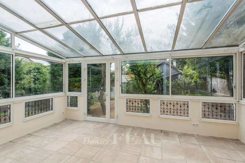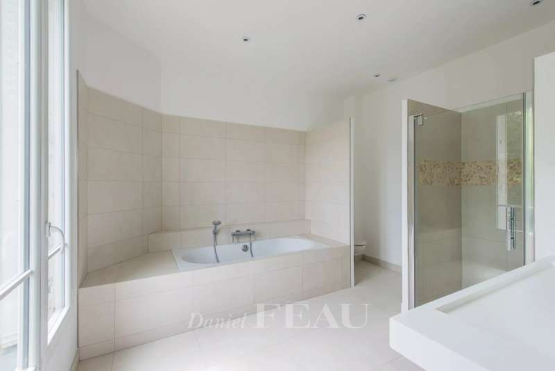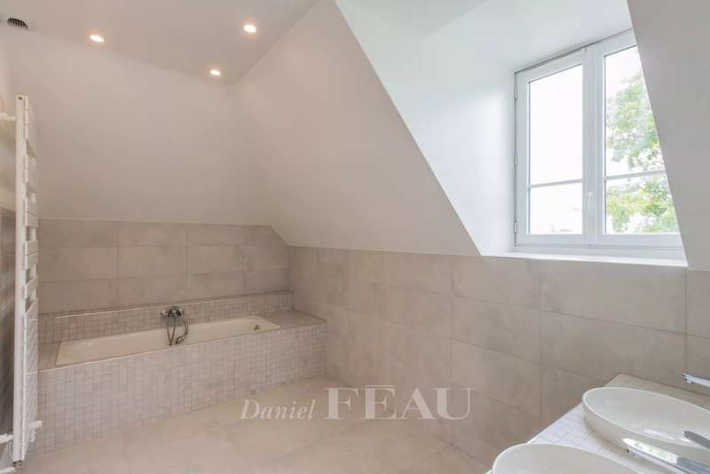 This elegant millstone-built property in a leafy environment near the station offers 366 sqm of floor space and about 260 sqm of living space. Set in a 969 sqm plot, it includes a double living/reception room with a conservatory opening onto the garden, a fitted kitchen, and a study. Upstairs are two bedrooms with bathrooms and dressing rooms. The top floor comprises a bedroom with a shower room, two further bedrooms and a bathroom. Three further bedrooms, a shower room, a storage room, a utility room and a boiler room are on the entresol. With a two-car garage and two outdoor parking spaces.