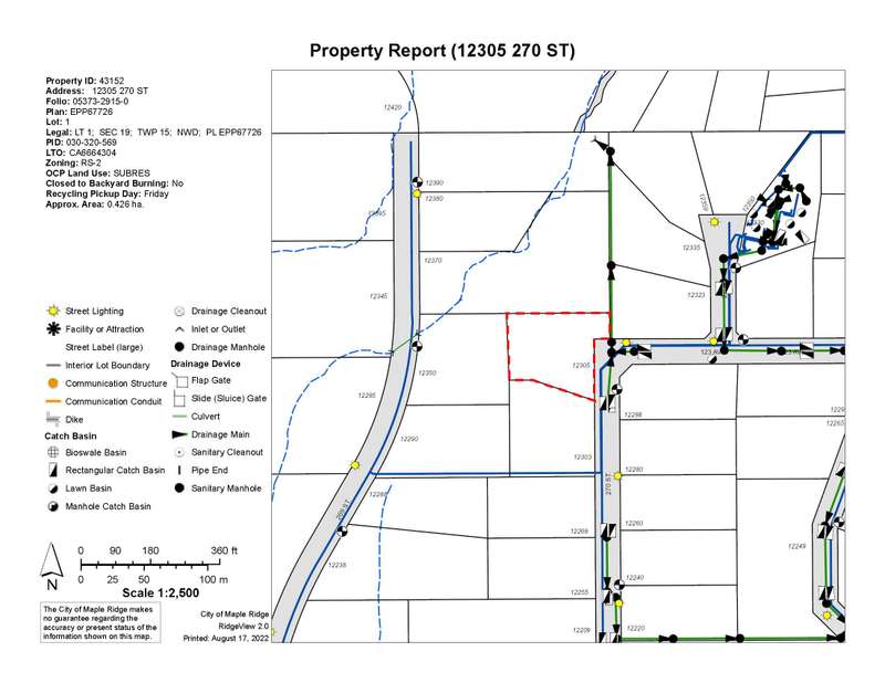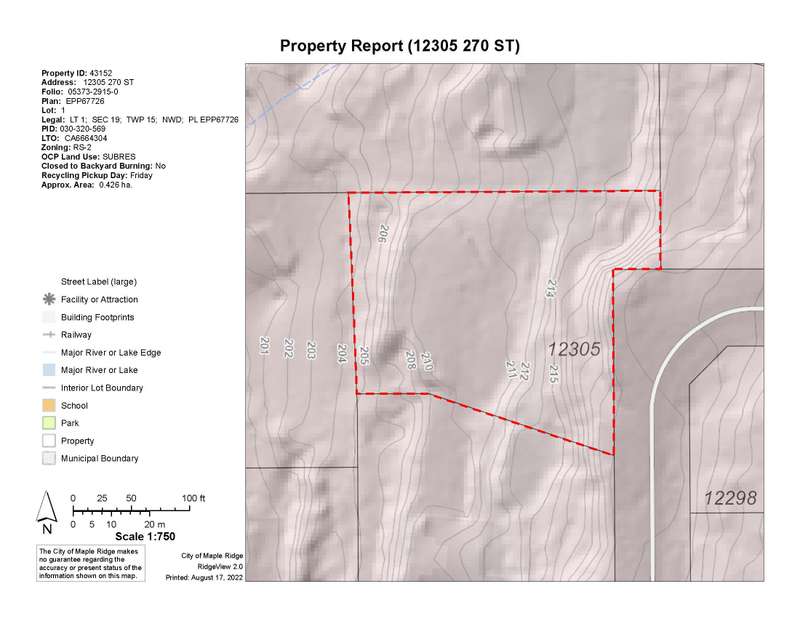 Here is your opportunity to build your dream home in one of the most stately and prestigious areas of Maple Ridge. This 1.05 acre rare gem sits among some stunning, custom, designed estate homes and is waiting for your ideas. No watercourse on property, it is not flood plain, not in ALR, there is city water available at the lot line and there is no shared sewer treatment system. (On site septic location has been approved). The lot is cleared with hard pan gravel driveway to access the building site. BONUS: no thru road limited traffic as well as West Exposure to lend way to incredible sunsets. Out of town enough but also close to everything you need including the sought after private Meadowridge School. Don't pass up this opportunity. Call your realtor for an information package!