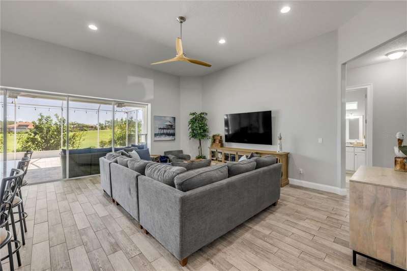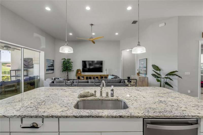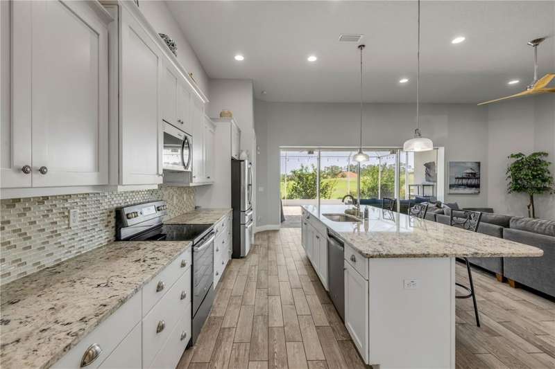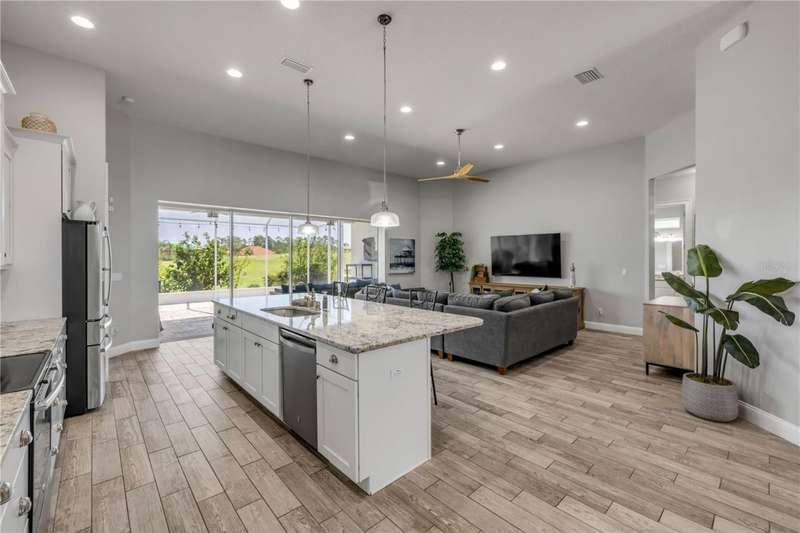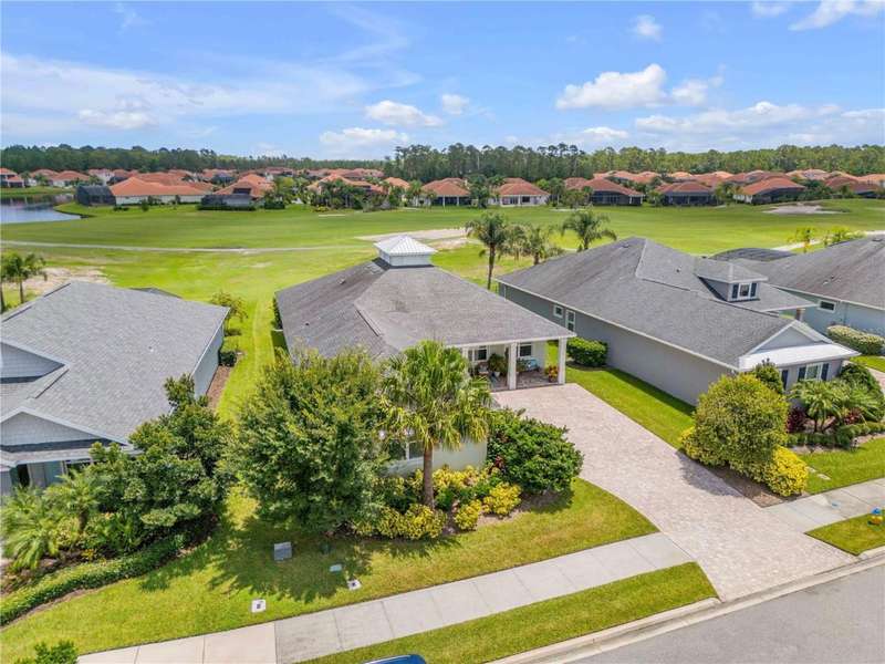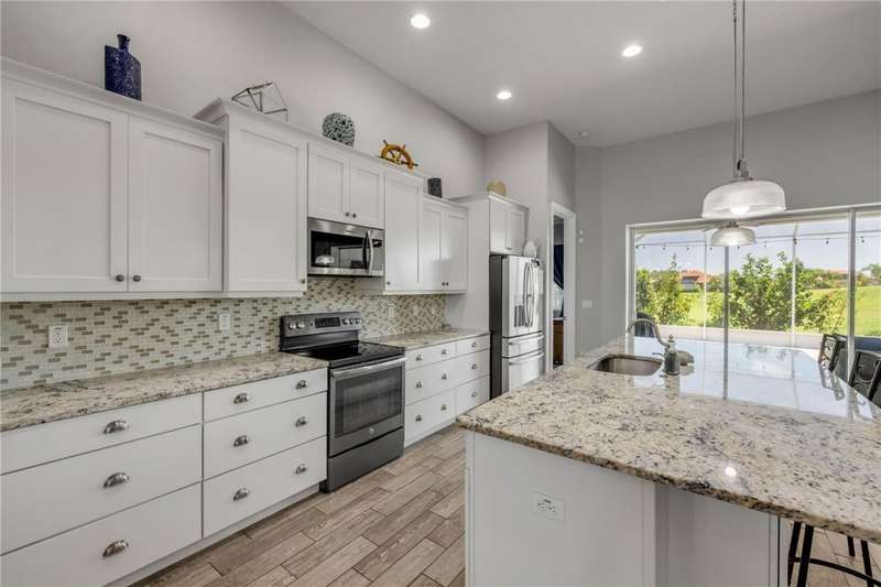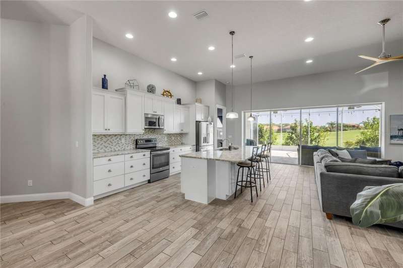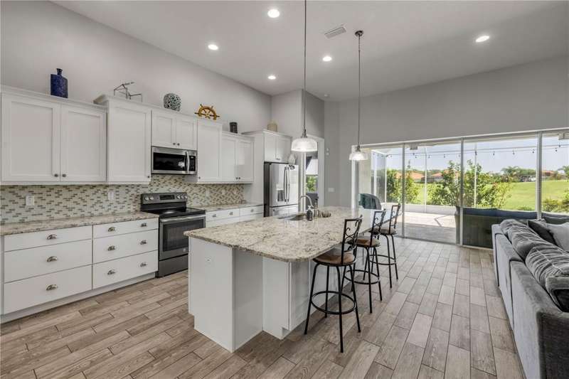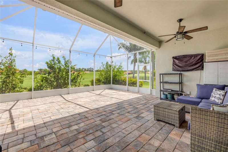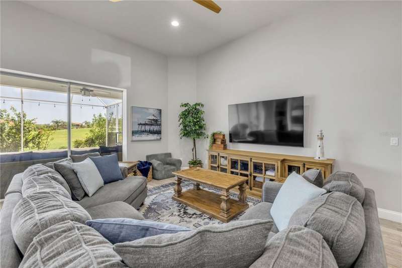 Welcome to 2916 Bella Fore Terrace, a stunning 4-bedroom, 2-bath home advantageously situated on the 10th hole of the Venetian Bay Golf Course within the exclusive gated community of Portofino Gardens. This residence combines luxury, comfort, and low-maintenance living in an ideal setting. A welcoming front porch invites relaxed afternoons and warm greetings, leading into an interior featuring elegant tile flooring throughout the main living areas and plush carpeting in the bedrooms. The flexible fourth bedroom can serve as a home office, media room, or guest retreat to suit your needs. The spacious primary suite offers peaceful golf course views and a large en-suite bath designed for comfort and convenience, featuring an oversized double sink vanity, a walk-in shower, and a relaxing soaking tub. At the heart of the home, a gourmet chef's kitchen boasts an oversized granite island ideal for casual dining, entertaining, or meal preparation. The laundry room with built-in cabinetry adds functionality and extra storage. Sliding glass doors open to a private outdoor oasis-an oversized, pavered, and fully screened-in patio with panoramic golf course views, perfect for BBQs, morning coffee, or evening cocktails. The oversized 3-car garage provides ample space for vehicles, storage, and a golf cart, offering easy access to the course and neighborhood. Additional highlights include a newer AC and water heater, enhancing efficiency and comfort. Nestled within Portofino Gardens and Venetian Bay, residents enjoy a country club lifestyle with a thriving golf community, a vibrant Town Center featuring events, dining, nature trails, parks, and so much more.