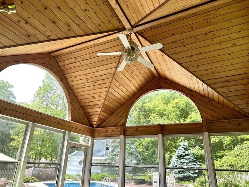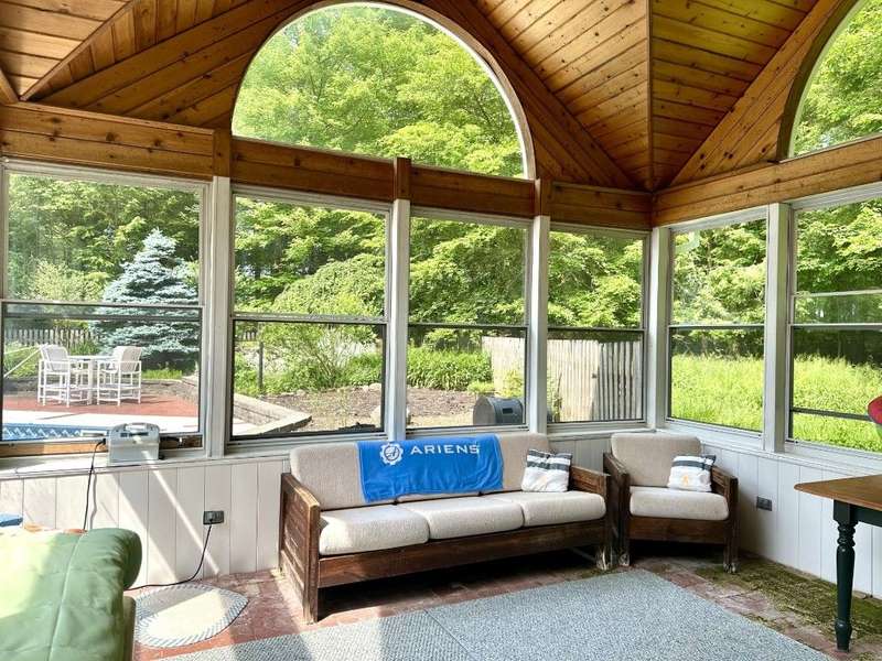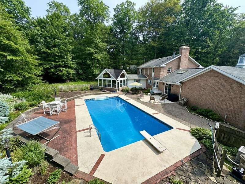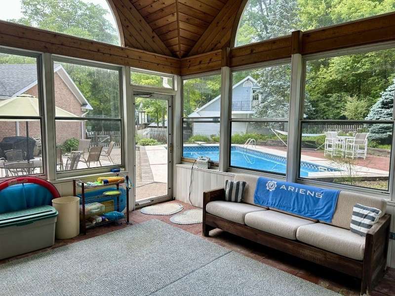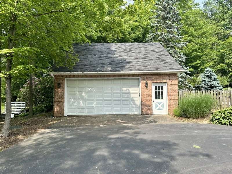 NORTH END COLONIAL IN THE PRESTIGIOUS EDGEWOOD NEIGHBORHOOD. This beautiful brick home features 4 bedrooms and 3 1/2 bathrooms. The house boasts both formal living and dining rooms perfect for entertaining. A main floor office offers a quiet space for work or study. The family room, highlighted by a stone fireplace, has a great view of the pool area. The fully applianced kitchen includes built-in buffet and dining area as well as a large center island. The large sunroom leads directly to the pool area, making it the ideal spot for relaxing and enjoying the surroundings. This property includes a 2 car attached garage as well as a 2 car detached garage complete with 2nd floor loft. All this and a beautiful natural setting adjacent to the golf course. THIS HOME HAS LOTS TO OFFER!