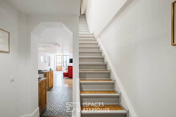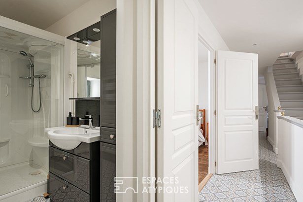A laundry room completes the ground floor. The wooden staircase with its play of color and perspective leads to a first landing serving three bedrooms, one of which is over 17 m2. This sleeping area shares a comfortably sized bathroom. The second landing leads to a space offering development potential, where the creation of a studio is perfectly possible.