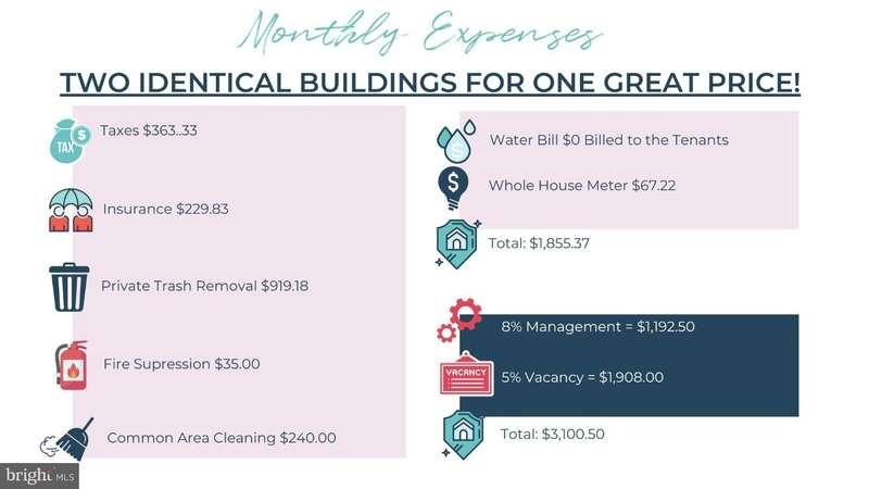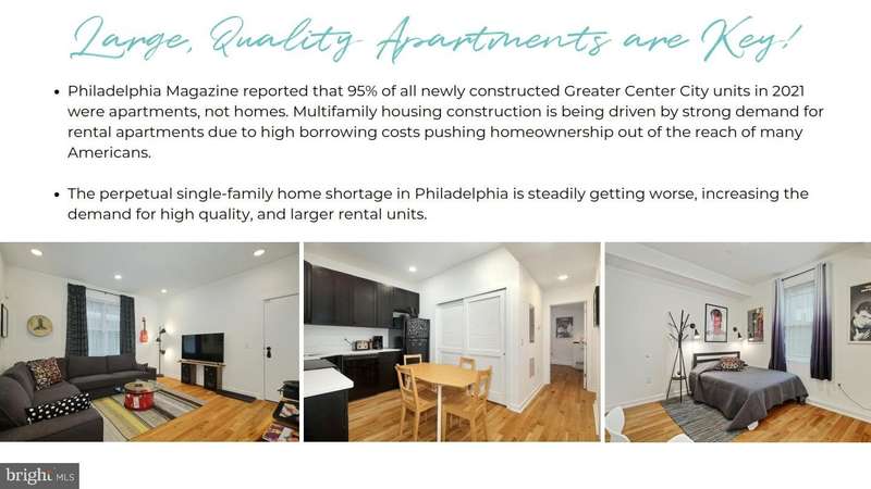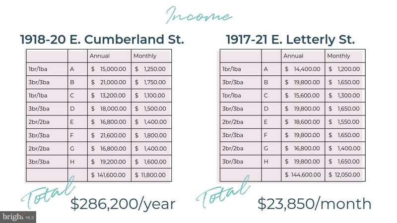 Snap up this incredible fully occupied, cash flowing portfolio. $4,500,000 includes three self-sufficient buildings comprised of 22 units total. Two are identical, 5 year old, 8-unit buildings, one is a 2 year old 6-unit building. Total gross annual rental income is $405,540. 1918-20 E Cumberland and 1917-1921 E Letterly St. are each 7,200 SF with 5 years of full tax abatement remaining. Annual taxes are based on land value only until the abatement ends. Expenses include taxes, rental licenses, private trash removal, fire suppression, common area cleaning, whole house electric meter, and insurance. The apartments are 1, 2, and 3 bedrooms. There is a bathroom for every bedroom. The 3-BR units (there are 3) have 3 bathrooms, the 2-BR units (there are 3) have 2 bathrooms. The 1-BR units (there are 2), of course, have 1 bathroom. Each unit has over-sized windows, hardwood floors, custom made cabinets and private, in unit laundry facilities. The building is all electric (no gas). Tenants are billed for electricity, water, and any renewals will be billed for private trash removal. Each unit was hard wired for cable during construction. East Kensington is a neighborhood bordering Olde Richmond, Fishtown, and Norris Square. Along Frankford Avenue and tucked into the neighborhood are amenities such as: curated vintage stores, hip boutiques, wellness and fitness studios, salons, restaurants, bars, breweries, and friendly coffee shops. Proximity to the Market-Frankford line, several bus lines, I-95 exits make it easy for residents and commuters to get in and out of town. 10 MORE REASONS TO BUY THIS MULTI-UNIT NOW: 1! Construction costs are at an all-time high. According to a report on construction cost data tracking firm Gordian, cost of materials jumped an average of 19% since 2020. This property is cheaper to buy than to build. 2! The housing shortage. According to U.S. News, after hitting a 30-year high in December 2021, permit issuances for single-family homes declined steadily at an average drop of over 50%/year. 3! This location is experiencing rapid growth. Multifamily construction permits shot up to a 30-year high in December 2021. By April 2023, that figure plunged 75%. 4! Theres a tunicate on supply of single-family homes. The existing inventory, and the inventory currently under construction may be everything available to priced-out-buyers and new residents for some time. 5! Affordability. Philadelphia Magazine reported that 95% of all newly constructed Greater Center City units in 2021 were apartments, not homes. Multifamily housing construction is being driven by strong demand for rental apartments due to high borrowing costs. 6! New rentals large enough for families are rare. The perpetual single-family home shortage in Philadelphia is steadily getting worse, increasing the demand for high quality, and larger rental units. 7! Its 4 years old and 100% to code. 8! Tax Abatement! 9! Fully occupied at market rates. 10! All licenses, zoning, expenses and leases are fully documented.
