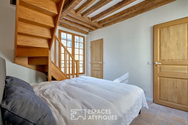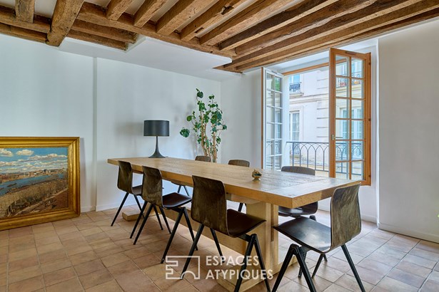 Located near the Place des Vosges, in the heart of the Marais district, this 138.46 sq m (89.26 sq m Carrez law) duplex occupies the top two floors of an 18th-century building.
