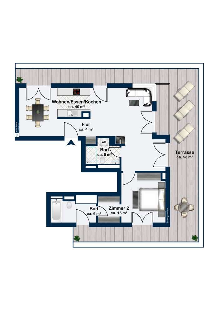 This luxurious 2-room top-floor apartment is located in an ensemble around a listed post office building and has a living space of approx. 97 m². The spacious living and dining area as well as the floor-to-ceiling panoramic windows make the apartment particularly bright and convey a feeling of freedom and lightness. A special feature of the property is the spacious roof terrace, which extends around the entire apartment and is therefore accessible from every room. It offers a magnificent view of the Teltow Canal and plenty of space to relax on warm summer evenings or host guests for a barbecue. The spacious living and dining area becomes the central point of the apartment and in the winter months the fireplace provides a cozy, warm atmosphere. The bedroom impresses with its en suite bathroom, which is equipped with a bathtub. The bathroom is fitted with high-quality brand fittings and also has access to the terrace. The second shower room, which is accessible from the hallway, is also luxuriously equipped and has a washing machine connection. Real wood parquet flooring has been laid throughout the apartment. The location of the property speaks for itself: the modern apartment is located in a new building attached to the listed Old Post Office on Hindenburgdamm. An ensemble of 48 modern apartments and commercial space, spread over four buildings, has been created on the Postufer, directly on the Teltow Canal. In the middle of the ensemble is a sheltered inner courtyard with lively flora. The residential area offers excellent public transport connections as well as numerous shopping facilities, restaurants and bars in the immediate vicinity. In summary, this is an exceptional property with a unique history that offers an ideal combination of cultural heritage and modern comfort. The apartment is perfect for people who prefer something special and are looking for a stylish "place to stay" in a central location.