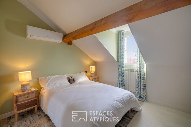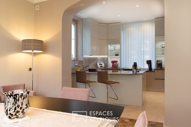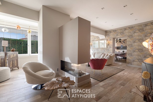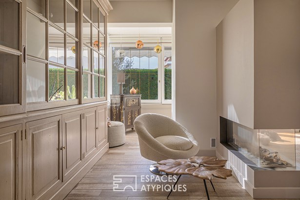 Behind its refined facade, the interior volumes are elegantly displayed. High ceilings and omnipresent light give the whole a prestigious atmosphere. The living room, decorated with a modern double-sided fireplace, invites conviviality, while the fully equipped kitchen and adjoining dining room extend the living spaces. Five large bedrooms, two bathrooms with shower and a shower room complete this harmonious ensemble.