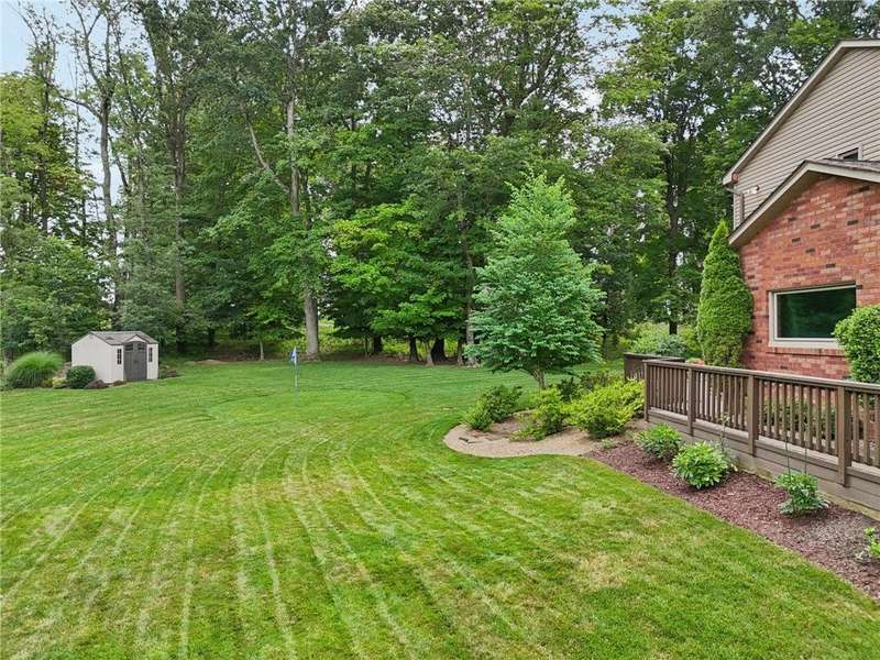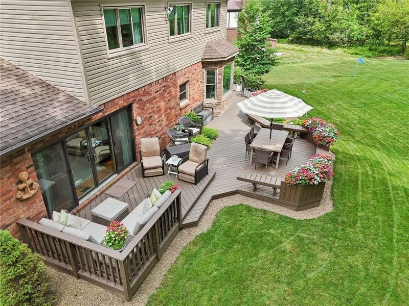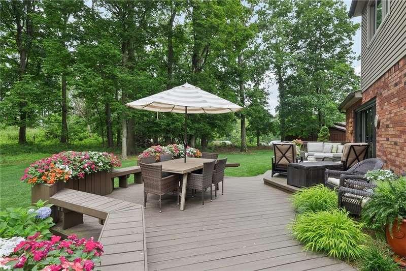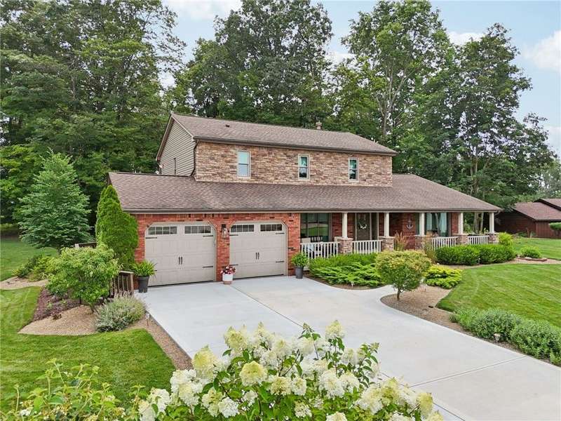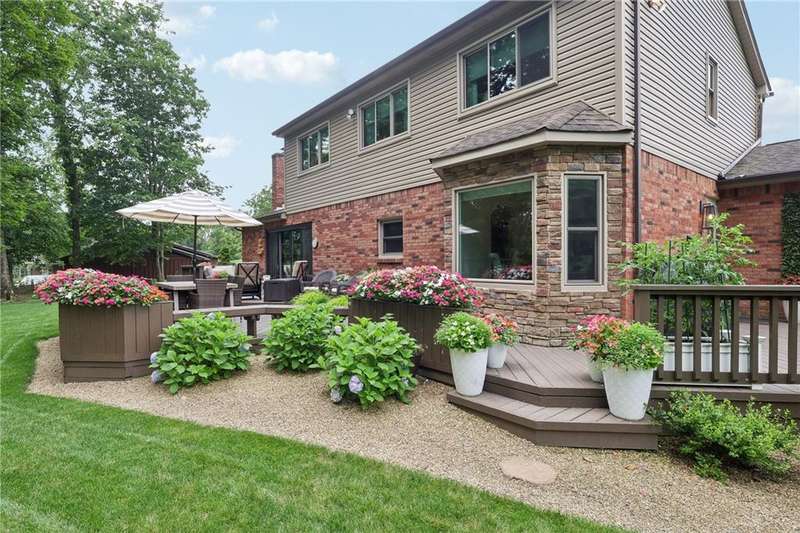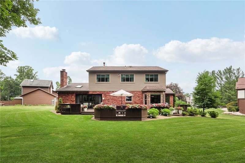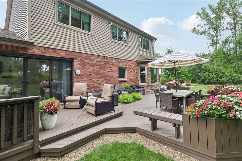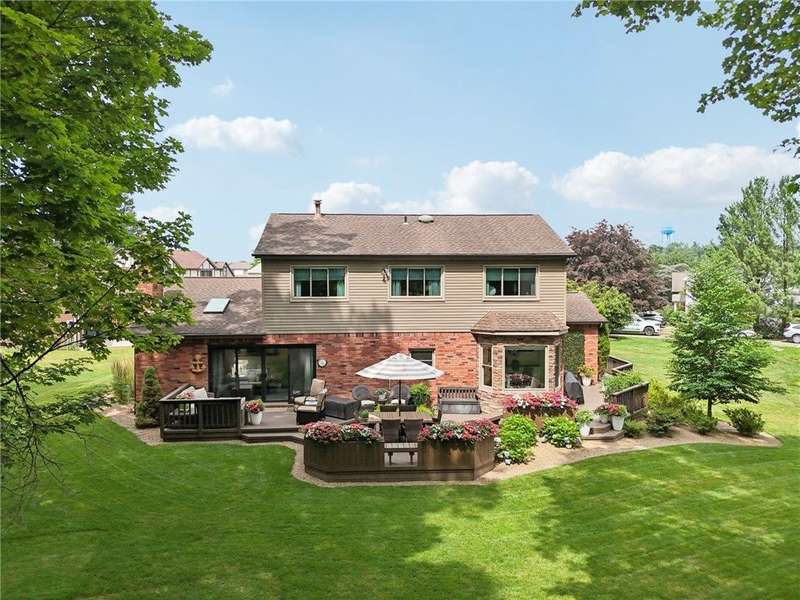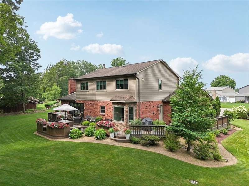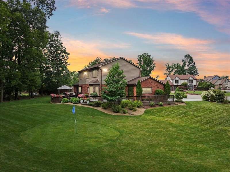 Absolutely stunning & impeccably 4-bedroom home on cul-de-sac in Penn Township! Move-in ready gem w/gleaming hardwood floors & thoughtful updates throughout. Spacious covered front porch w/seating leads to welcoming foyer w/leaded glass front door, guest closet, & plank tile flooring. Formal living w/crown molding. Dining room w/elegant crown molding & classic wainscoting. Chef's dream kitchen w/stainless steel appliances, quartz countertops, white subway tile backsplash, island w/seating, recessed lighting, & charming breakfast nook w/coffee bar & bay window & granite counter. 1st floor laundry w/convenient access to rear patio. Family room w/vaulted ceiling & skylight, brick fireplace flanked by built-ins, & sliding glass doors that open to an expansive rear deck w/seating, dining & built-in flower beds. Beautifully landscaped level backyard w/putting green, shed, & plenty of space to relax or play. Lower level game room w/half bath & massive versatile room.
