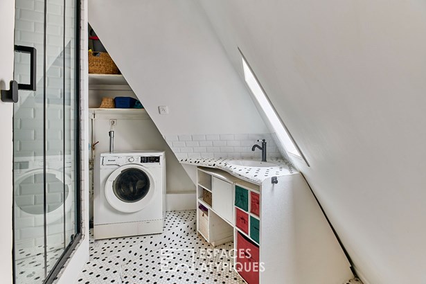 From the entrance hall, there is also access to a comfortable bedroom overlooking a courtyard, with storage space and a built-in bookcase. It has a shower room and a separate toilet.