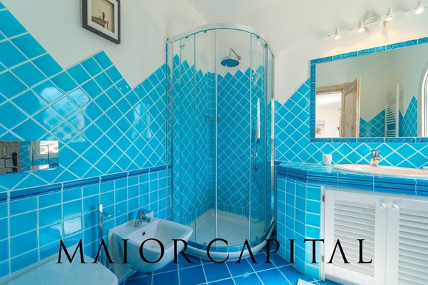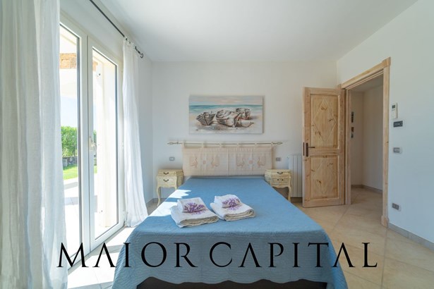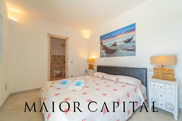 The villa is spread over two levels and offers spacious, bright interiors. The living area includes an open-plan living room with a fully equipped kitchen that opens onto a panoramic veranda. This space is perfect for outdoor lunches and dinners, enjoying the tranquility and Mediterranean scents that characterize the area.
