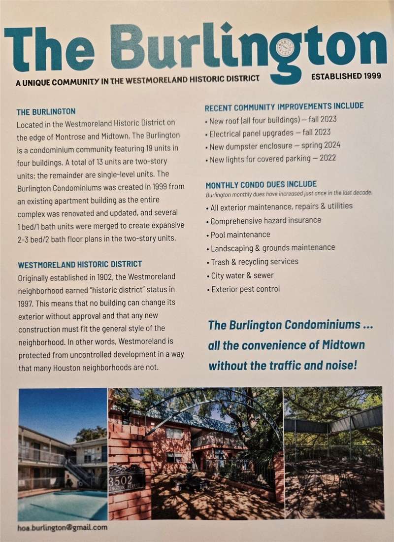 Welcome to The Burlington! This charming 3 bed, 2 bath condo in Westmoreland Historic District offers a gated front deck, community pool, private balcony, secure mailroom, and storage closet. With a new roof in 2023 and updated A/C, electrical panel, ceiling fans, and refrigerator, this property is move-in ready. Conveniently located near Downtown, Midtown, Med Center, Rice, freeways, Metrorail, and bus routes. Walk to Montrose shops and restaurants. Built in 1999 on a spacious 22839 sqft lot, 3502 Burlington is a gem waiting to be explored in Houston. NEW LOCAL PROPERTY MANAGEMENT coming to the Burlington May 2025!