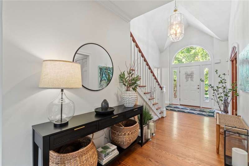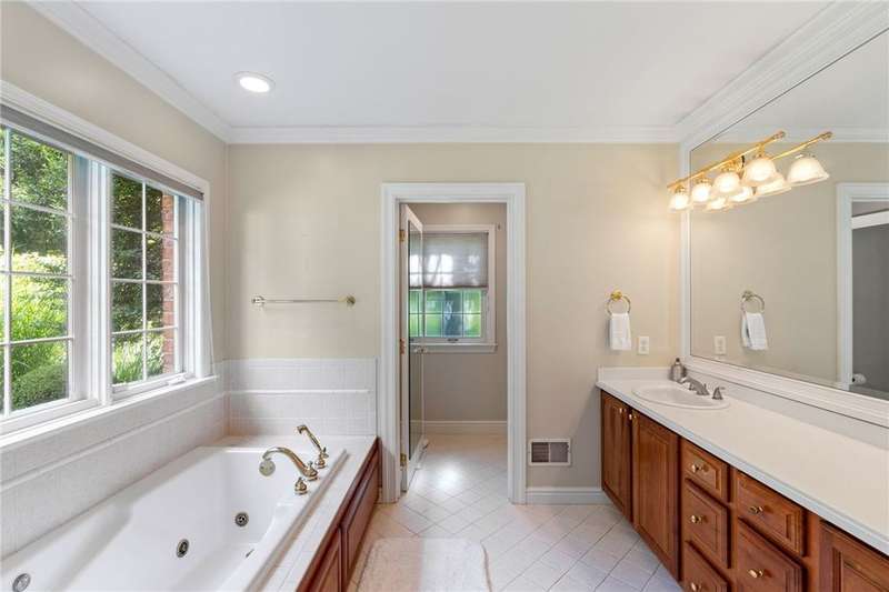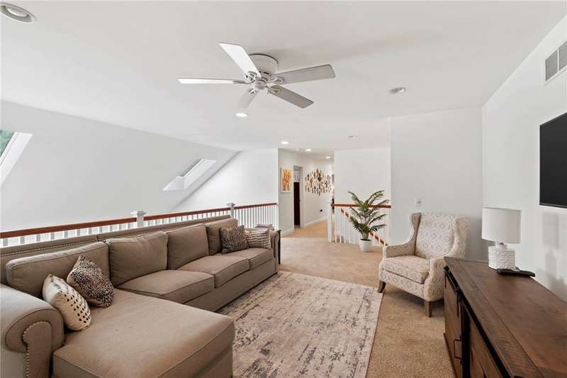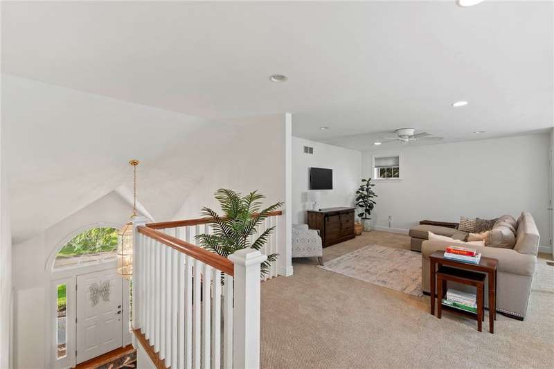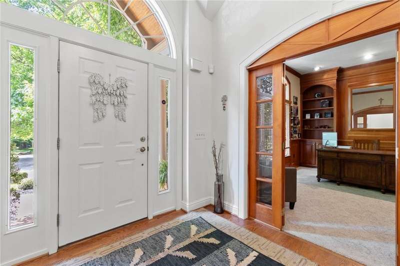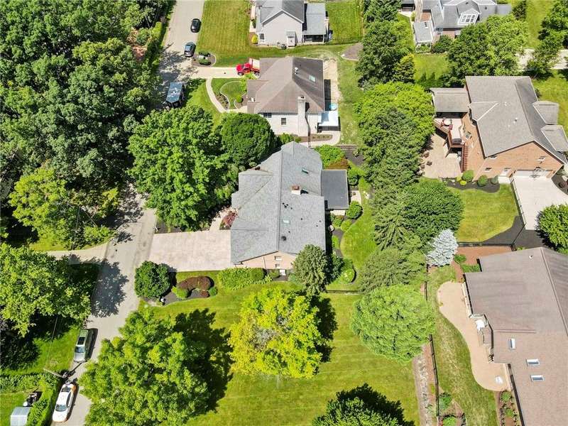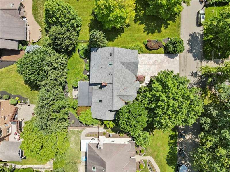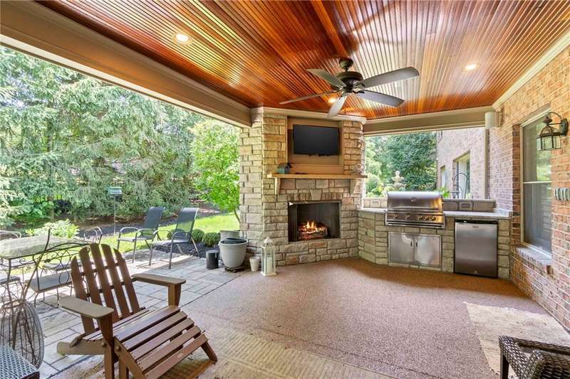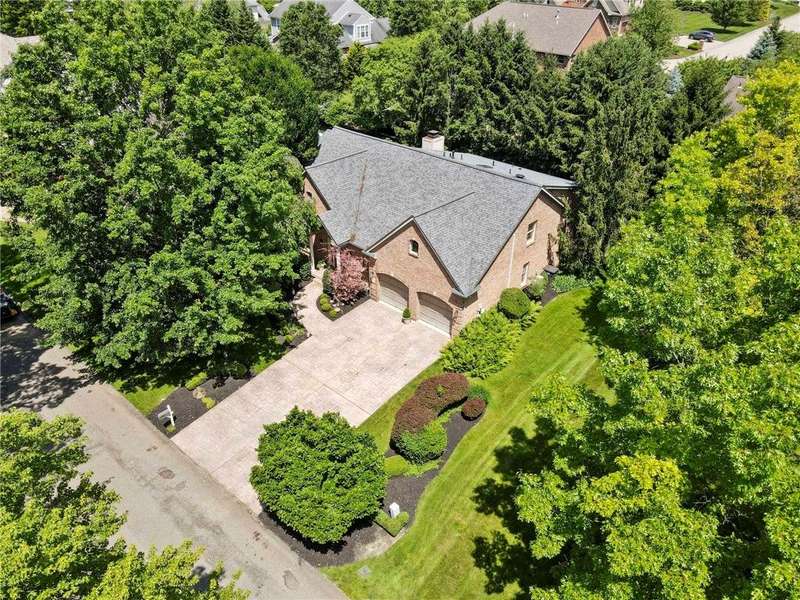 In the highly sought-after Summit of Oakmont, 4 bedroom brick French Provincial home offers timeless elegance. Stamped concrete driveway leads to the entry & rich hardwood floors flow to a stunning open great room with soaring ceilings & an airy loft-style family room above. Den is a standout, ideal for remote work, w/ classic wood paneling, French doors, large windows & custom built-ins. Equipped with stainless steel appliances, the kitchen is well designed, peninsula counter & bright morning room for casual meals. Dining room & living room create perfect flow for entertaining. Coveted 1st floor primary, with jetted tub, shower, dual vanities, & walk-in closet. 1st flr. laundry=convenience. From the great room to a covered patio oasis, you'll enjoy outdoor living with a stone gas fireplace, TV & outdoor kitchen surrounded by professionally landscaped & fenced back yard. Upstairs an open family room, 3 bedrooms & full bath. Lower level is finished with a full bath & plenty of storage.