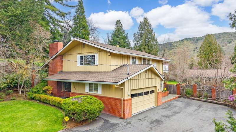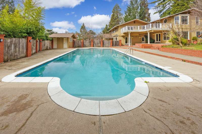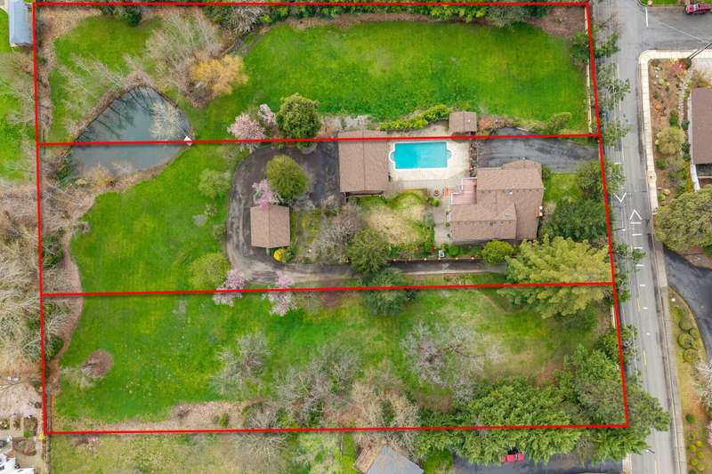 This is a rare chance to acquire a private two-acre estate, complete with a custom residence, attached garage, and a spacious detached shop/garage. The property includes two one-acre tax lots with versatile R-1-6 zoning, while the third adjoining one-acre parcel is offered separately on the MLS. Bring your builder and imagine the possibilities. The 3,951 sq. ft. home showcases vaulted ceilings, custom oak cabinetry with pull-outs, tile countertops, and a Sub-Zero refrigerator. The primary suite offers a mini-split system, soaking tub, walk-in shower, dual vanities, and French doors opening to a private deck. An attached two-car garage is complemented by a detached three-car garage with a full bath and hobby space. The landscaped grounds create a park-like retreat with a heated in-ground pool, poolside changing room, built-in gas fire pit, water rights, and gated side access. Offering privacy, space, and future opportunity in a serene setting, this estate is truly one-of-a-kind.