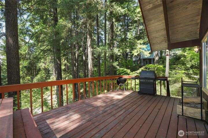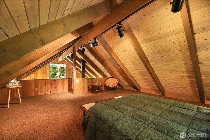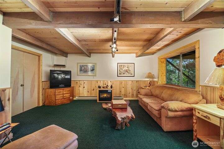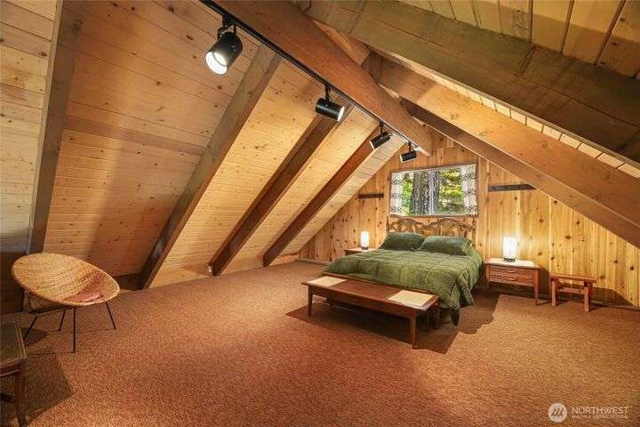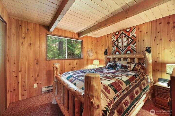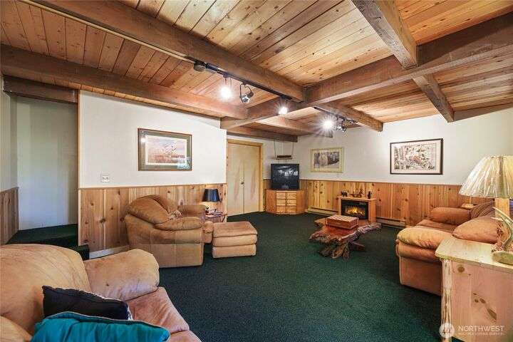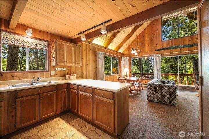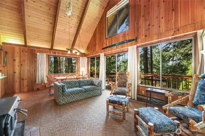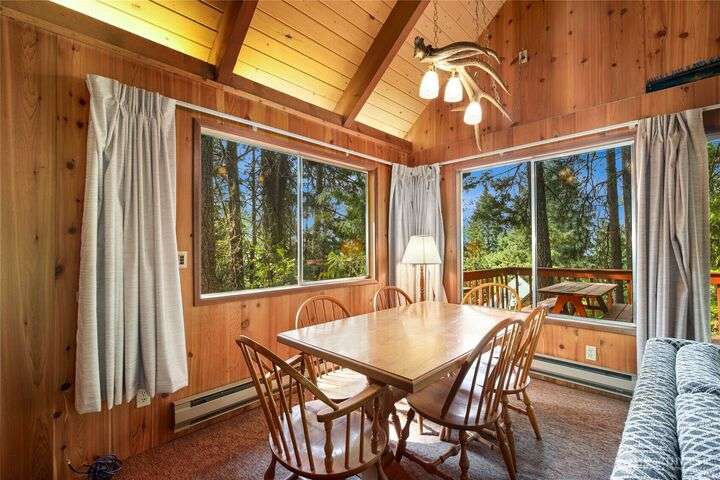 Discover the perfect blend of comfort and character in this inviting 2-bedroom, 1.5-bath home nestled in the desirable Pine Lock Sun community. Step inside to a spacious great room featuring vaulted ceilings, exposed beams, and a cozy wood stove—perfect for relaxing after a day outdoors. A versatile loft overlooks the main living space, offering a bedroom/sleeping space with room for multiple beds/guest or create a private primary.Enjoy the outdoors year-round with a large deck ideal for entertaining or taking in the surrounding natural beauty. The lower level includes a second living area—perfect as a media room, den, or guest space—as well as a large shop area in the basement for hobbies, storage, or your next creative project.